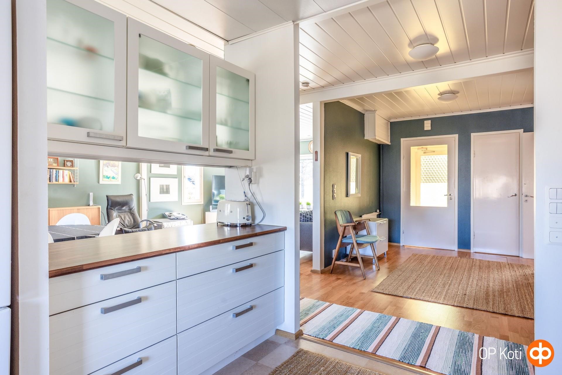 Keittiö ja ruokailutila sekä olohuone ovat yhtenäinen harmoninen tilakokonaisuus. Makuuhuoneita on kolme, joista yhdessä on kevyttakka. Lisäksi on kodinhoitotila, pukuhuone, pesuhuone ja ikkunallinen sauna sekä kaksi WC:tä. Kodinhoitotila, saunaosasto ja yksi makuuhuone sekä toinen WC ovat yhden rapun verran alempana muuta tilaa.