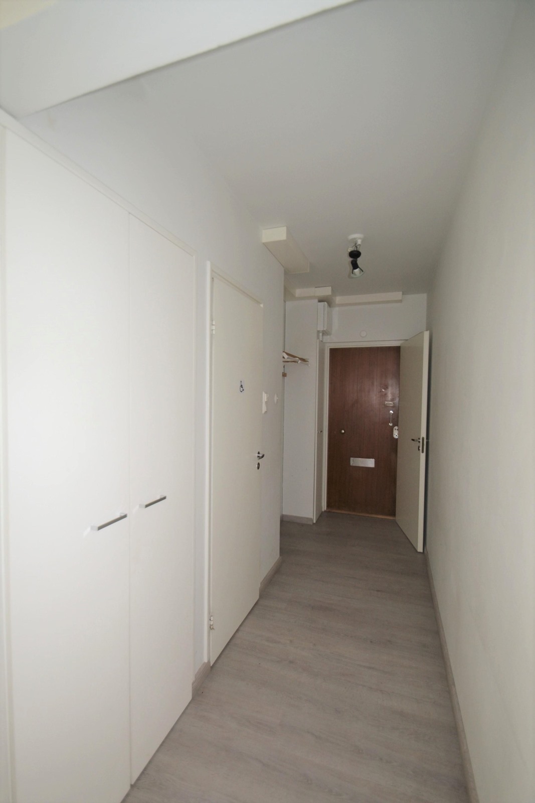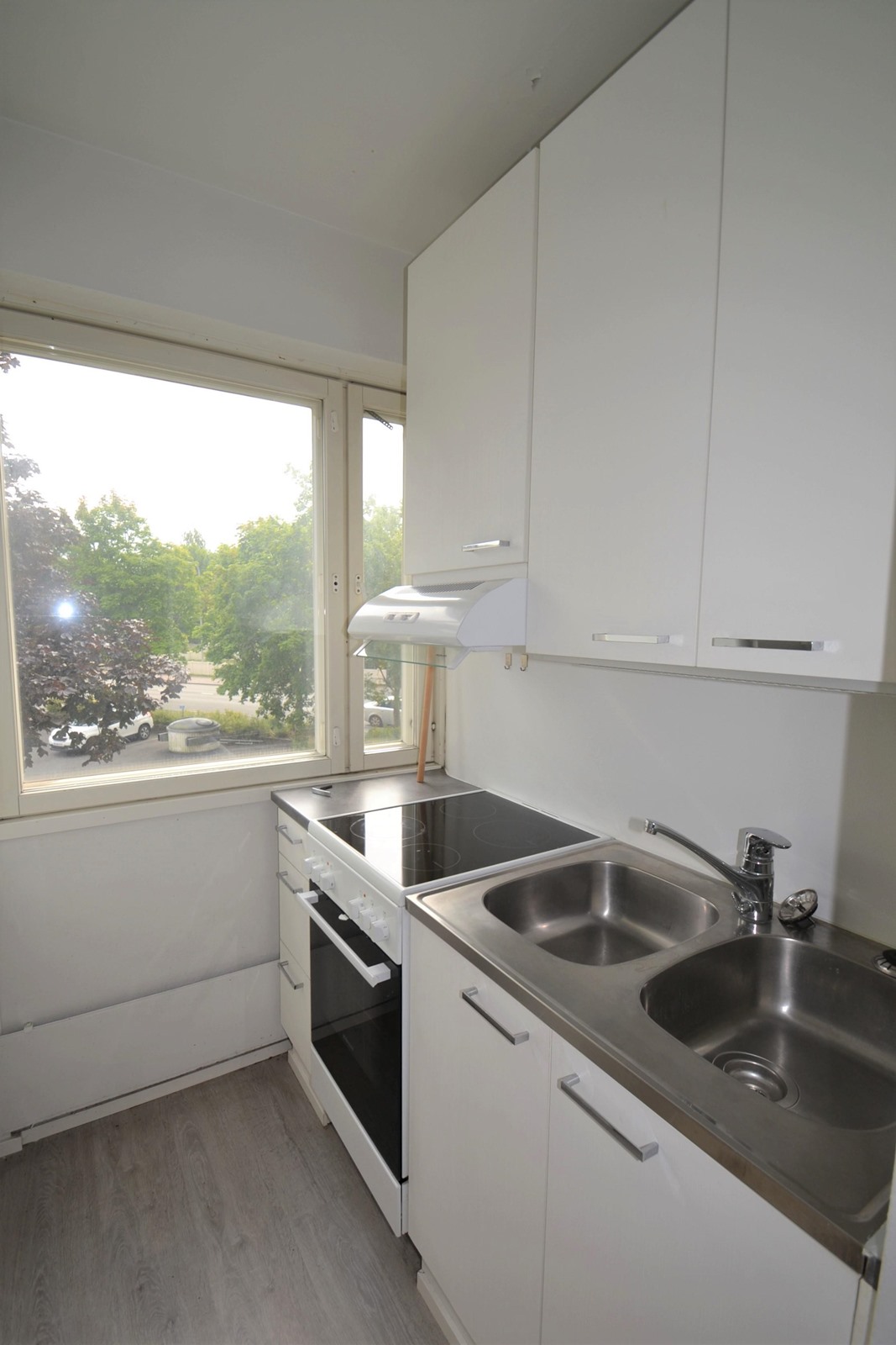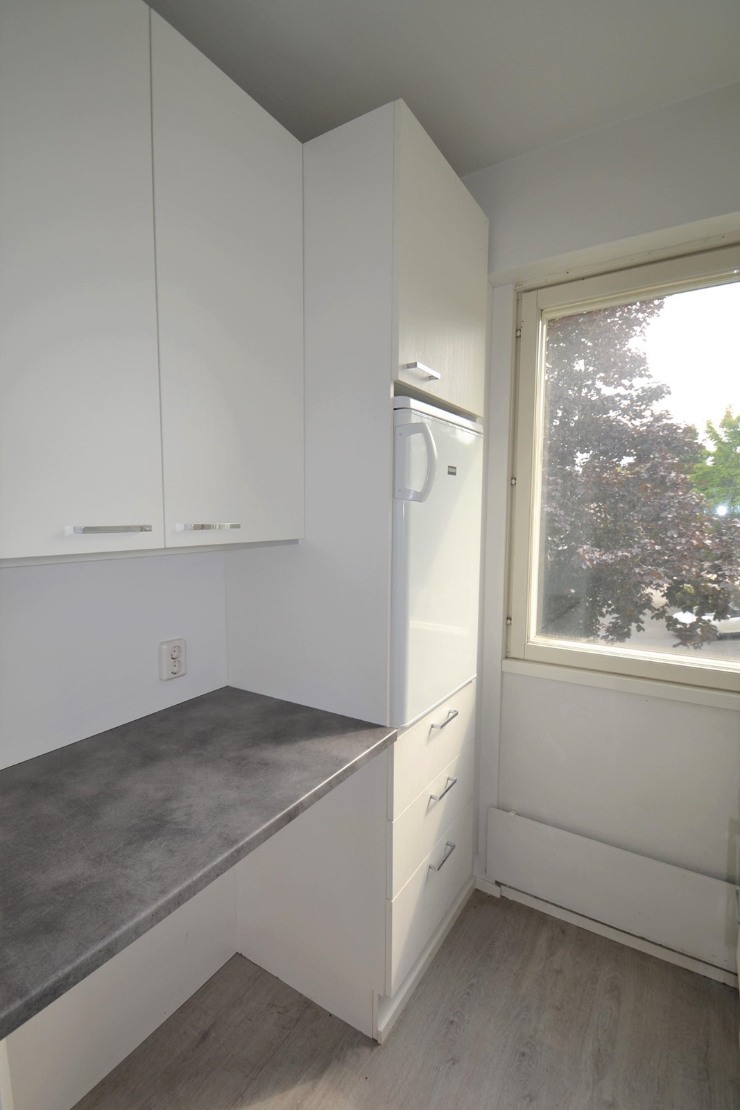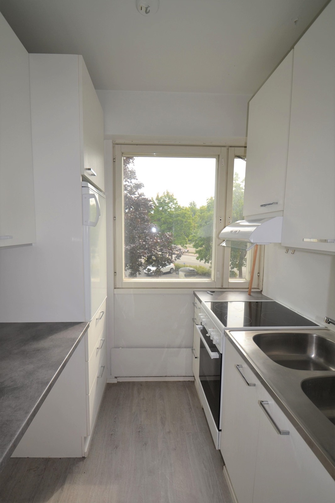 Keittokomeron valkoiset kaapistot tarjoavat säilytystilaa molemmilla seinillä, jonka lisäksi eteisestä löytyy kaappitilaa.