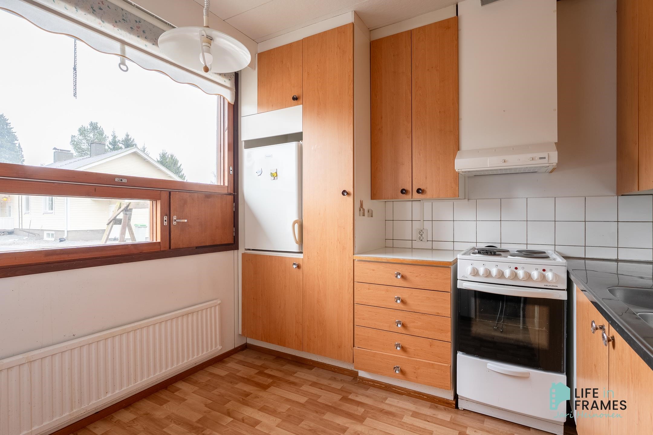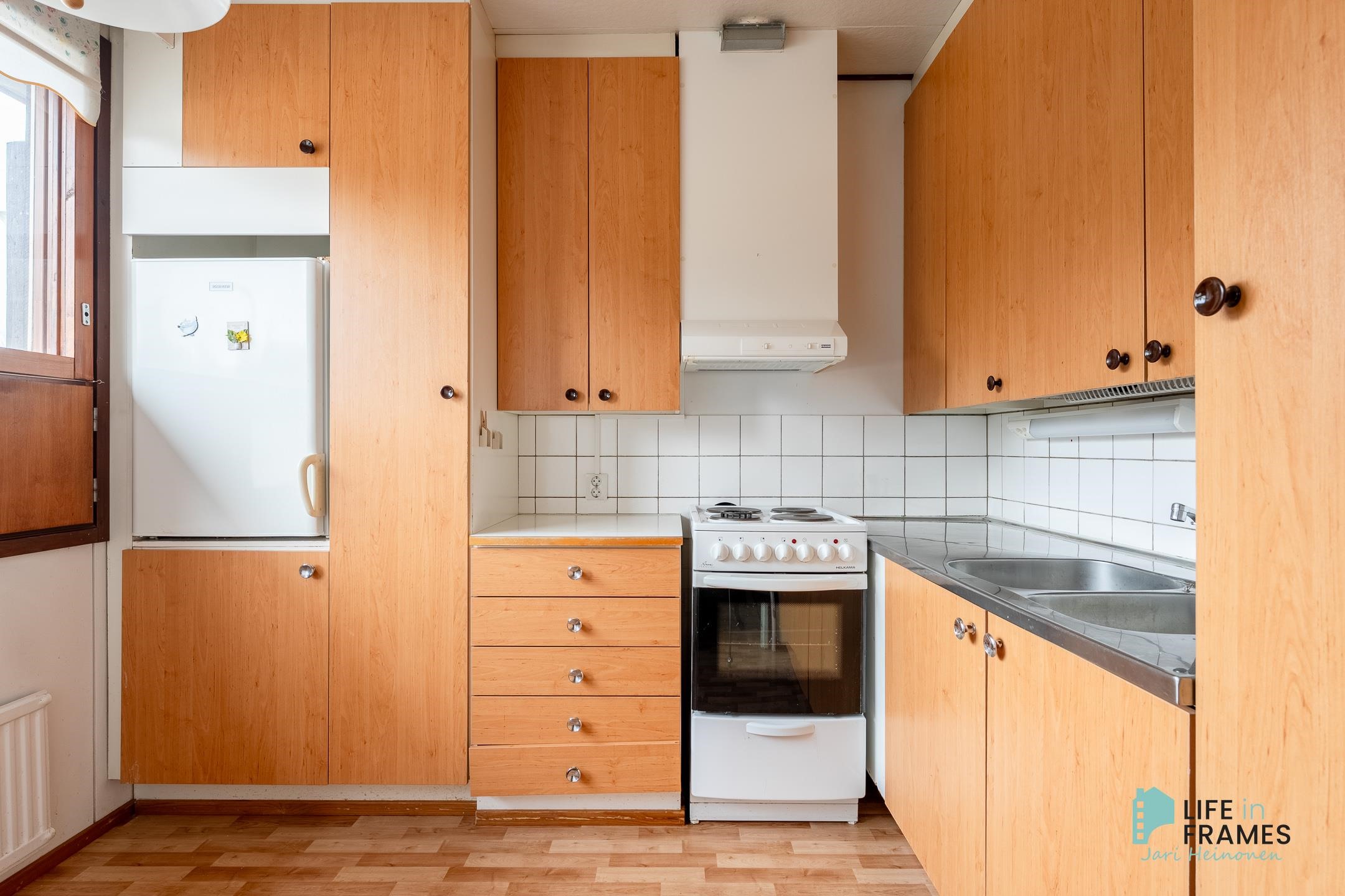- Jääkaappi, pakastekaappi, lattialiesi, sähköliesi, liesikupu, kaapistot, kiinteät valaisimet.