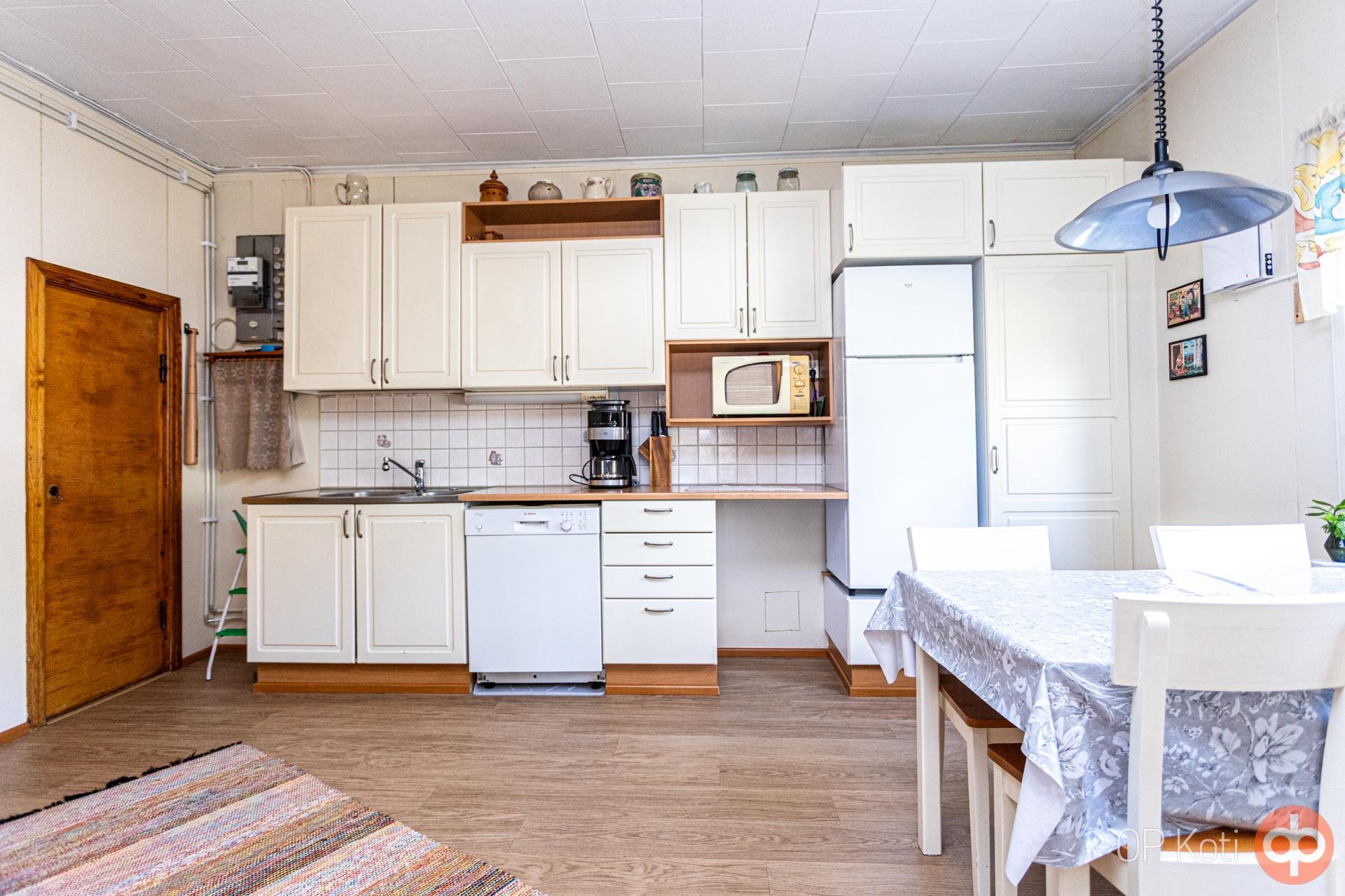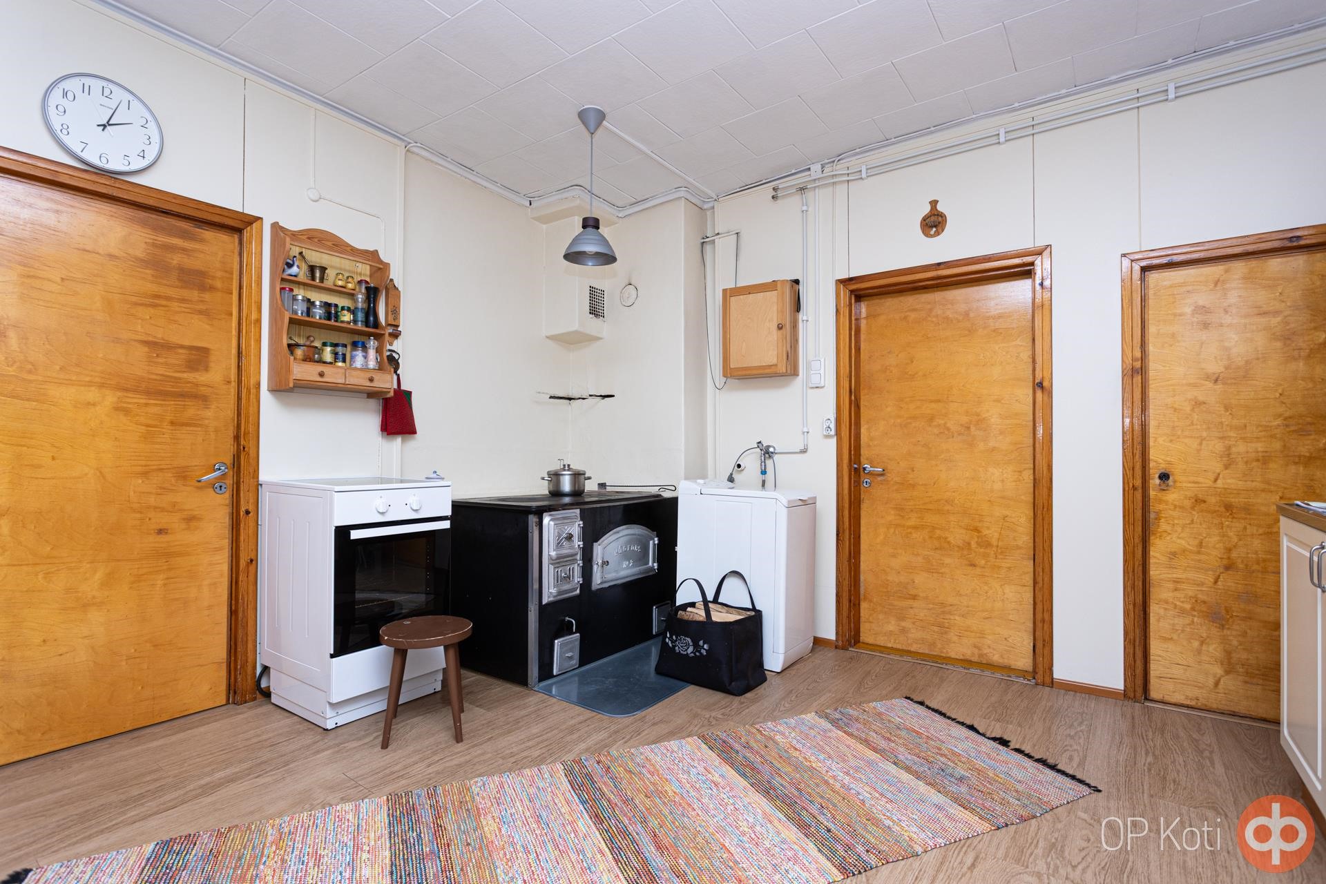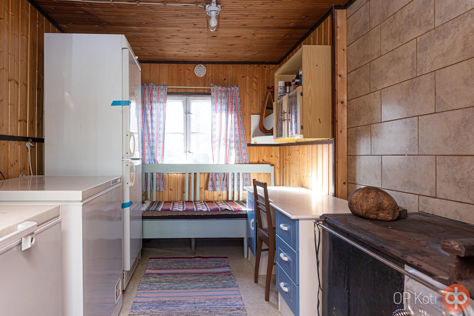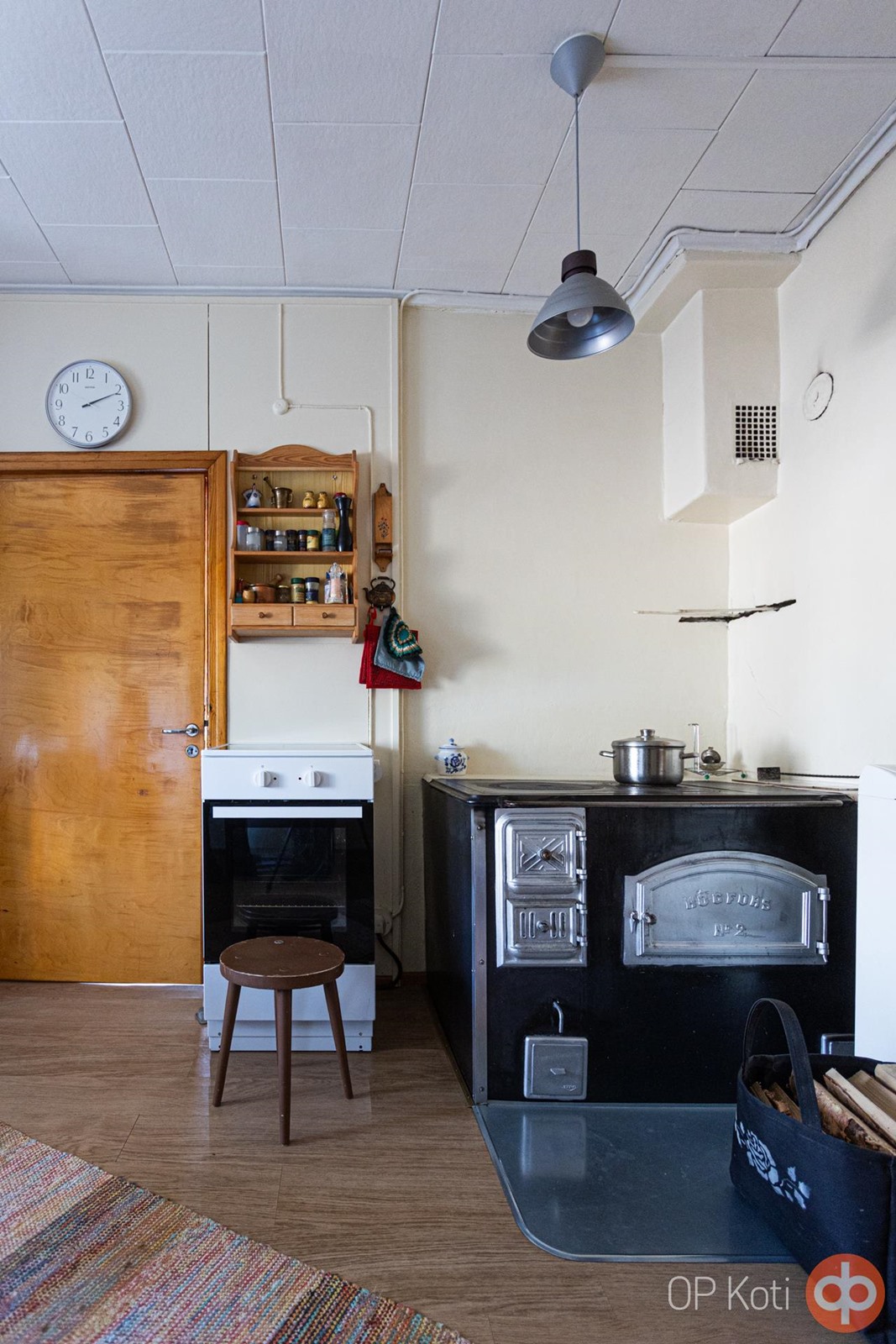 - Jenkkikaappi, induktioliesi, astianpesukone, kiinteät valaisimet. Puulämmiteinen hella, jossa leivinuuni