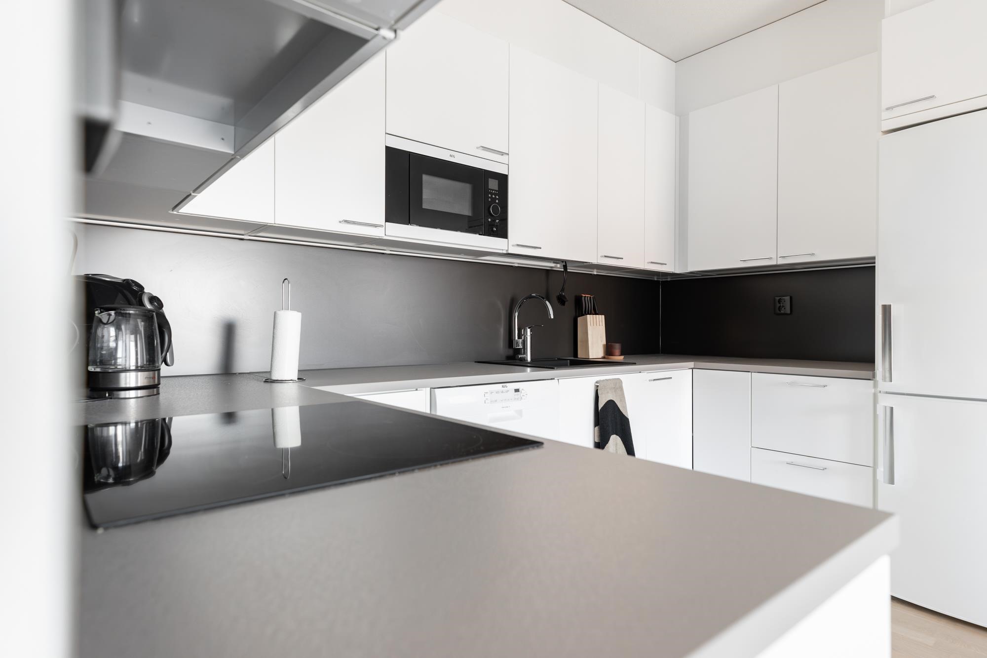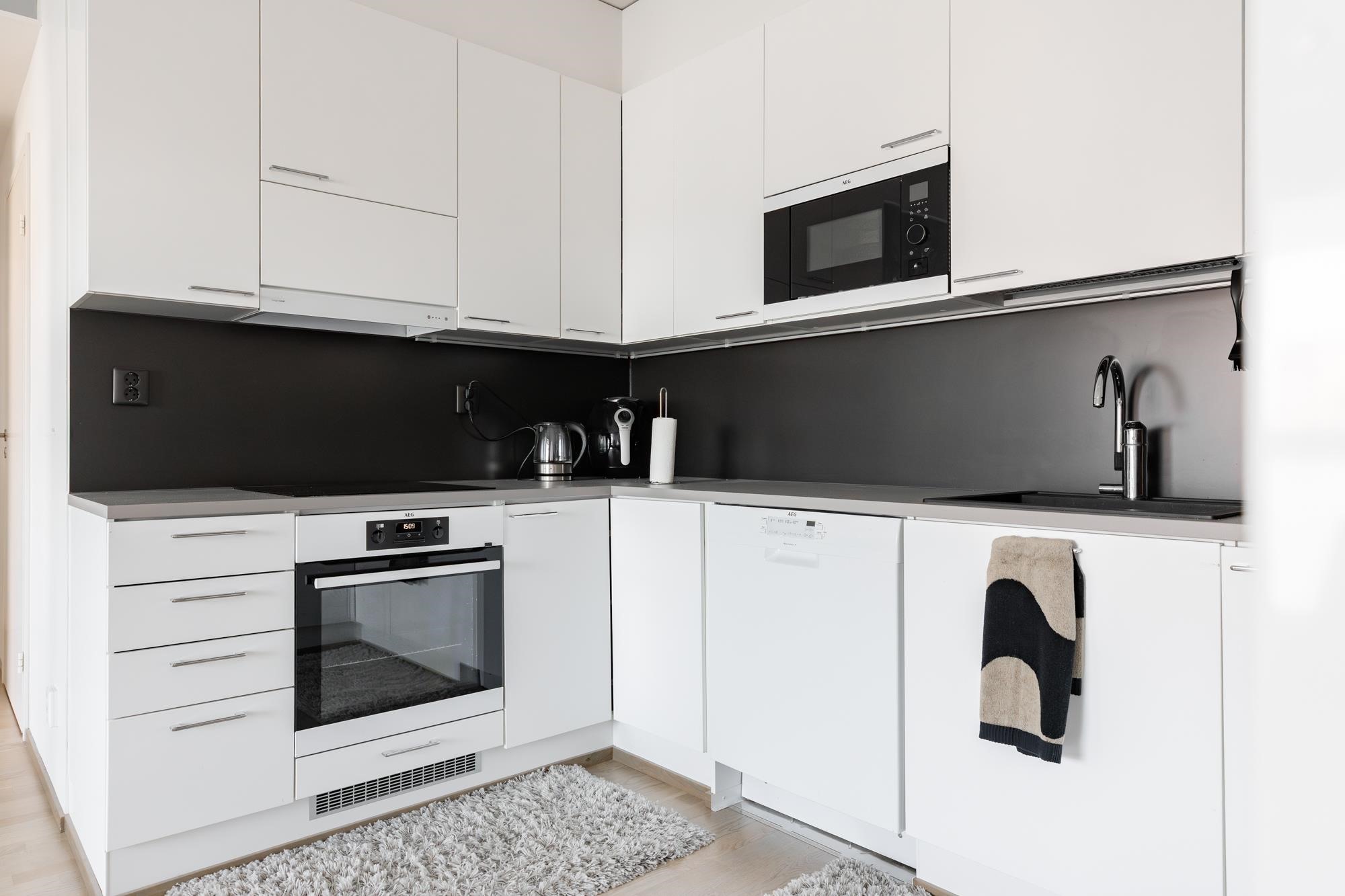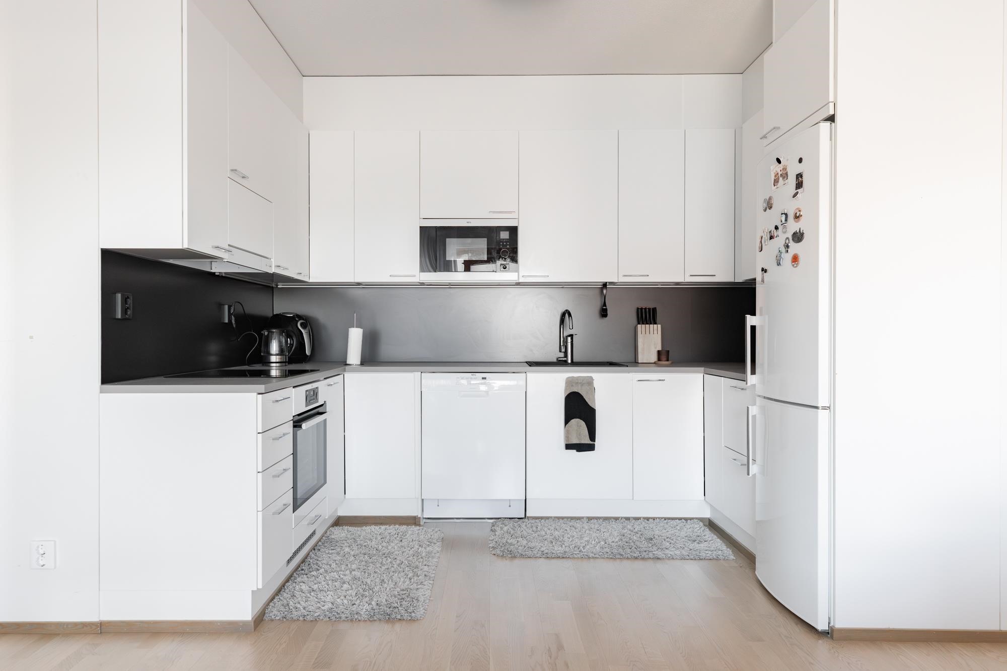 - Jääkaappipakastin, erillisuuni, induktioliesi, liesituuletin, mikroaaltouuni Integroitu, astianpesukone, kaapistot, kiinteät valaisimet.
