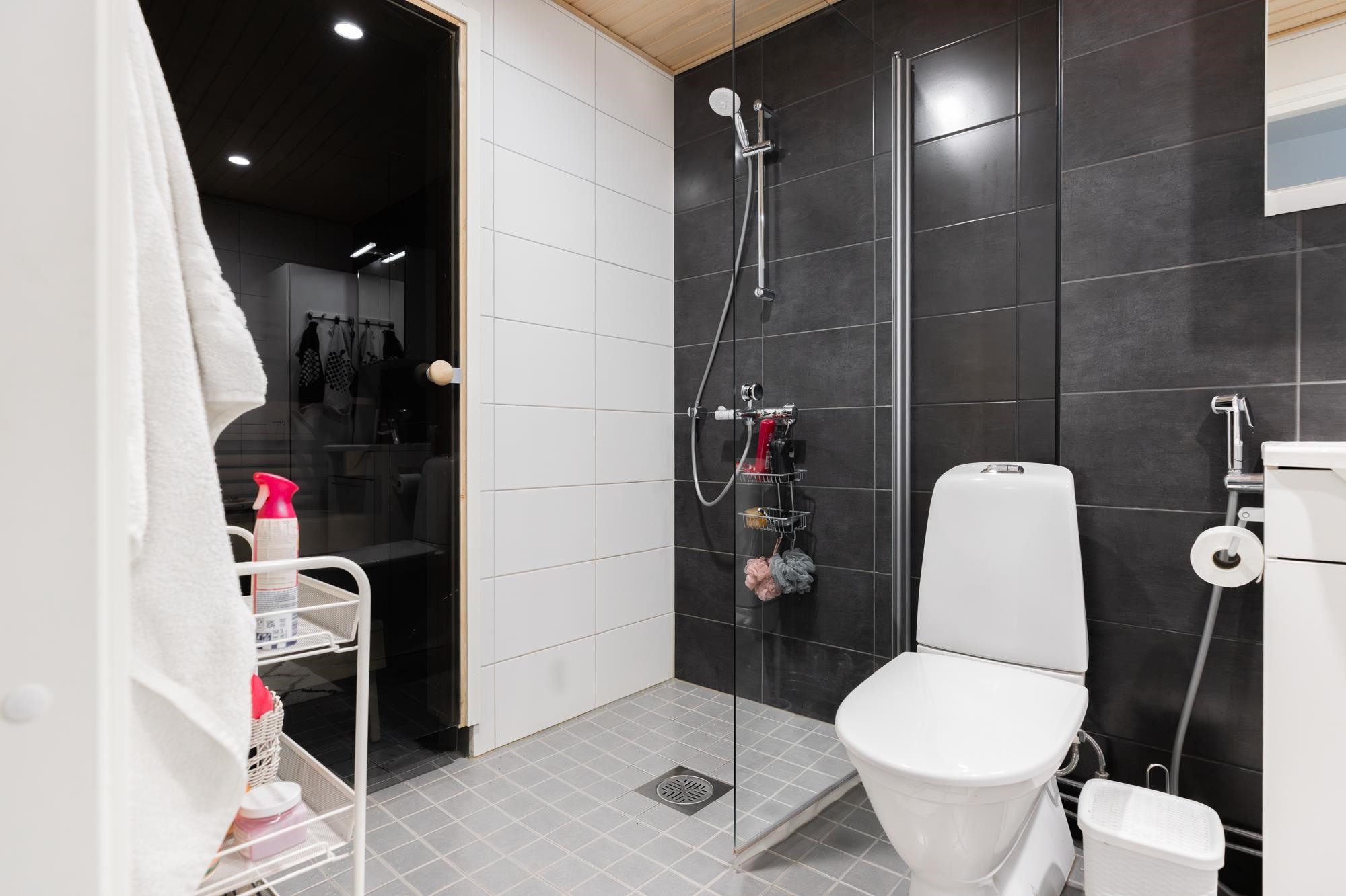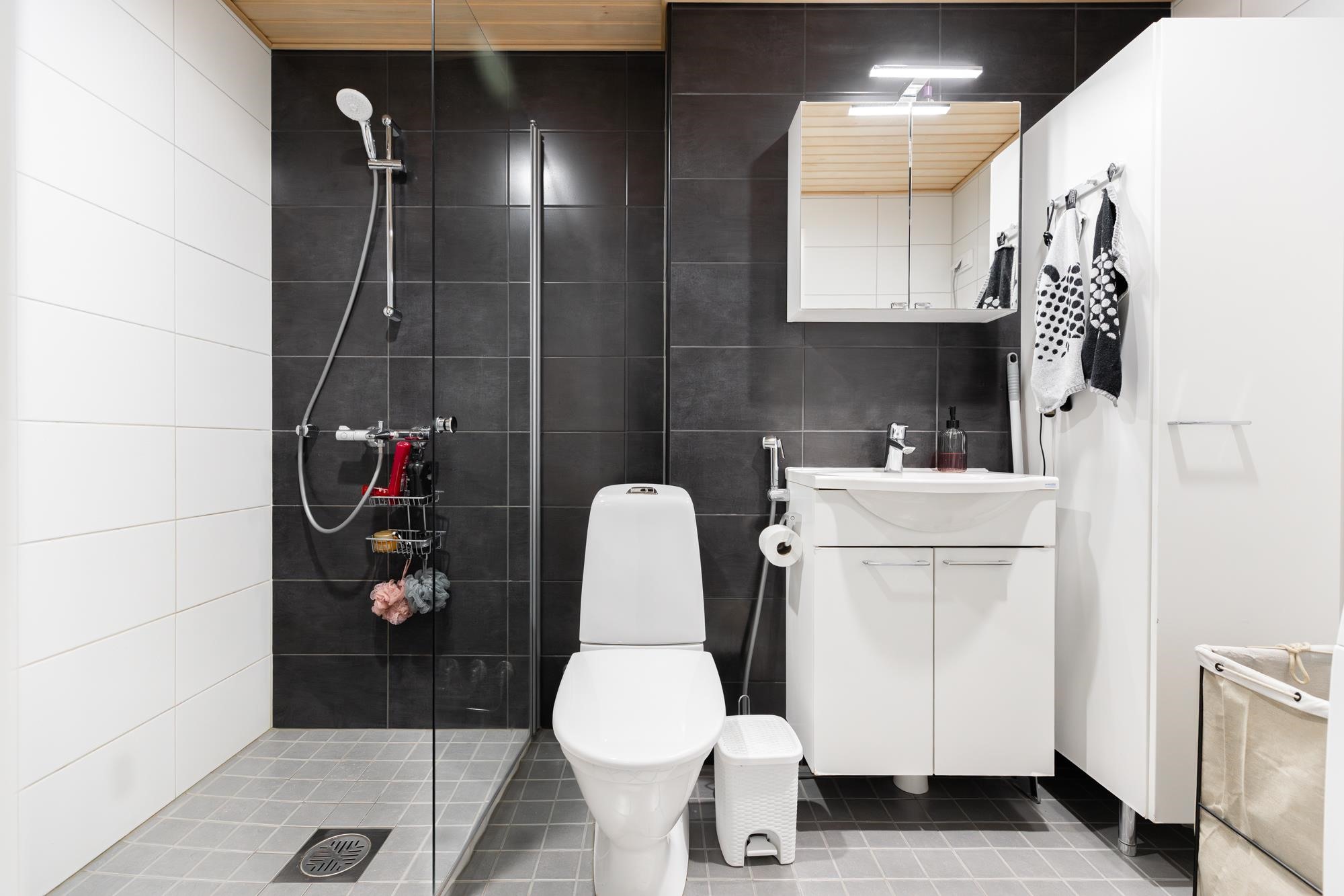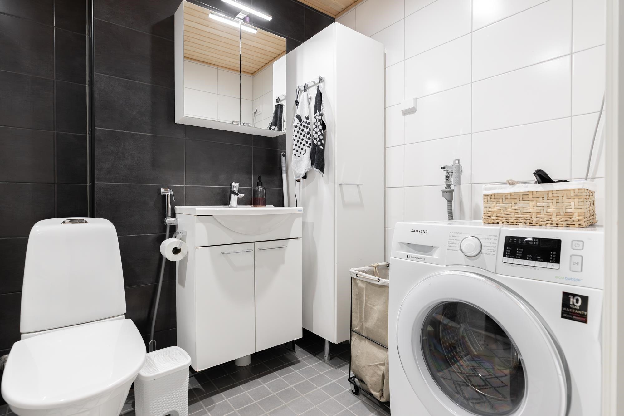 - Sauna, sähkökiuas, kylpyhuone, suihku, suihkuseinä, peilikaappi, kaapit, allaskaappi, pesukoneliitäntä, lattialämmitys, kiinteät valaisimet.