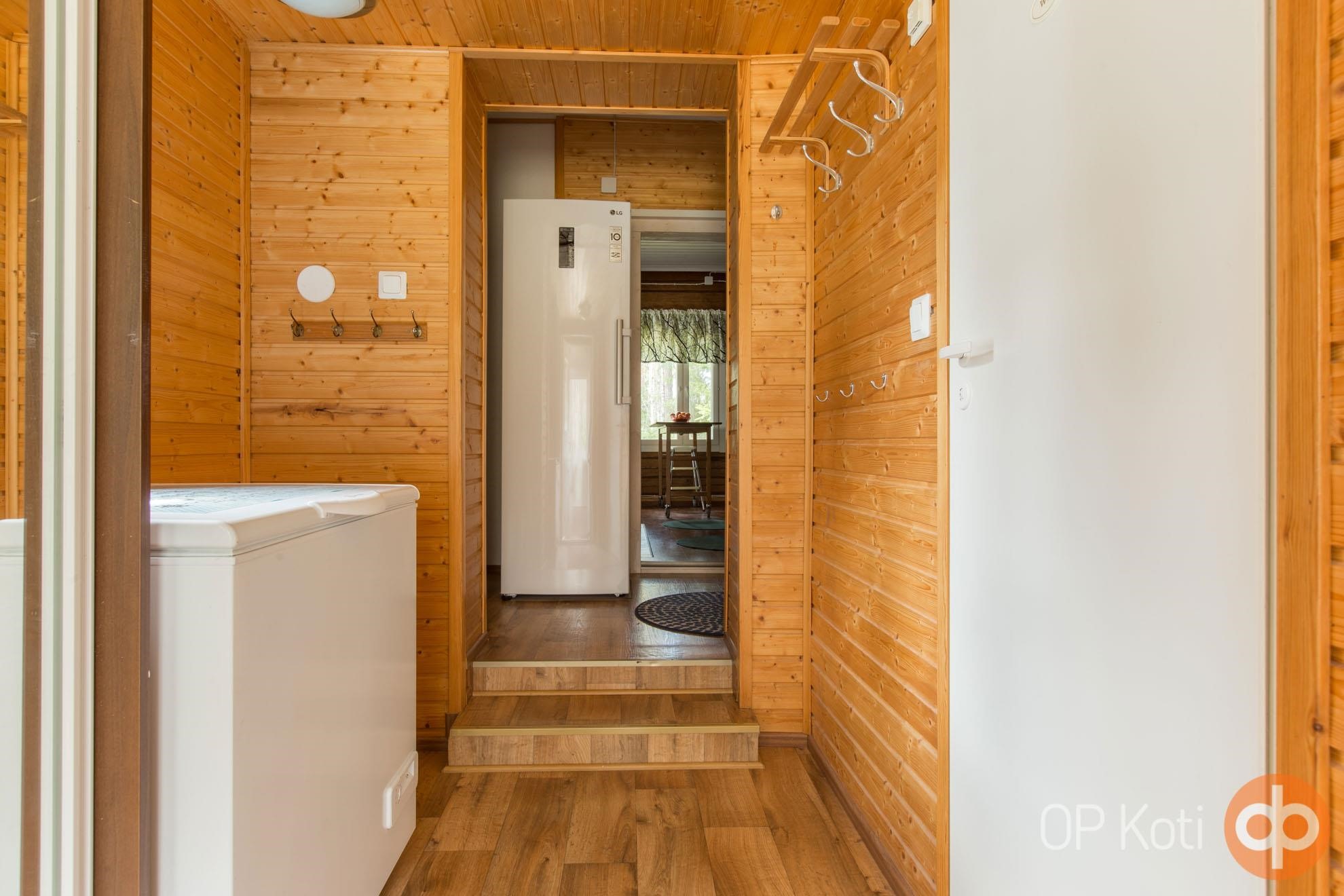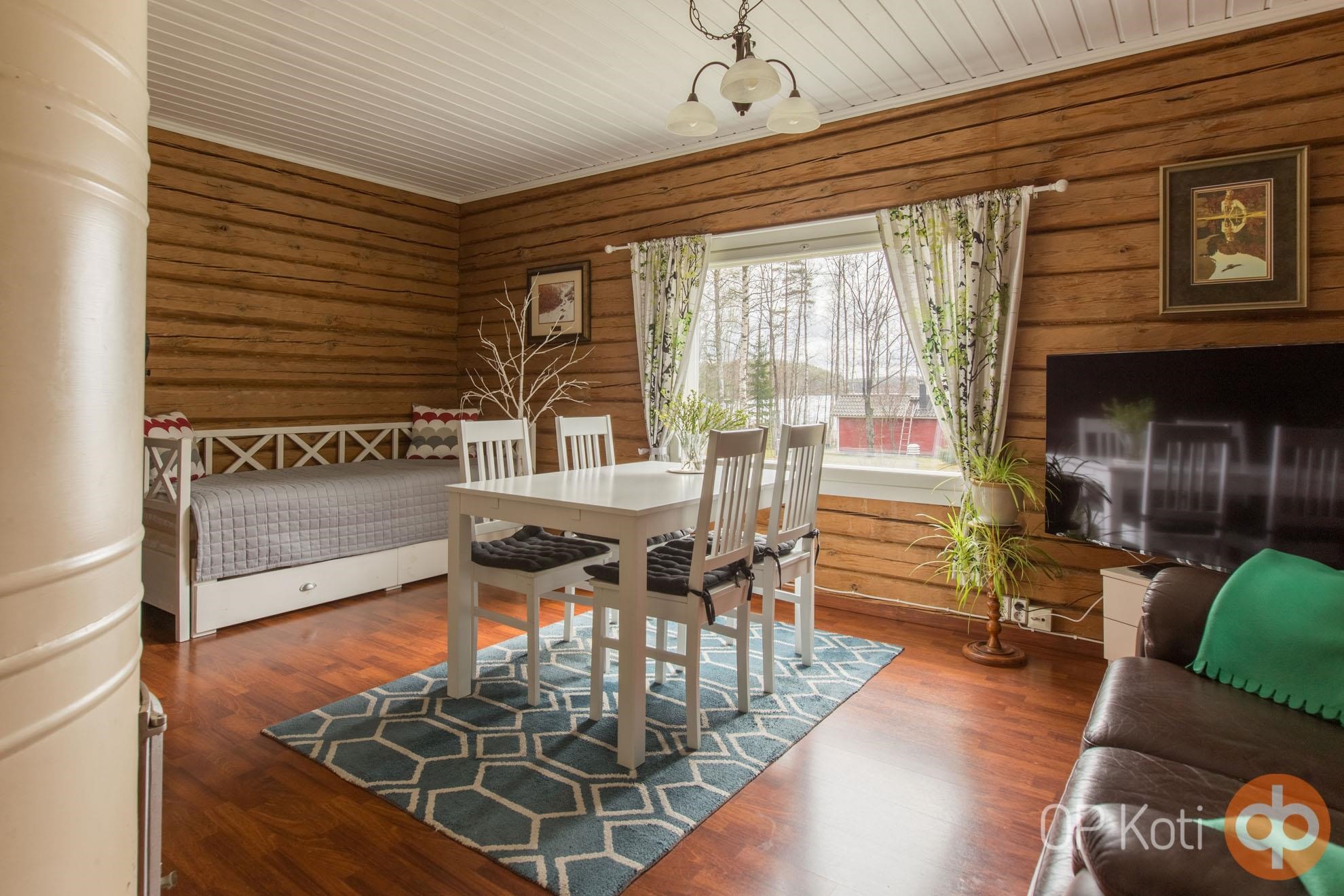 Keittiö: lattia:laminaatti, seinät:hirsi. Olohuone: lattia:laminaatti, seinät:hirsi. Makuuhuone 1: lattia:laminaatti, seinät: maalattu / puolipaneeli. Kylpyhuone: lattia:laatta, seinät:laatta. Eteinen: lattia:laminaatti, seinät:hirsi. Huone (josta kulku päämakuuhuoneesen): Lattia: laminaatti, seinät: maalattu / puolipaneeli. Yläkerran huoneet: lattia: vinyylilankku, seinät:puupaneeli.