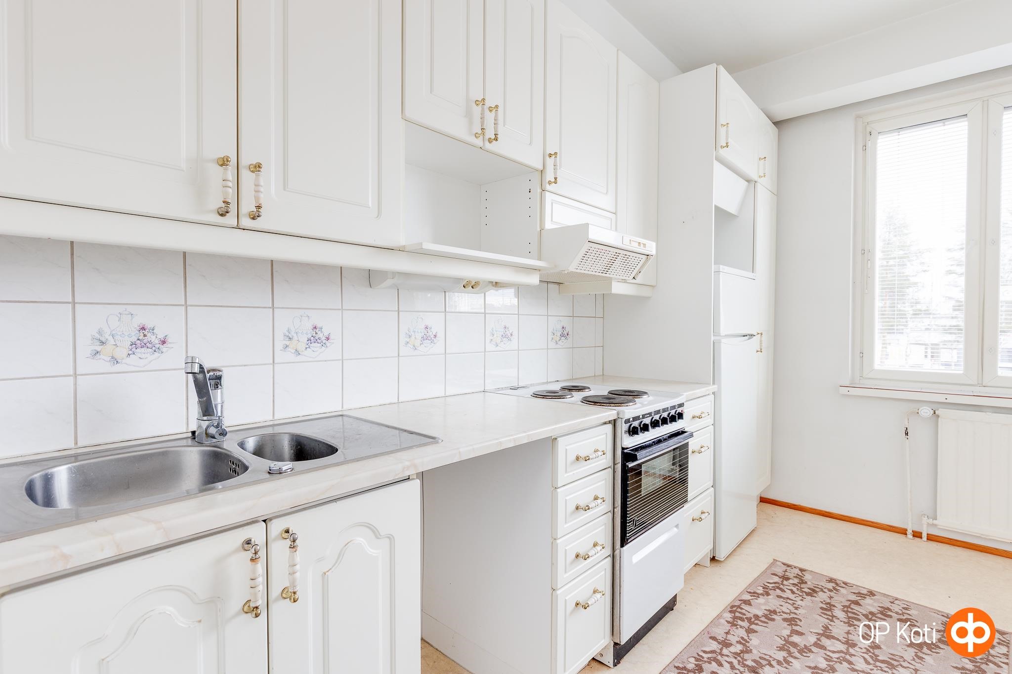 - Jääkaappipakastin, sähköliesi, liesituuletin, kaapistot, kiinteät valaisimet.