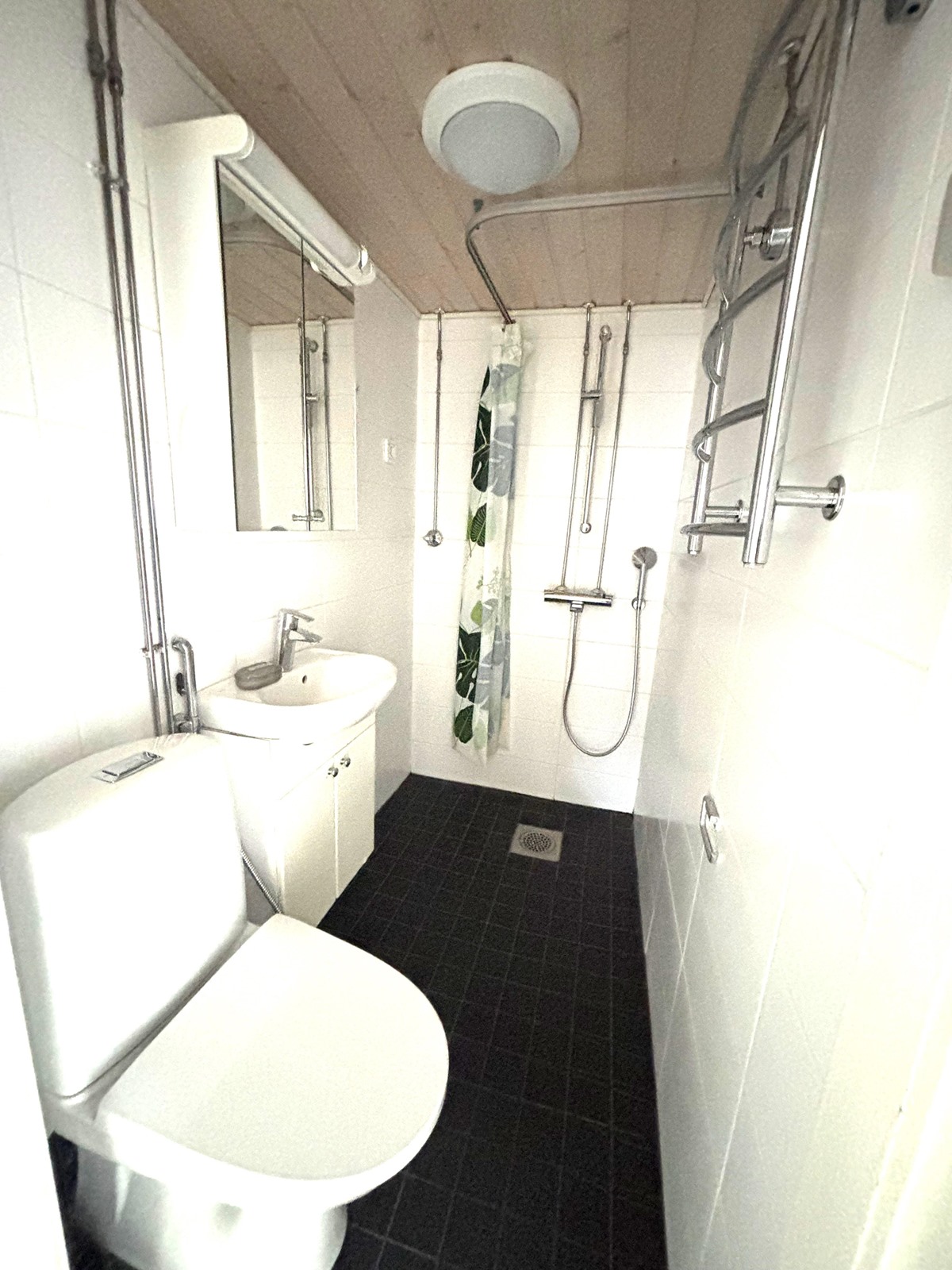 - Suihku, peilikaappi, allaskaappi, pesukoneliitäntä, lattialämmitys.