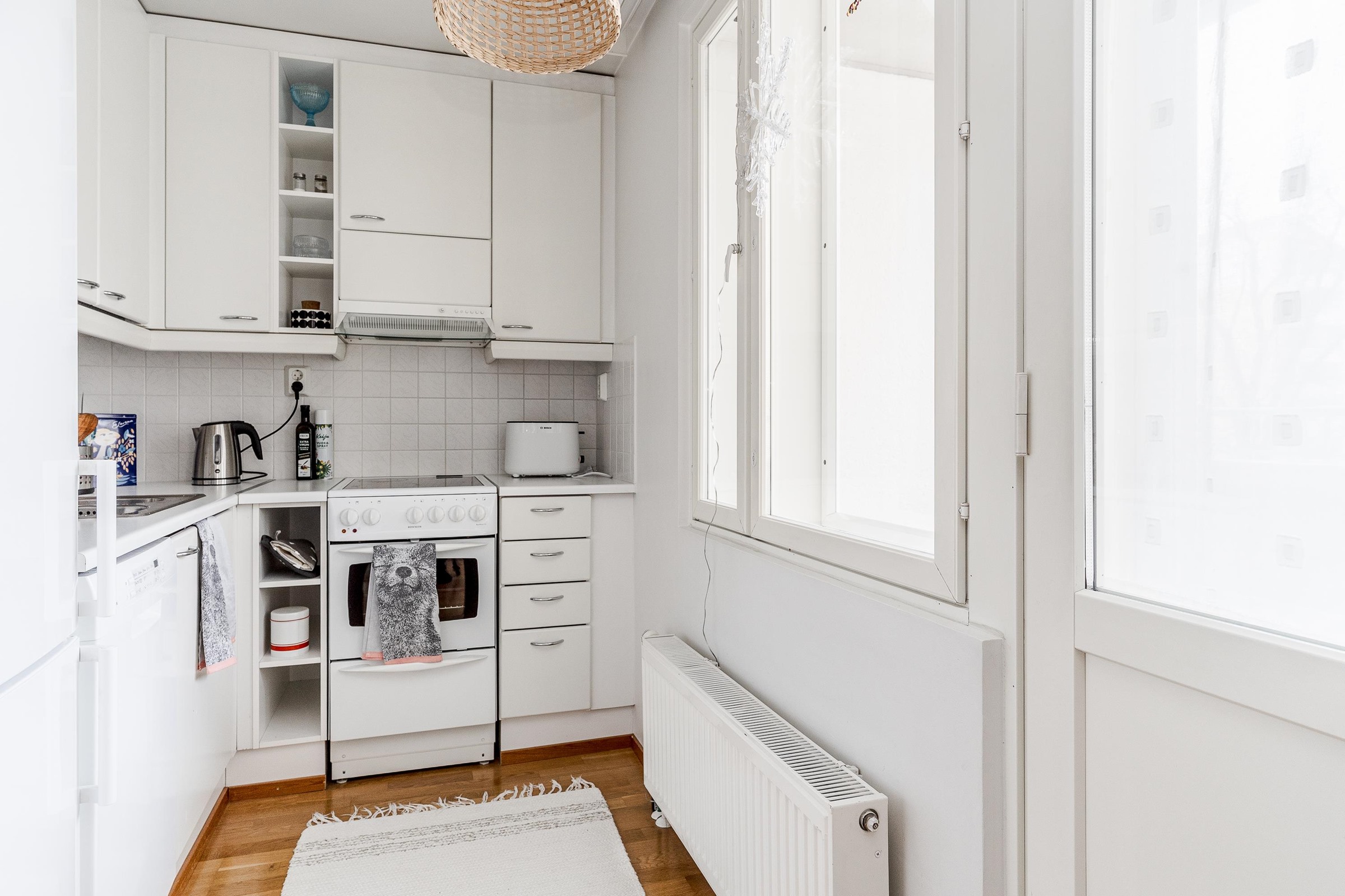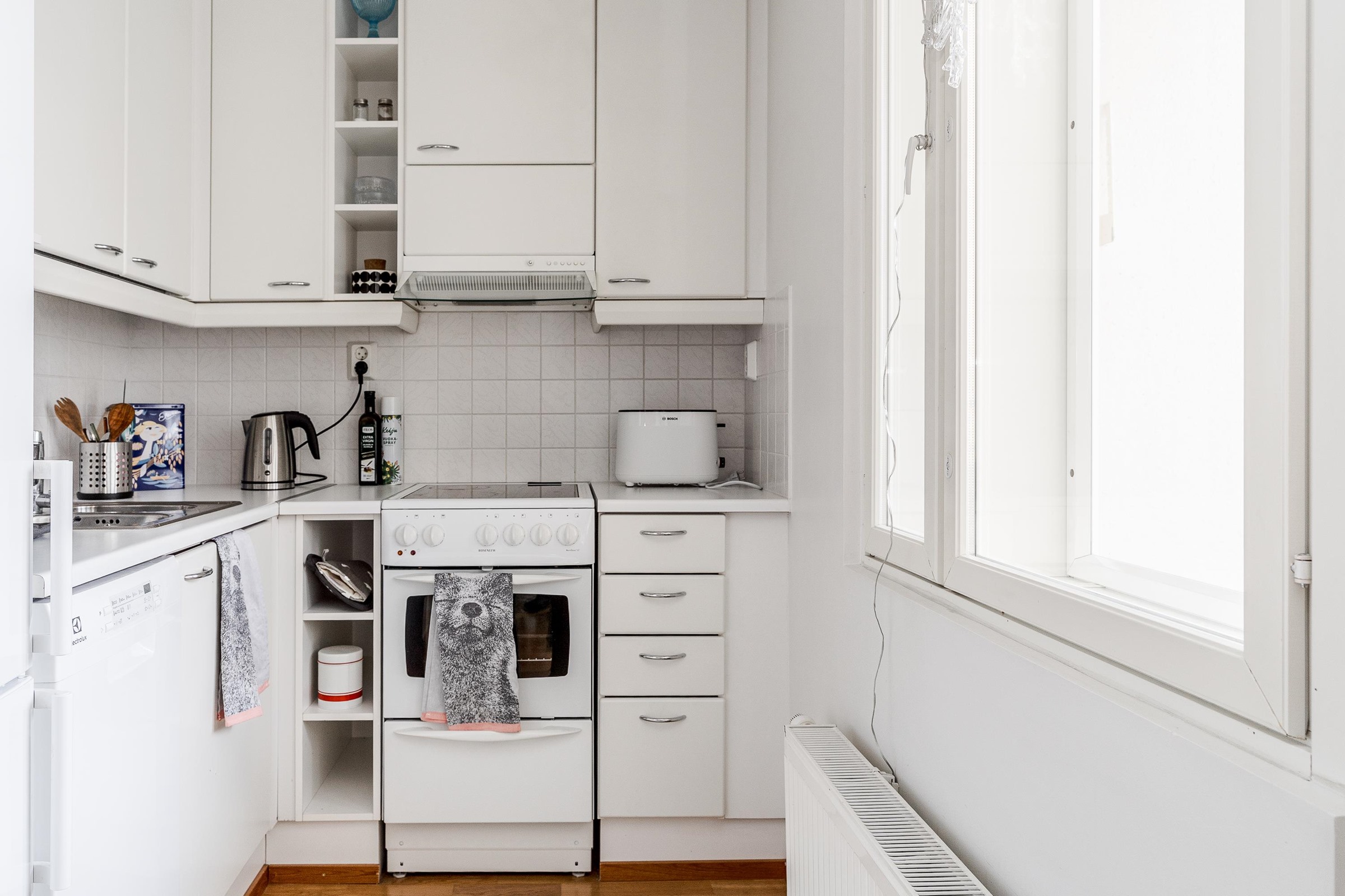 - Jääkaappipakastin, keraaminen liesi, liesituuletin, astianpesukone, kaapistot, kiinteät valaisimet.