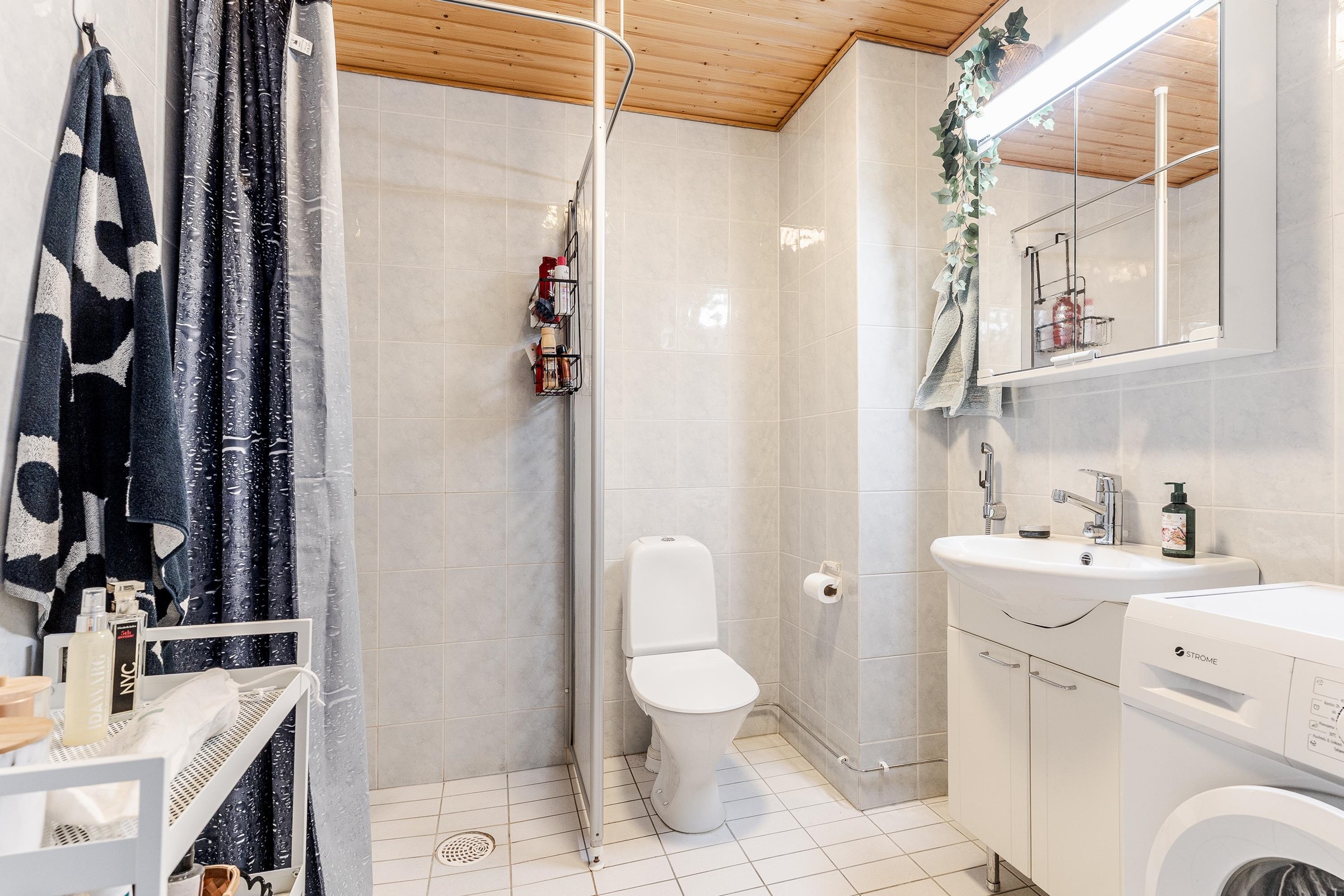 - Kylpyhuone, suihku, suihkuseinä, peilikaappi, pesukoneliitäntä, lattialämmitys, kiinteät valaisimet.
