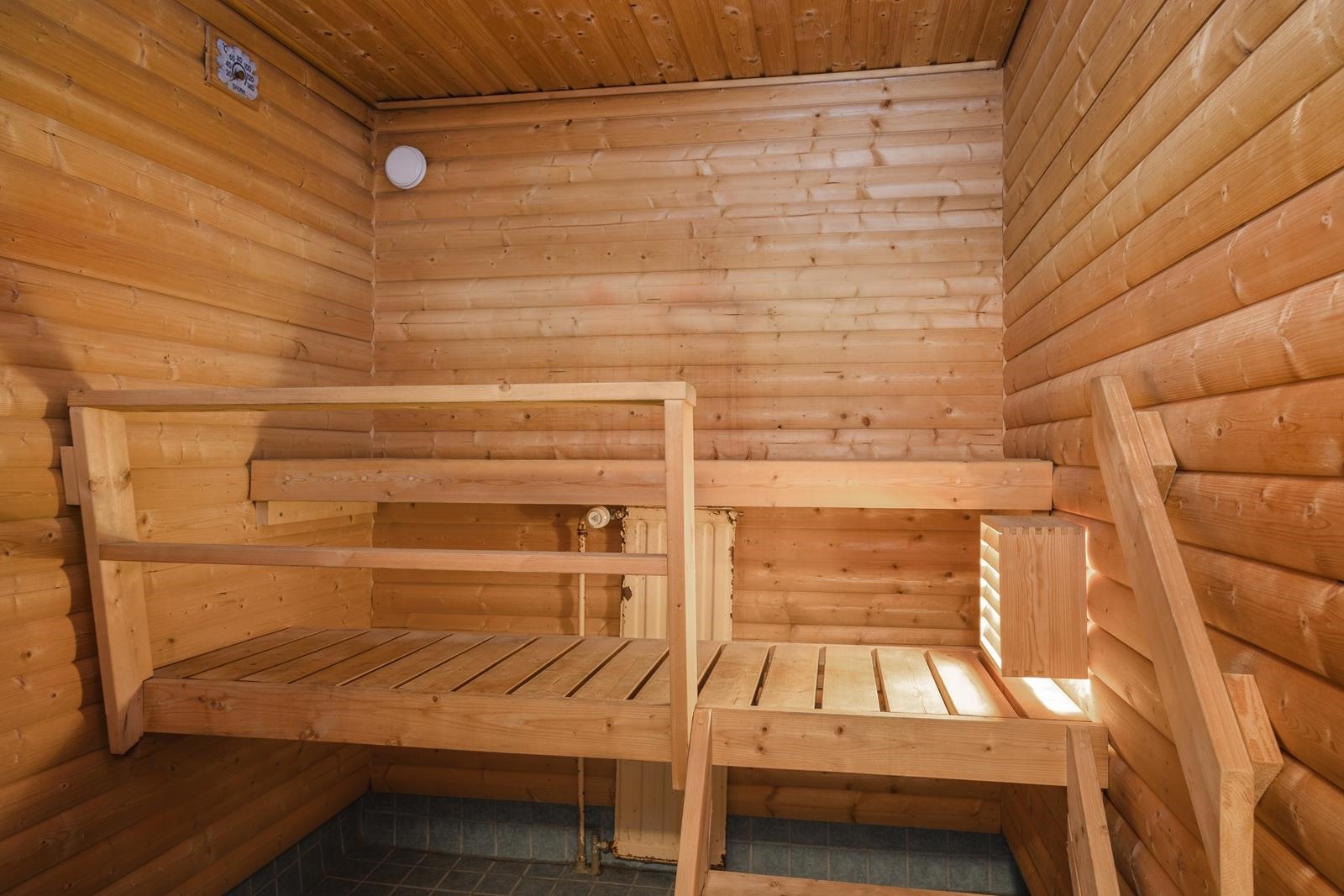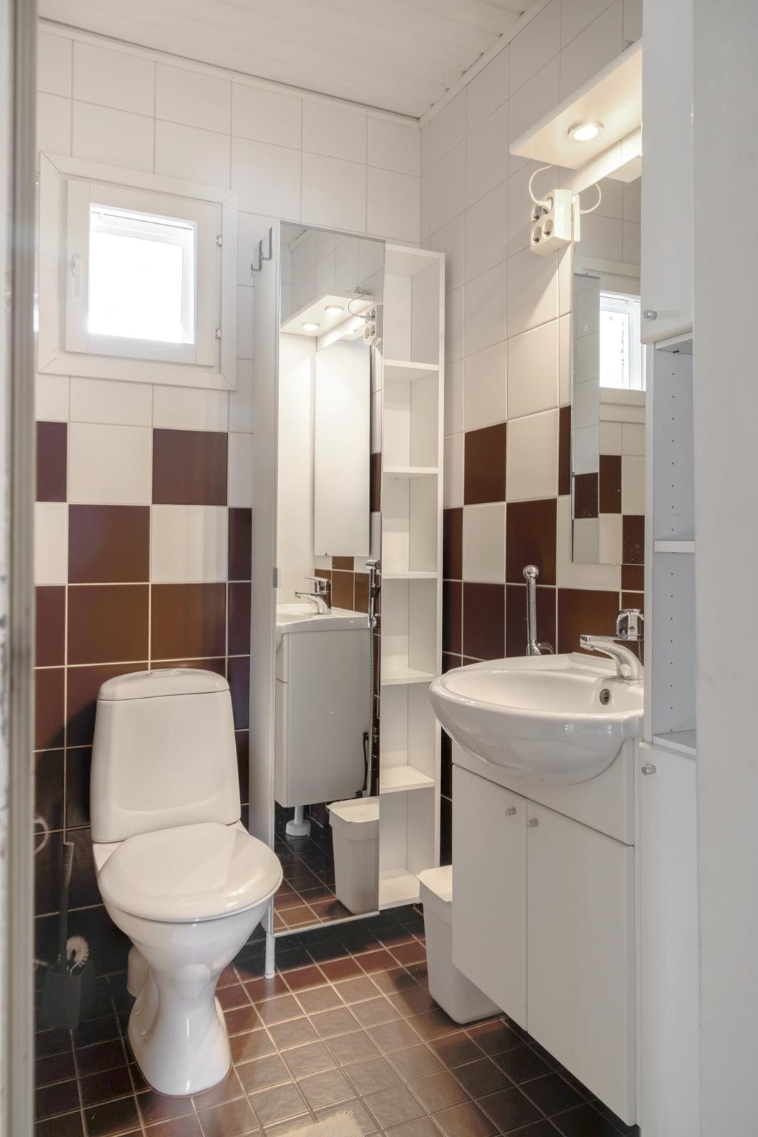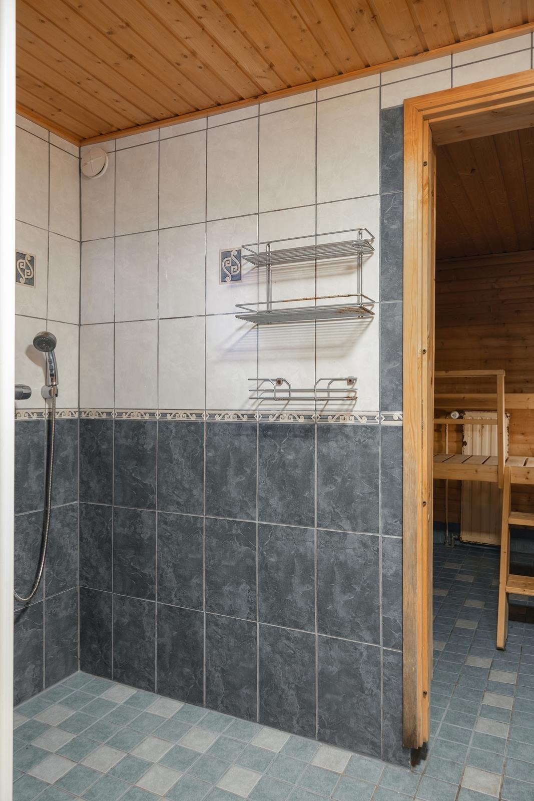 - Sauna, sähkökiuas, kylpyhuone, erillinen wc, suihku, suihkuseinä, peilit, kaapit, allaskaappi, pesukoneliitäntä.
