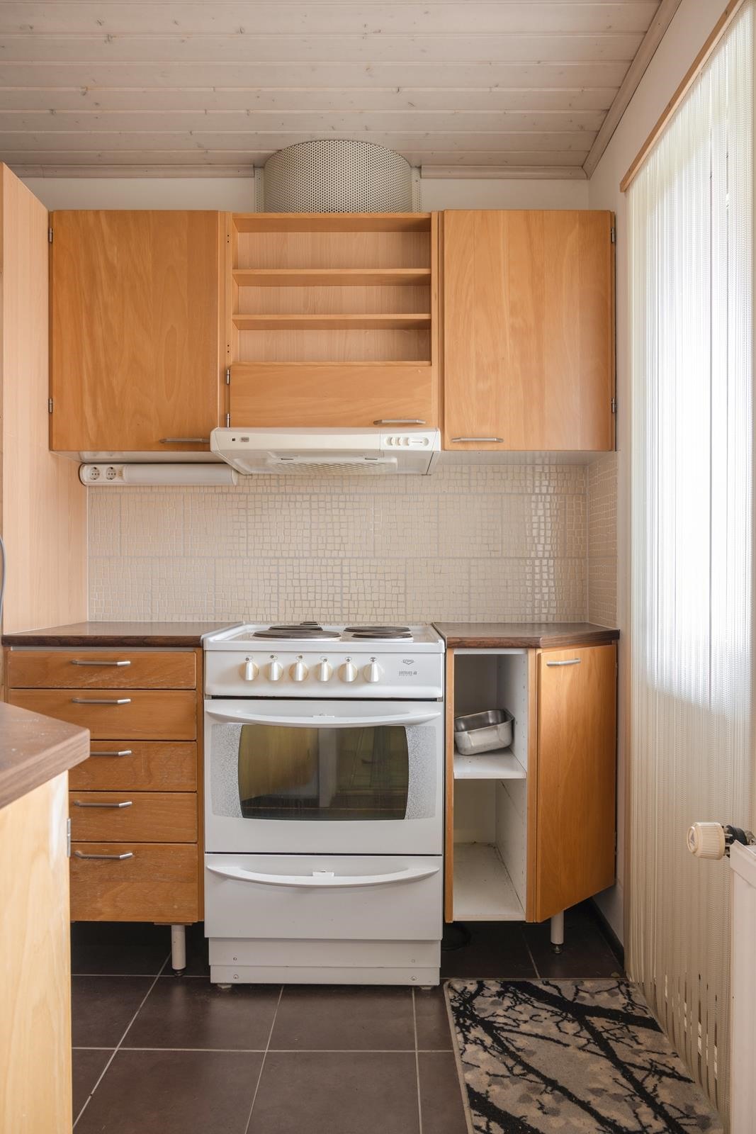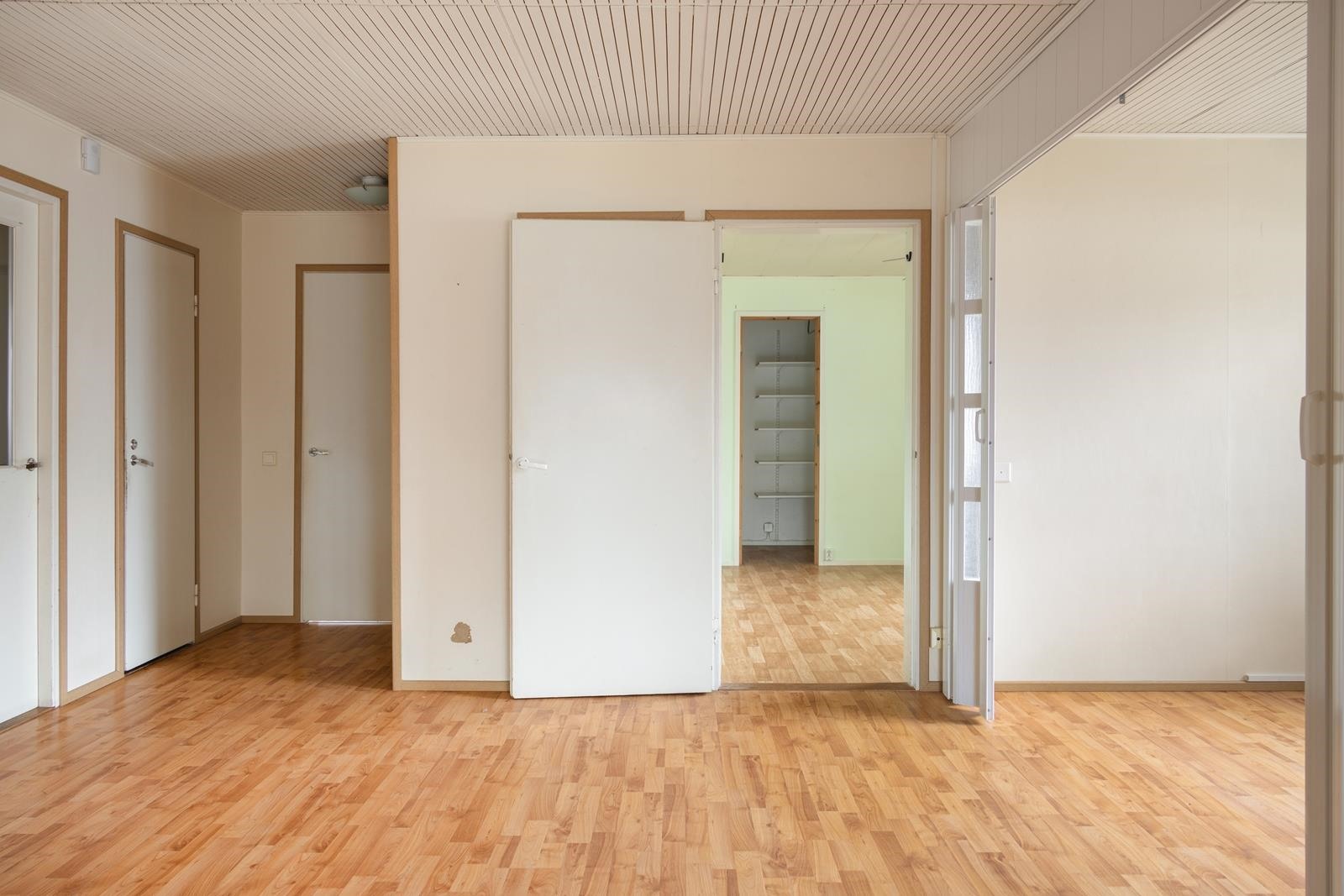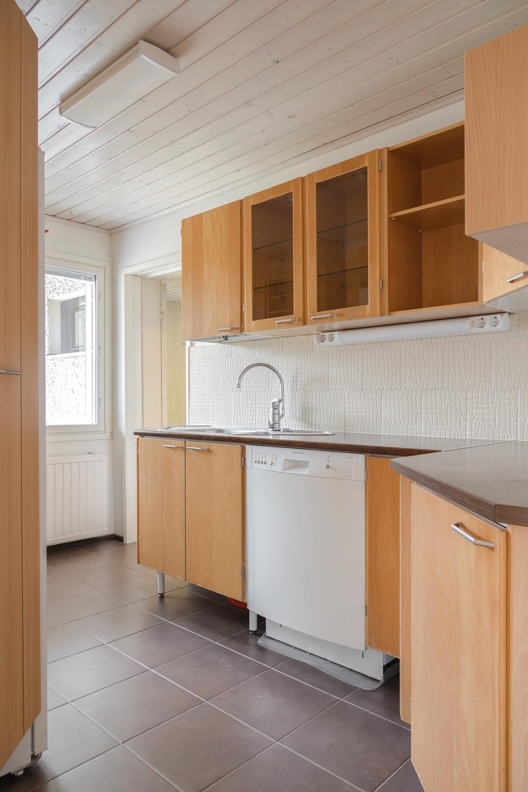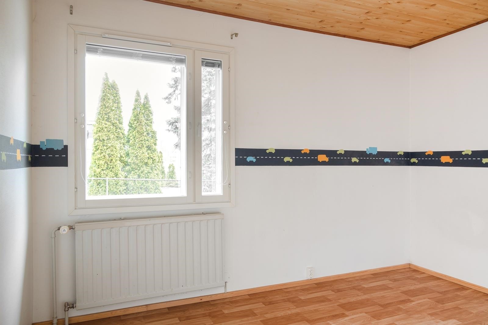 Keittiön lattialla laatoitus, olohuoneessa laminaatti ja makuuhuoneissa muovimatto. Seinillä maalattu lasikuitutapetti.
