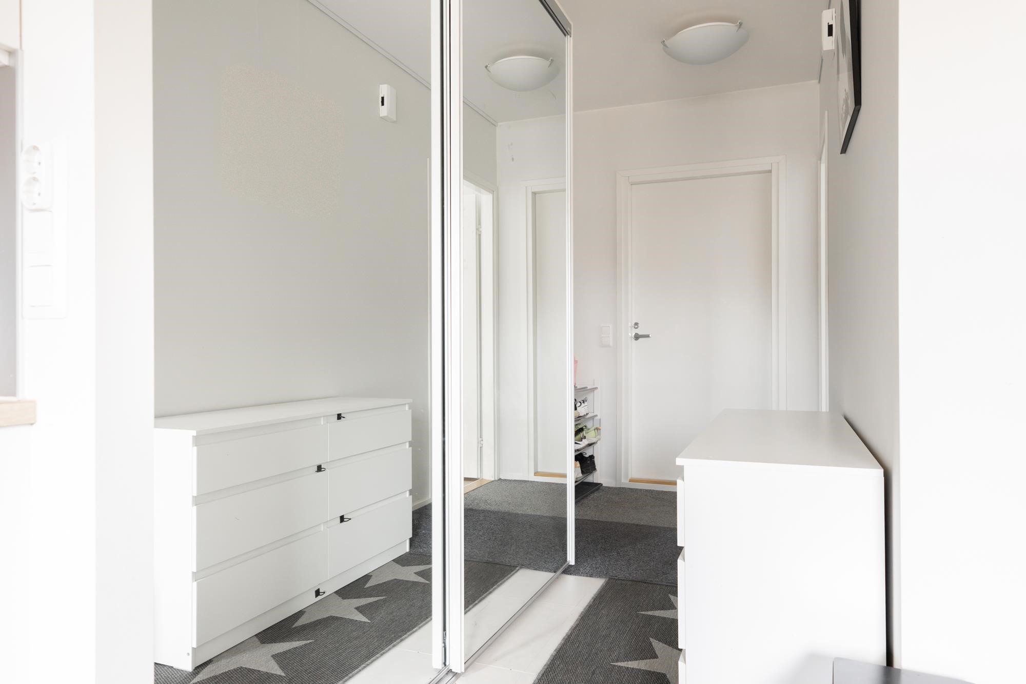 Keittiö: Vinyyli / maali. Olohuone: Vinyyli / maali. Makuuhuone 1: Vinyyli / maali. Makuuhuone 2: Vinyyli / maali. Sauna: Laatta / paneeli. Kylpyhuone: Laatta / laatta. Eteinen: Laatta / maali.