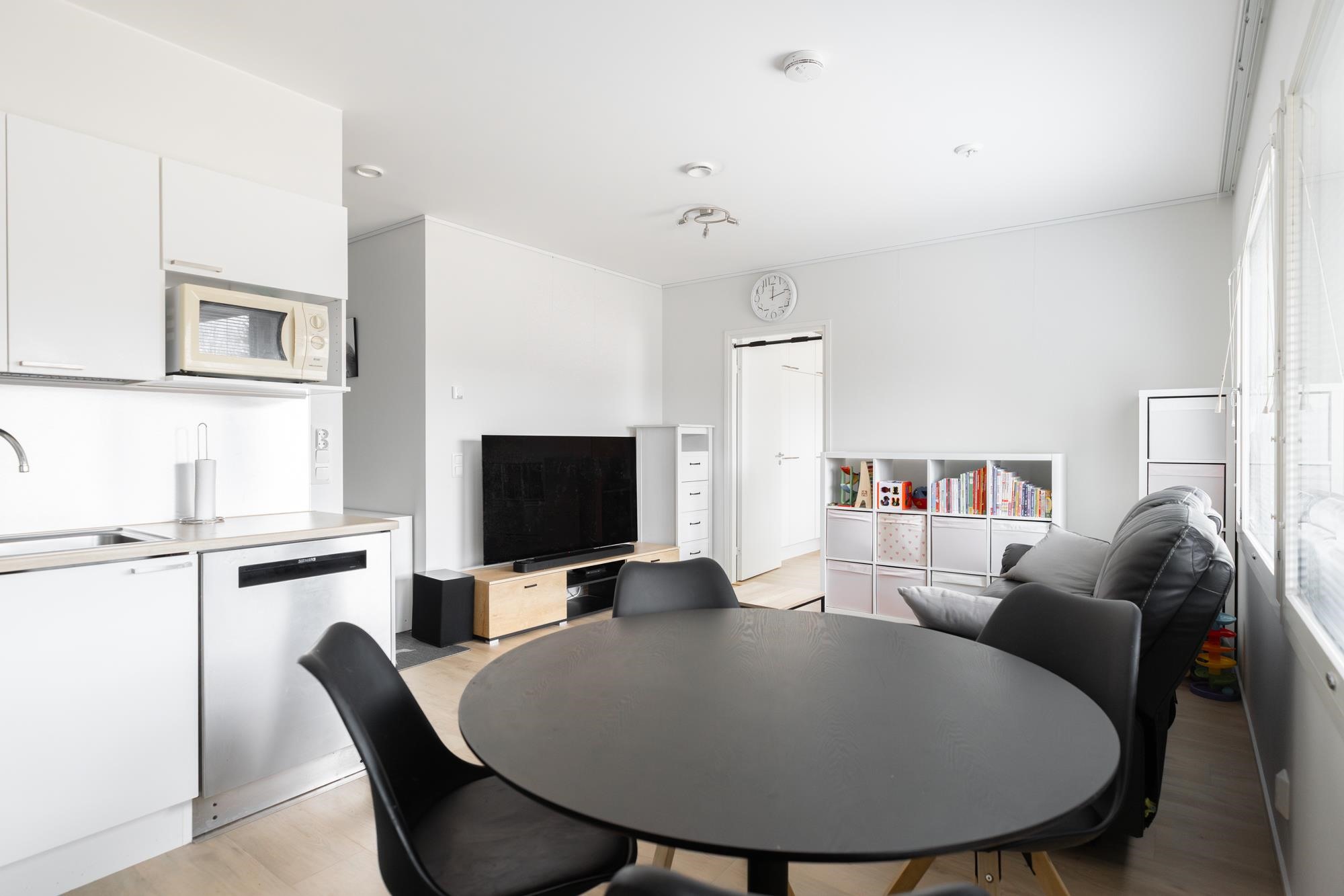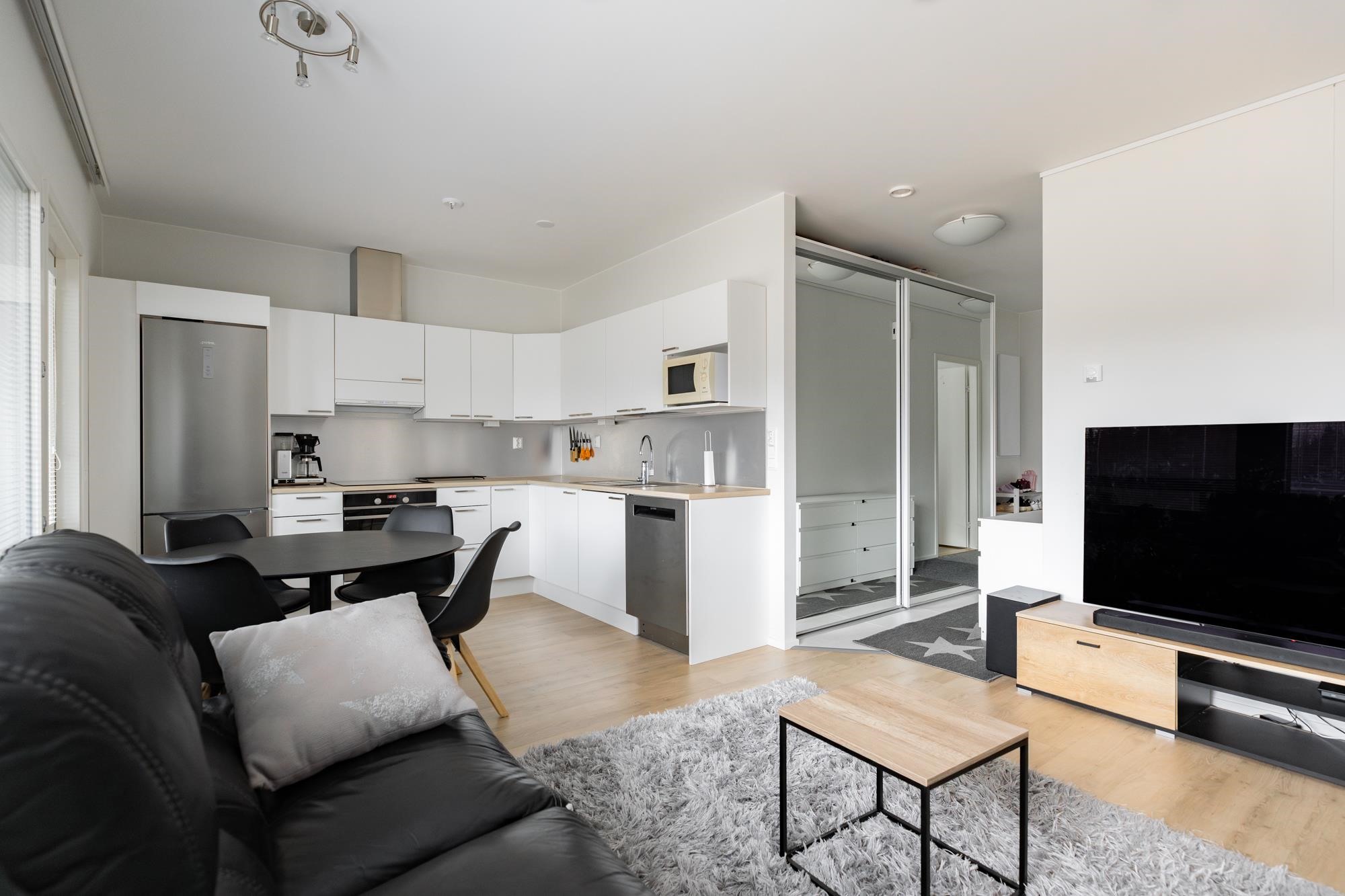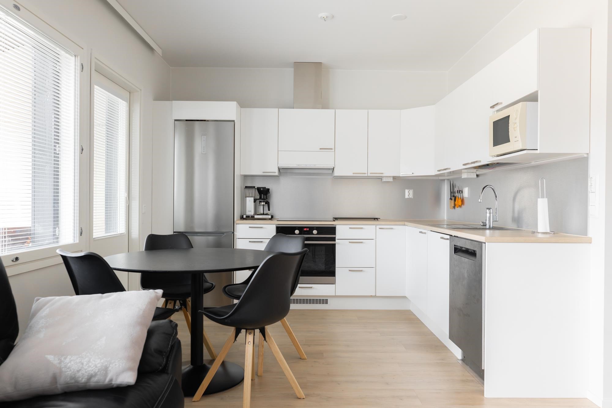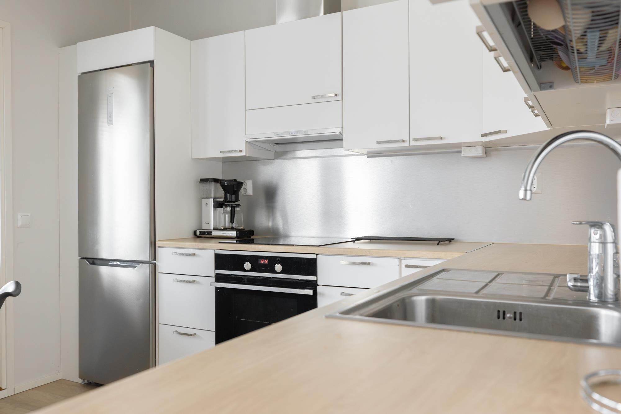 - Jääkaappipakastin, induktioliesi, liesituuletin, astianpesukone, kaapistot, kiinteät valaisimet.