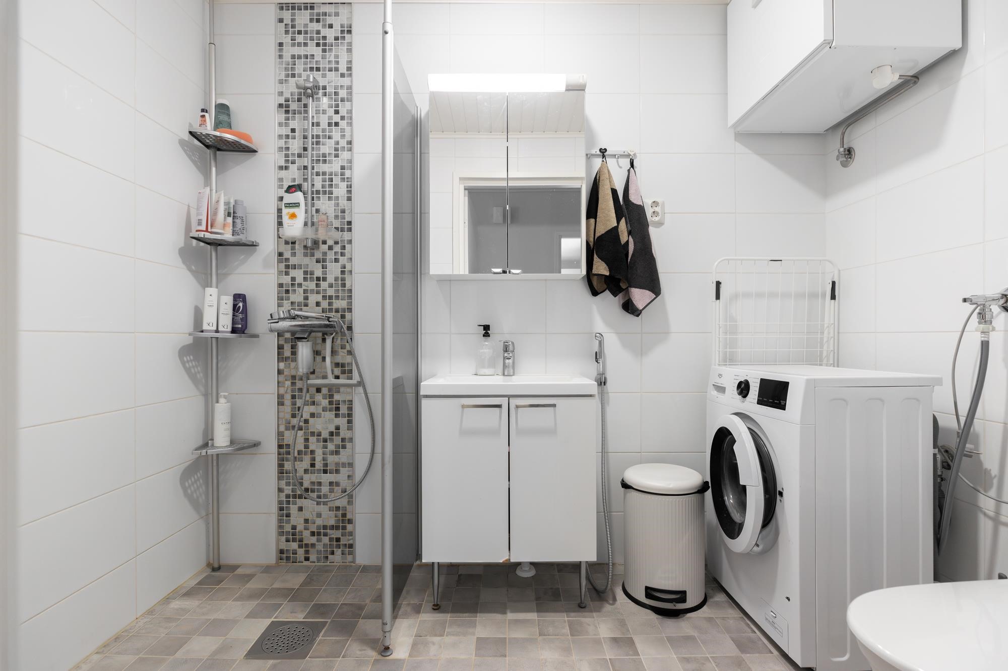 - Sauna, sähkökiuas, kylpyhuone, suihku, suihkuseinä, peilit, peilikaappi, kaapit, allaskaappi, pesukoneliitäntä, lattialämmitys, kiinteät valaisimet.