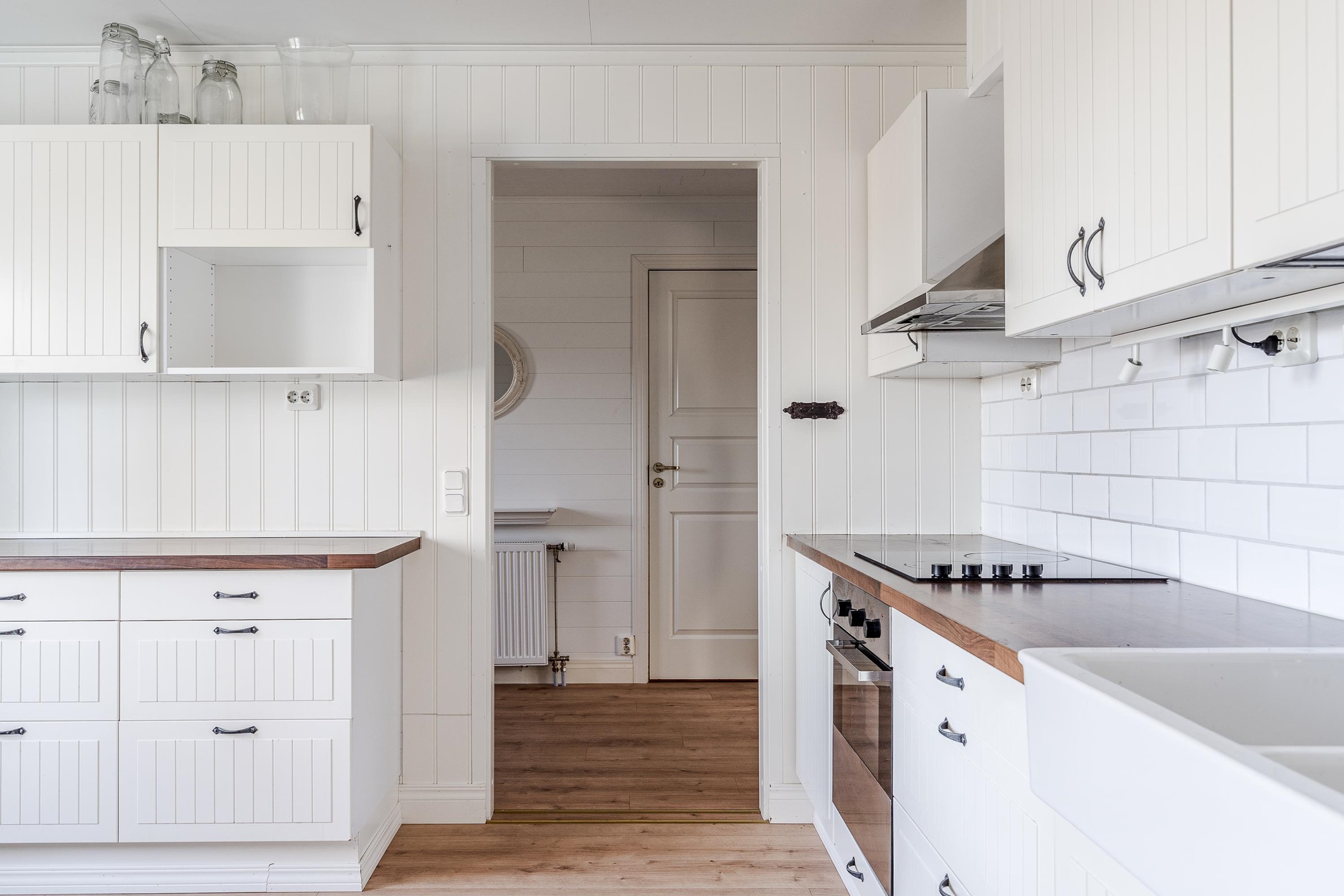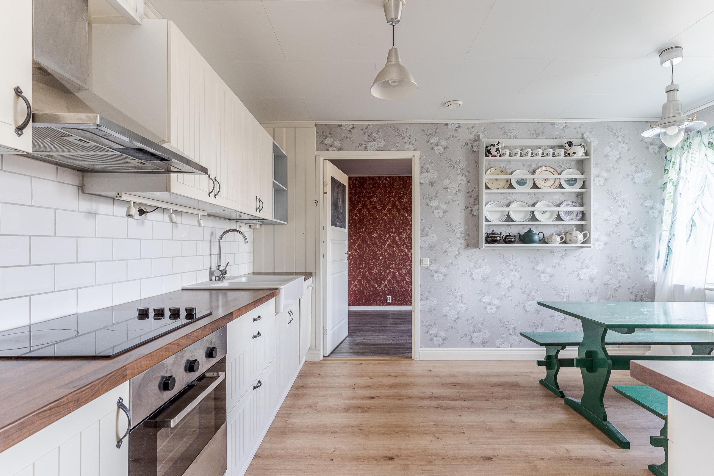 - Jääkaappi, sähköliesi, liesikupu, liesituuletin, astianpesukone, kaapistot, kiinteät valaisimet.