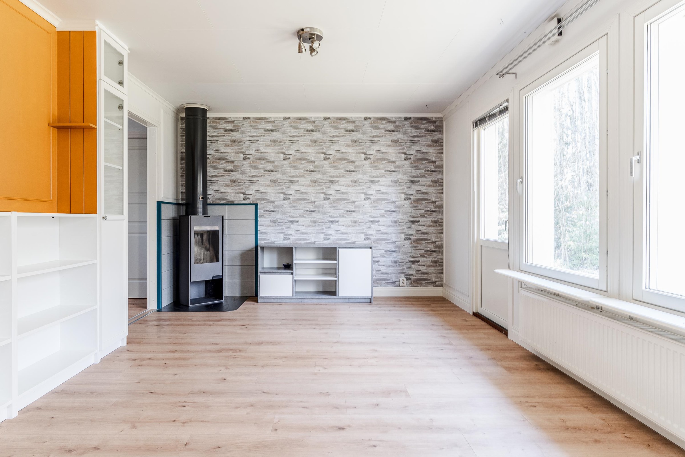 Väliseinä olohuoneessa poistettu. Saunan kiuas sekä lauteet poistettu, mahdollisuus laittaa takaisin.