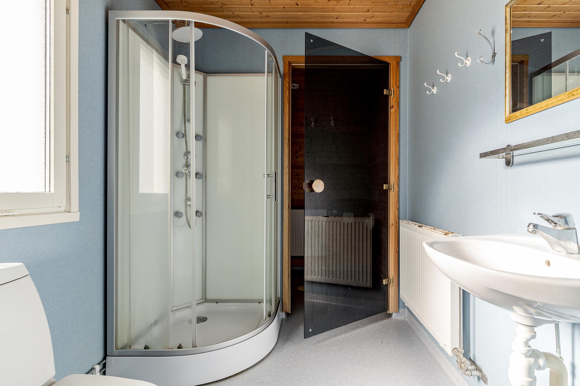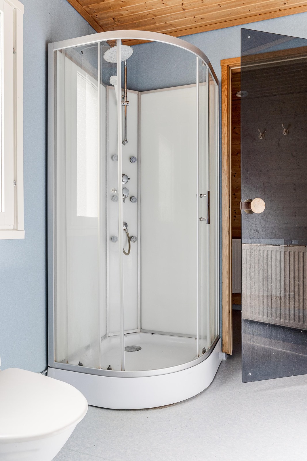 - Kylpyhuone, erillinen wc, suihku, suihkukaappi, peilit, peilikaappi, kaapit, allaskaappi, pesukoneliitäntä, lattialämmitys, kiinteät valaisimet.