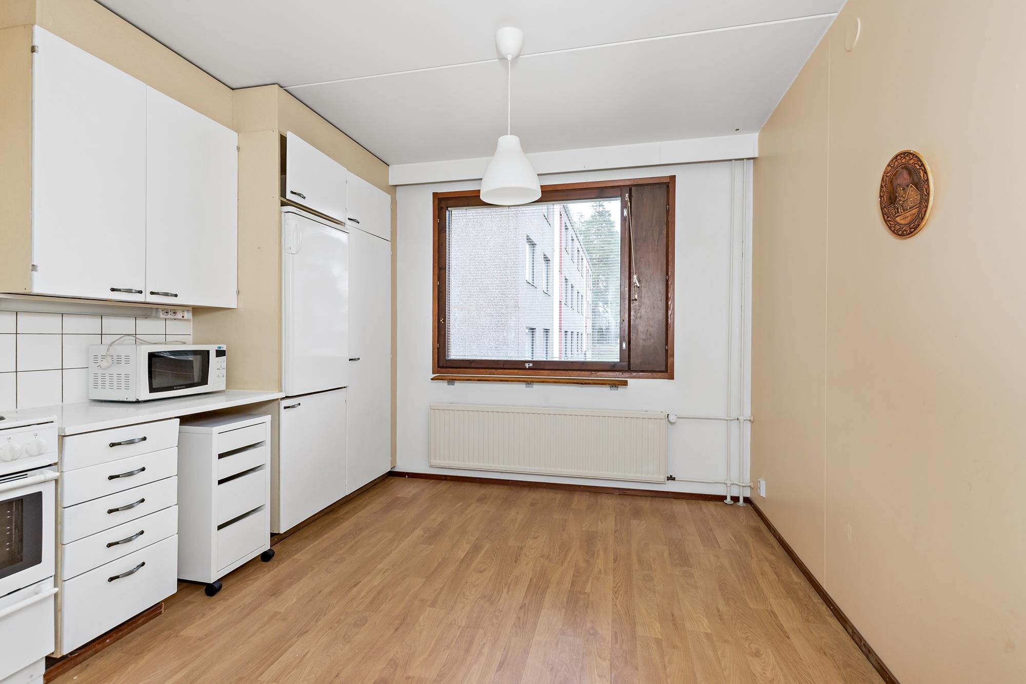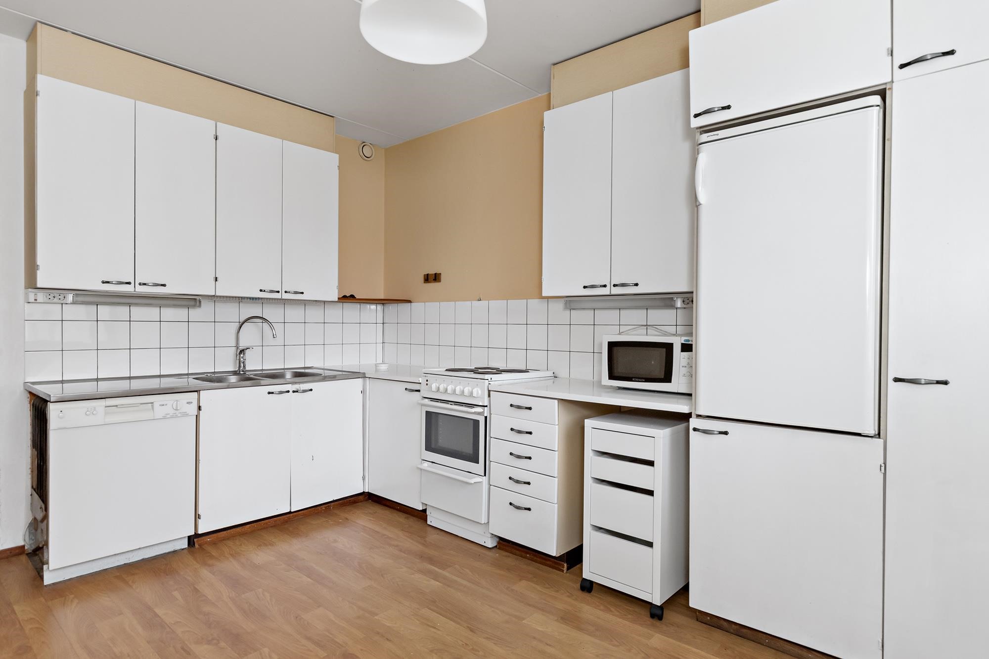 - Jääkaappi, sähköliesi, mikroaaltouuni, astianpesukone, kaapistot, kiinteät valaisimet. Myyjät eivät ole asuneet huoneistossa, mutta saadun tiedon mukaan kodinkoneiden pitäisi olla toimivat. Varmuutta ei ole.