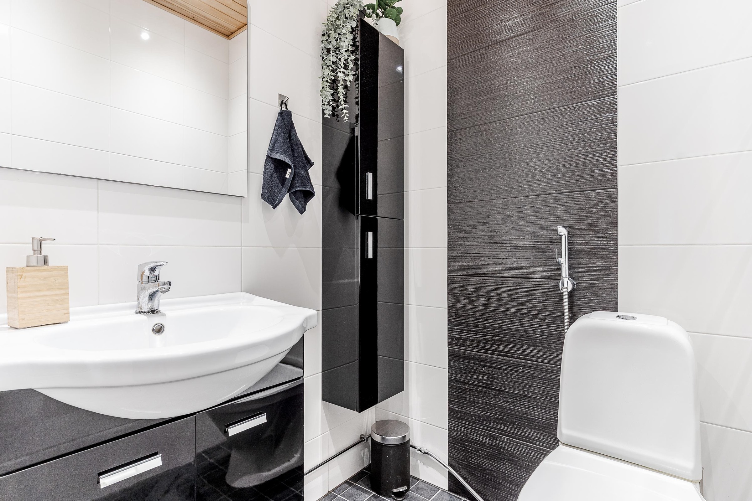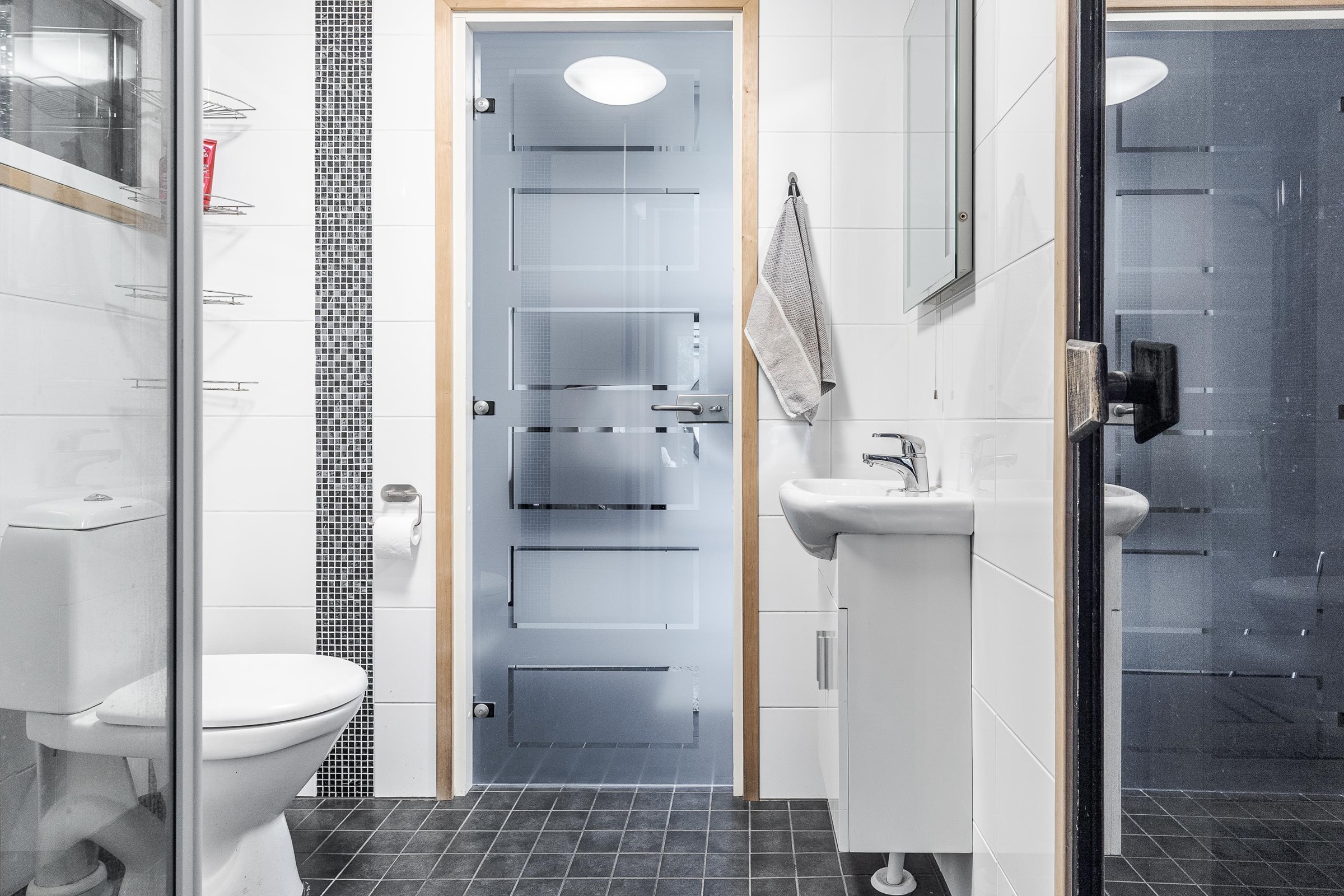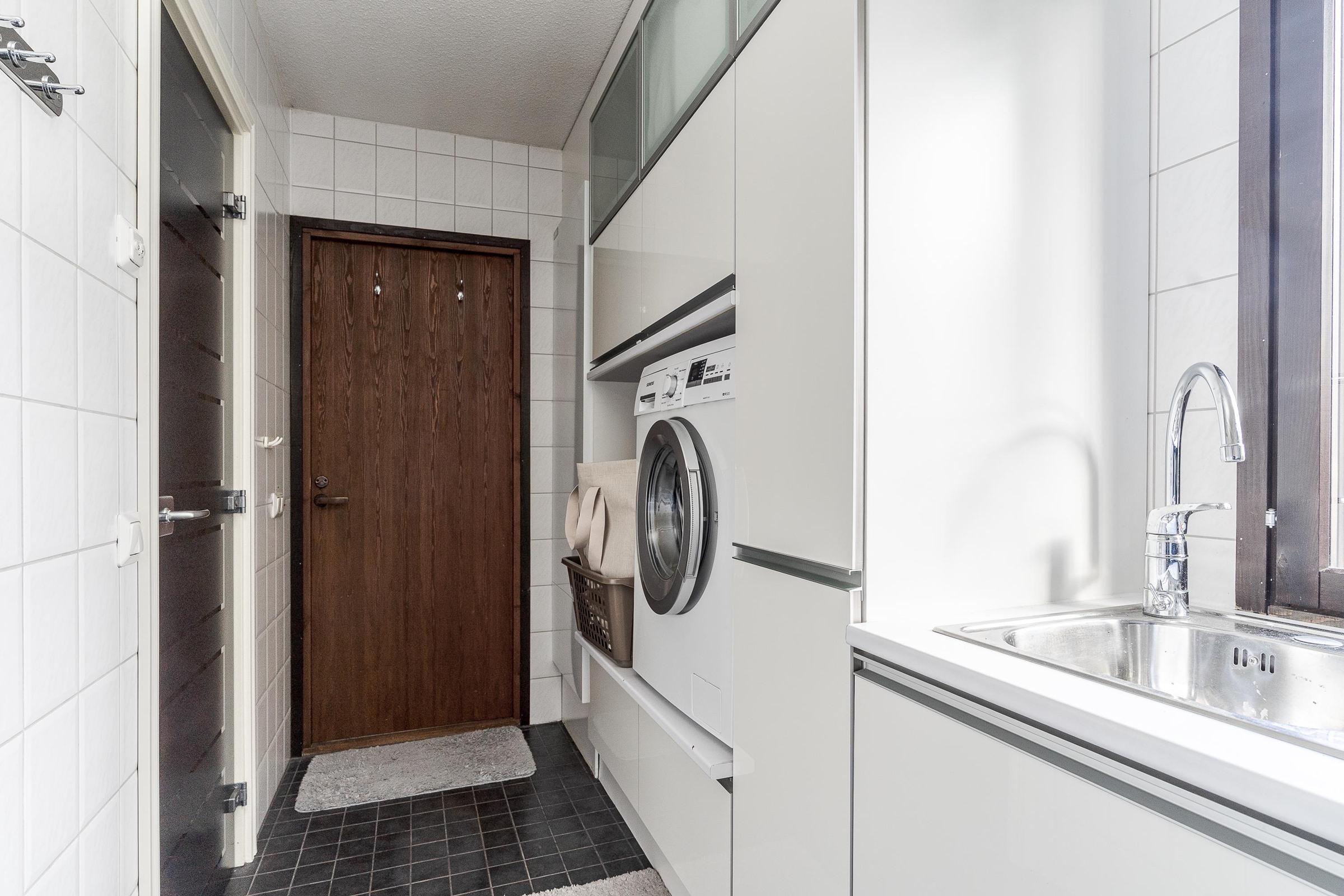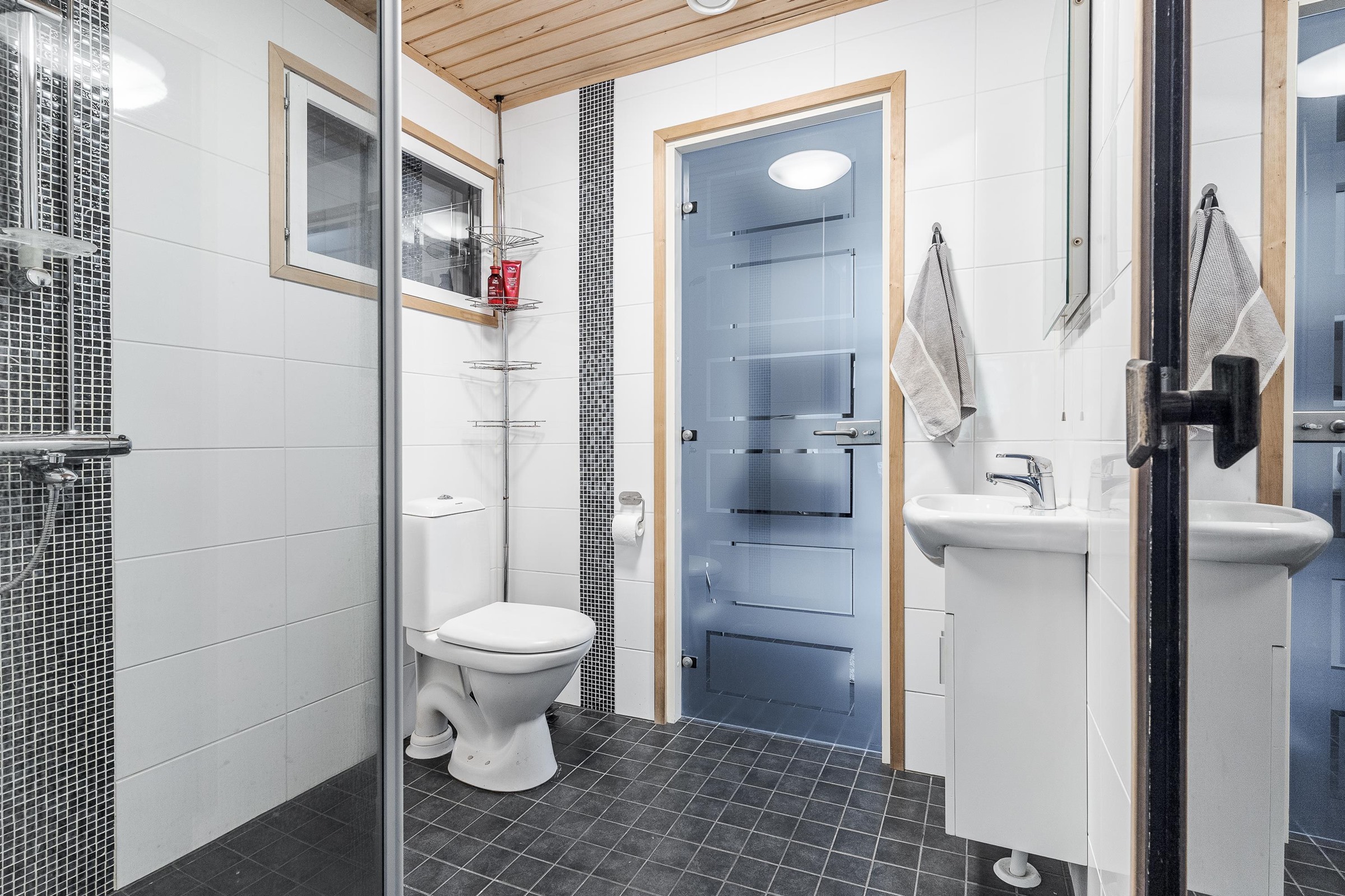 - Sauna, sähkökiuas, kylpyhuone, erillinen wc, suihku, suihkuseinä, peilit, kaapit, allaskaappi, pesukoneliitäntä, lattialämmitys, kiinteät valaisimet.