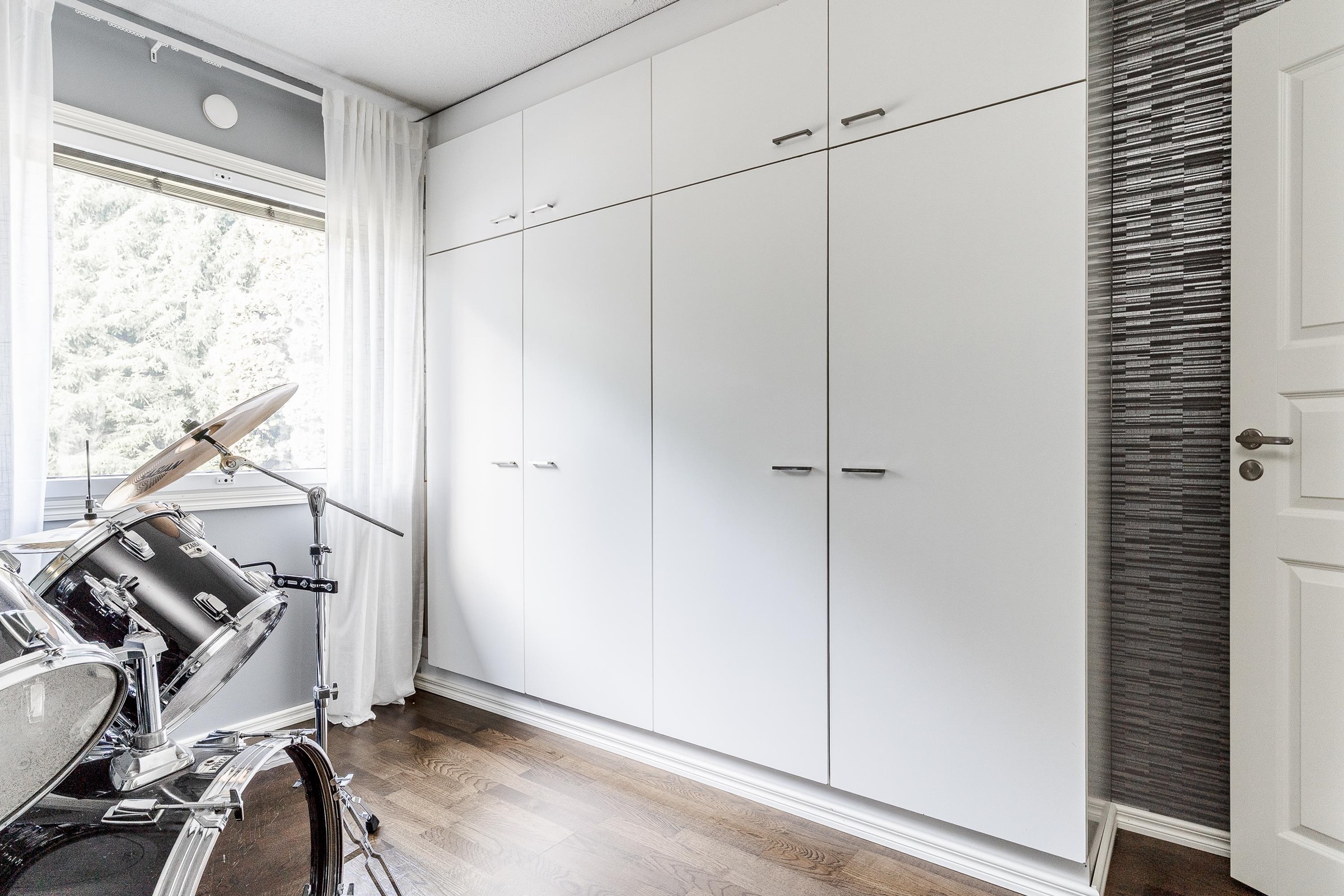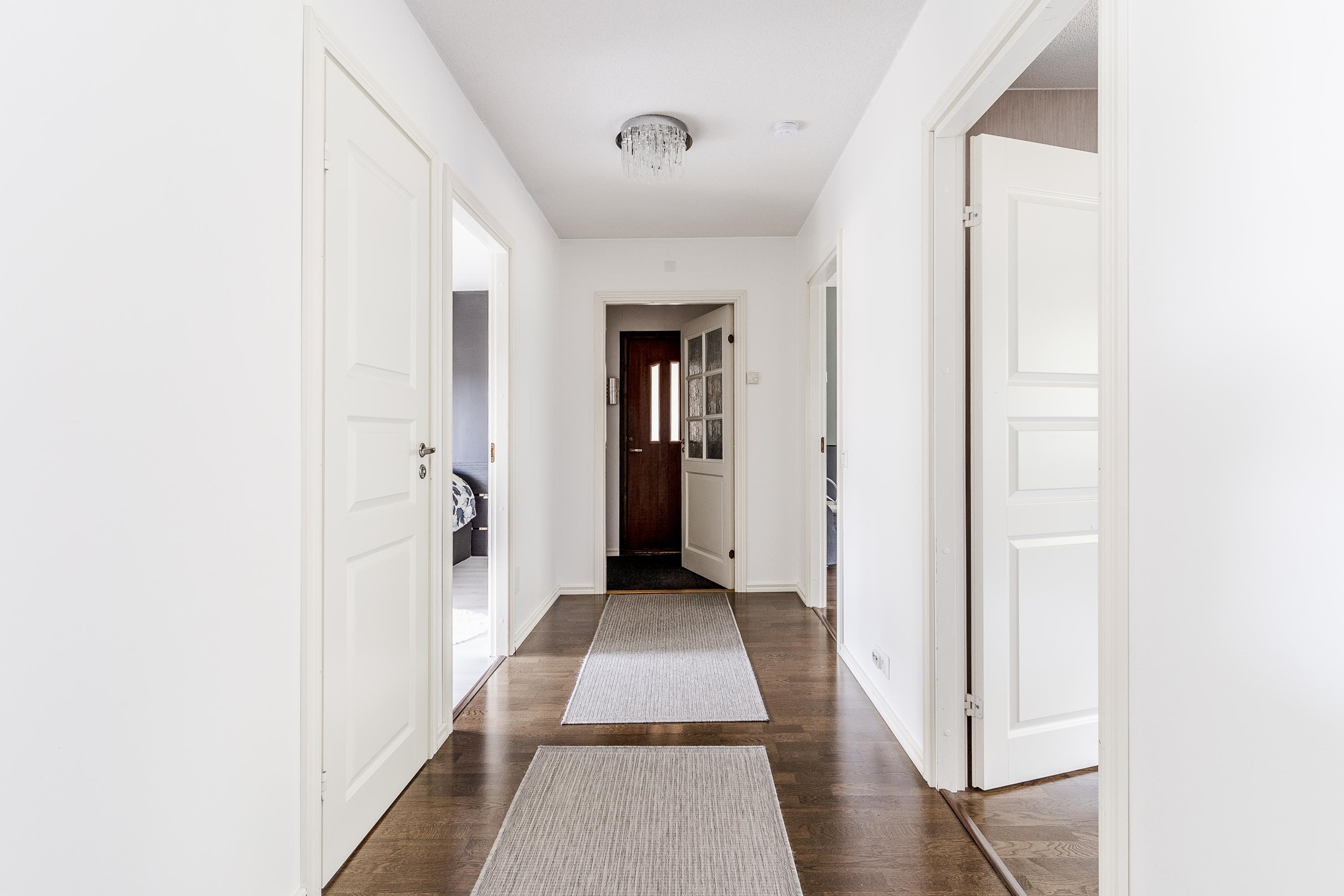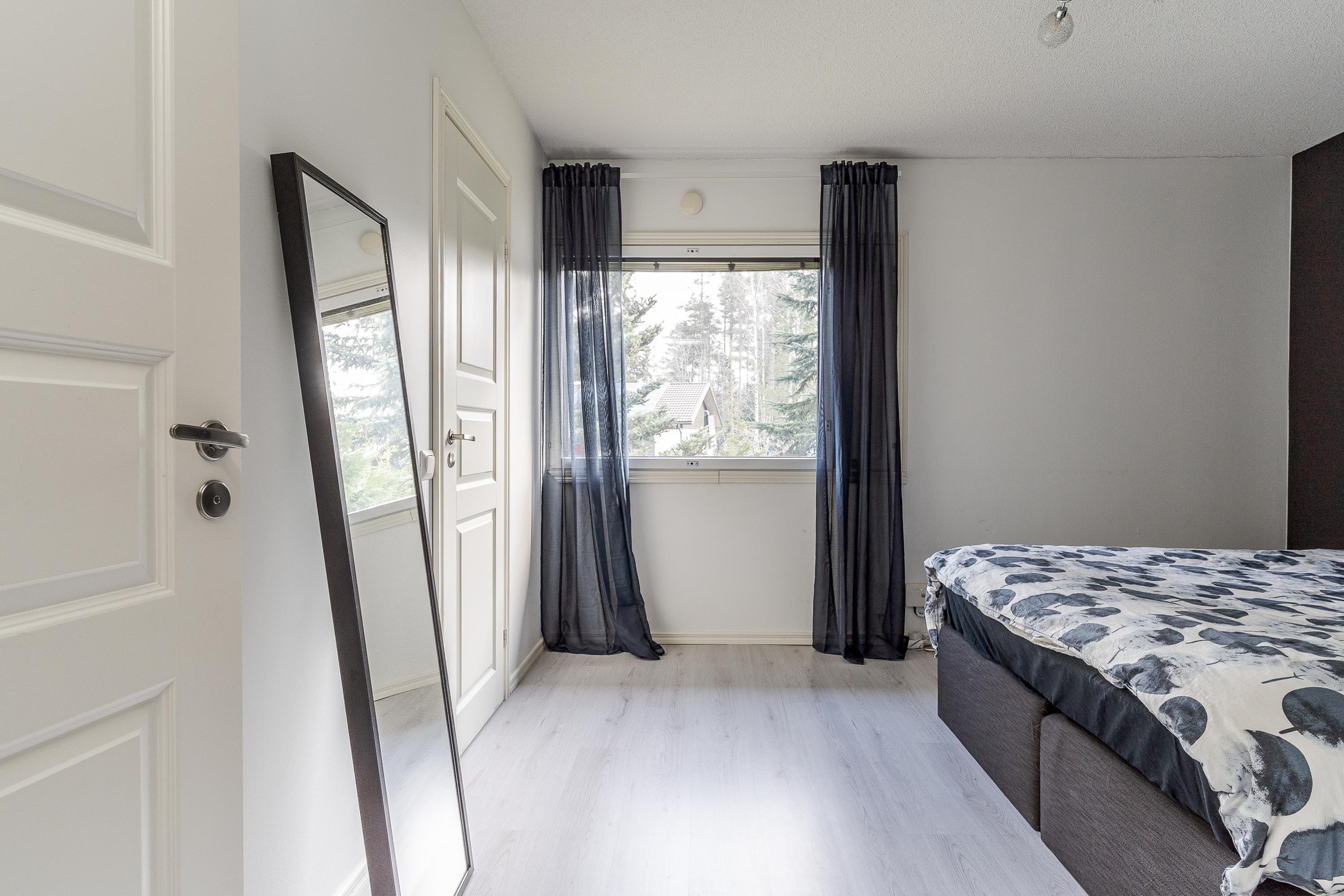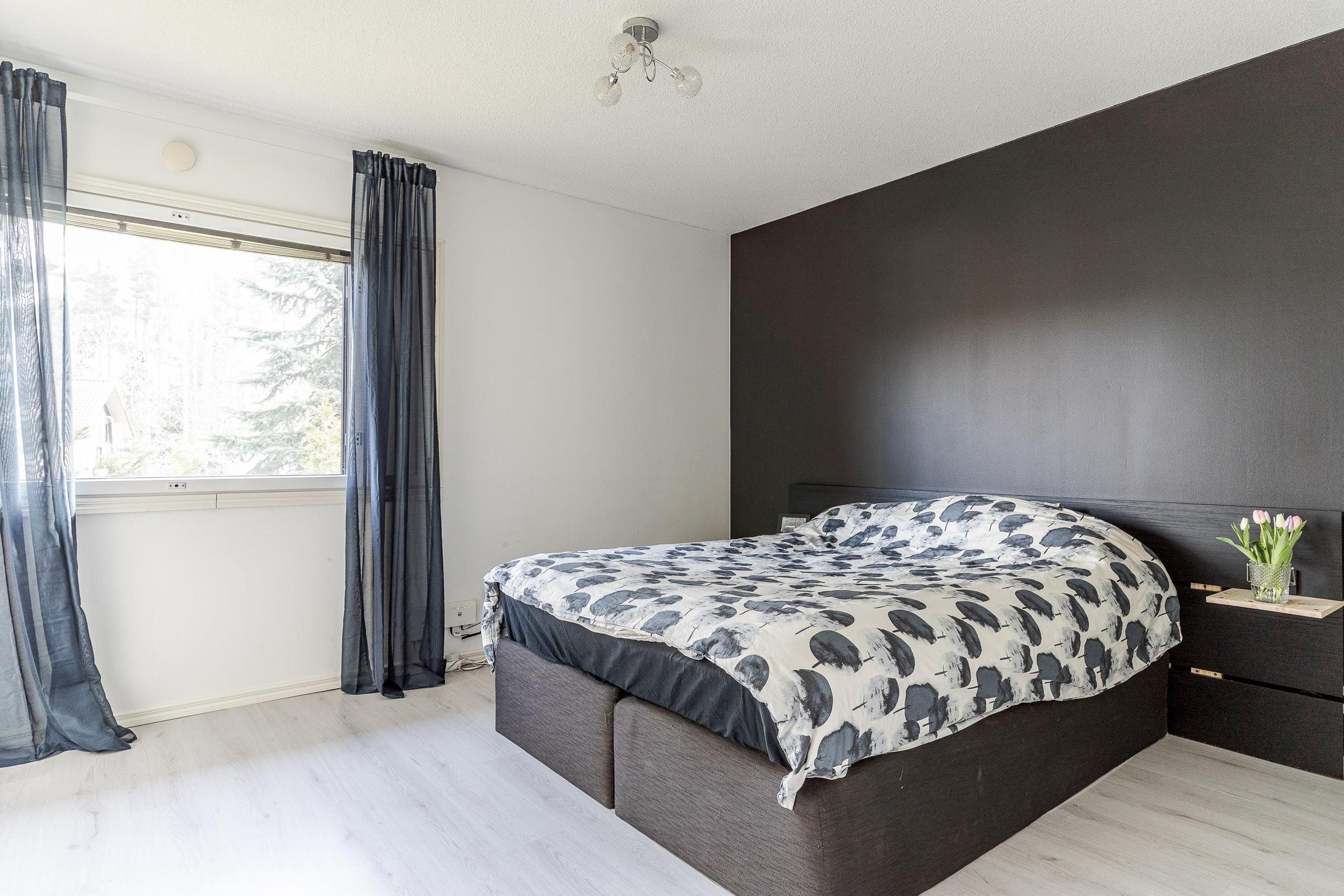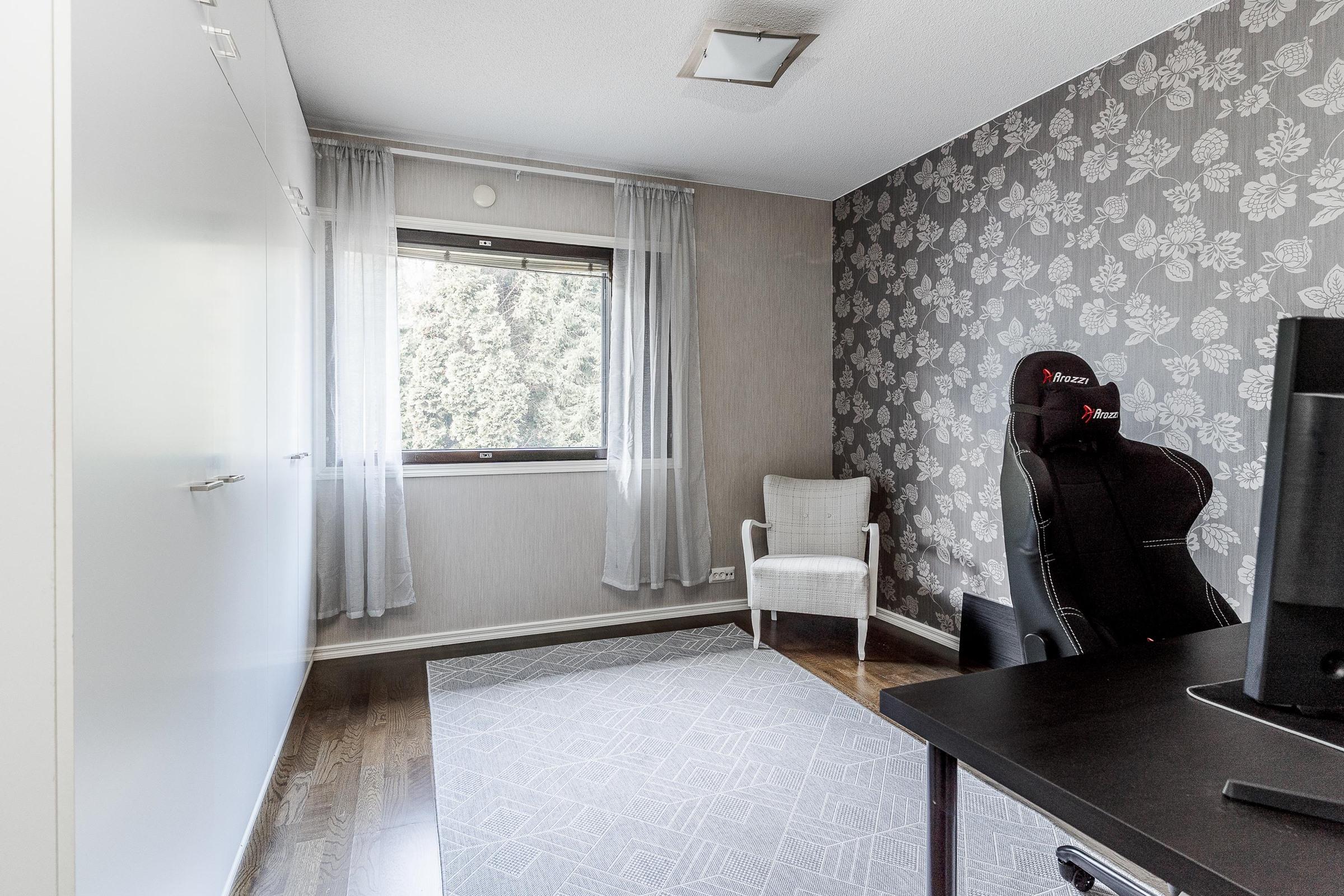 Keittiö: Lattiassa laminaatti, seinät tapetoitu. Olohuone: Lattiassa parketti, seinät maalattu. Makuuhuone 1: Lattiassa laminaatti, seinät maalattu. Makuuhuone 2: Lattiassa parketti, seinät maalattu. Makuuhuone 3: Lattiassa parketti, seinät tapetoitu. Kodinhoitohuone: Kokonaan laatoitettu. Sauna: Lattiassa laatta, seinät paneloitu/laatoitettu. Kylpyhuone: Kokonaan laatoitettu. Eteinen: Lattiassa parketti, seinät maalattu. Wc: Kokonaan laatoitettu. Tuuliikaappi: Lattiassa laatta, seinät tapetoitu. Vaatehuone: Lattiassa laminaatti, seinät maalattu.