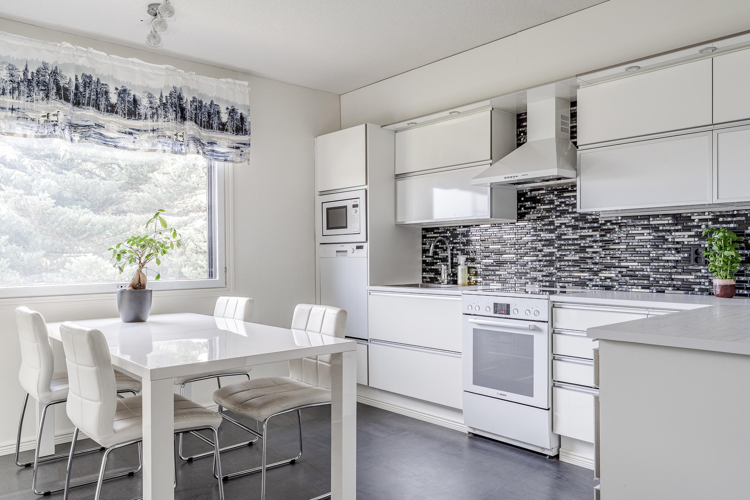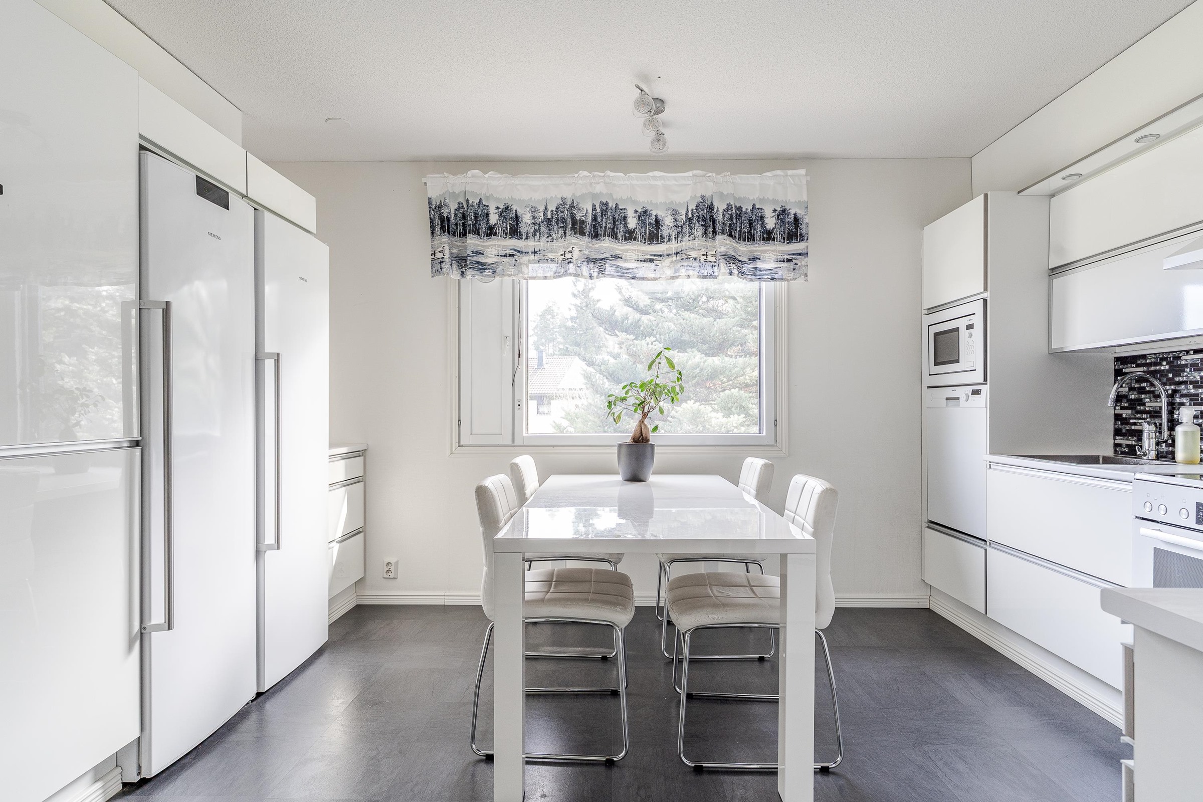 - Jääkaappi, pakastekaappi, keraaminen liesi, liesituuletin, mikroaaltouuni, astianpesukone, kaapistot, kiinteät valaisimet.