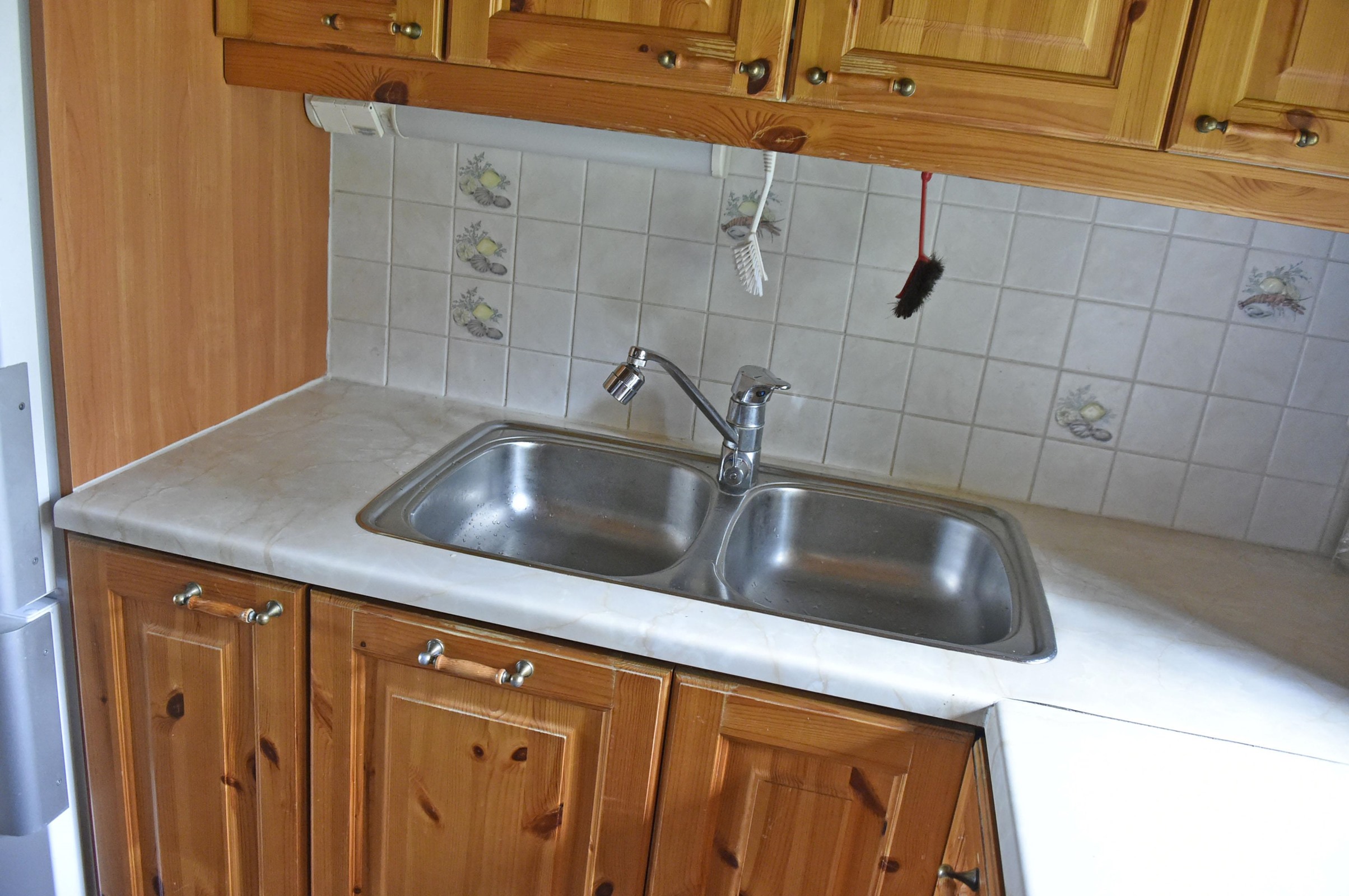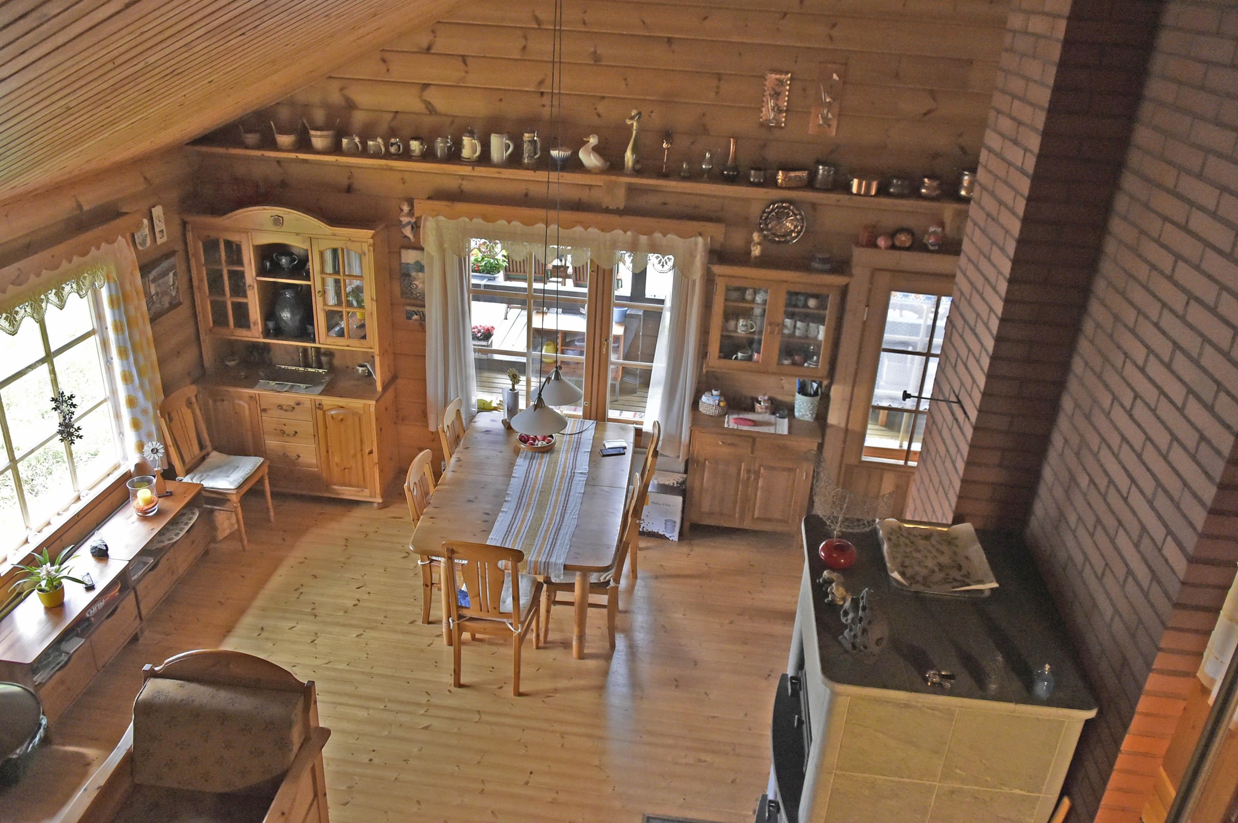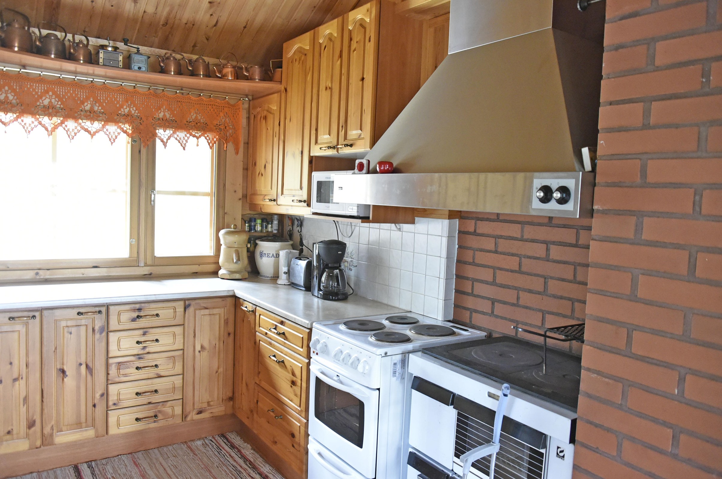 - Jääkaappipakastin, lattialiesi, sähköliesi, liesituuletin, leivinuuni, mikroaaltouuni, kaapistot, kiinteät valaisimet, pöytätasojen materiaali laminaatti. Keittiössä puuhella.