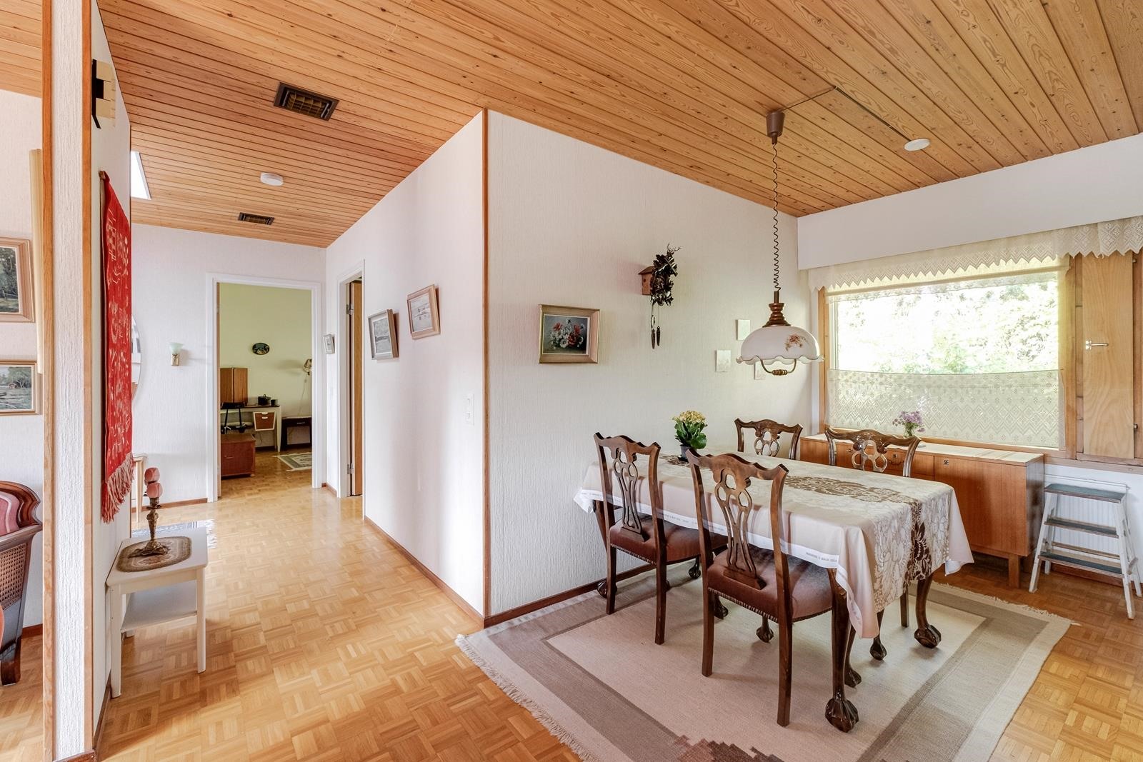 Keittiö: lattia laatta, seinät laatta, ruokailutilassa parkettilattia. Olohuone: seinät tapetti, lattia parketti. Makuuhuone 1: seinät tapetti, lattia parketti. Makuuhuone 2: seinät tapetti, lattia parketti. Makuuhuone 3: seinät tapetti, lattia parketti. Sauna: laattalattia, puupaneeli. Kylpyhuone: laattalattia, laattaseinä. Wc: lattia laatta, seinä laatta, seinä maalattu.