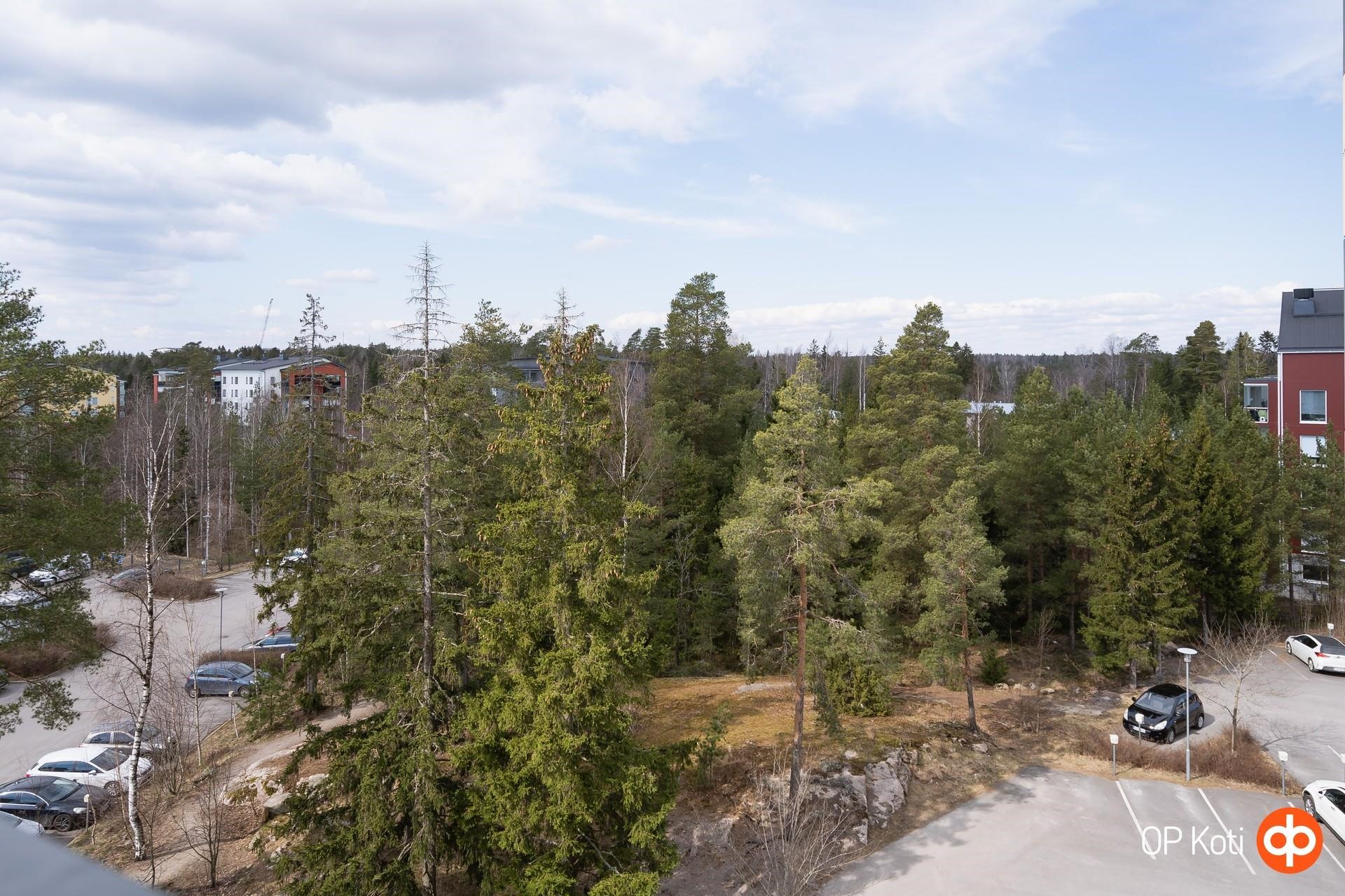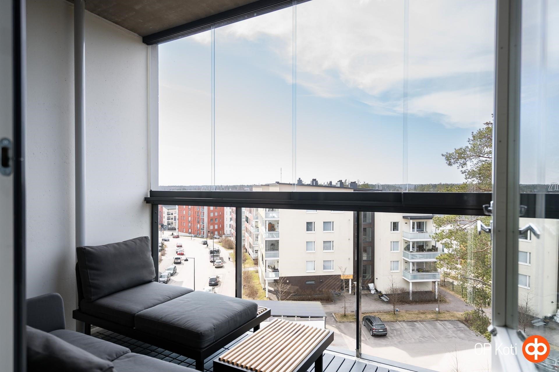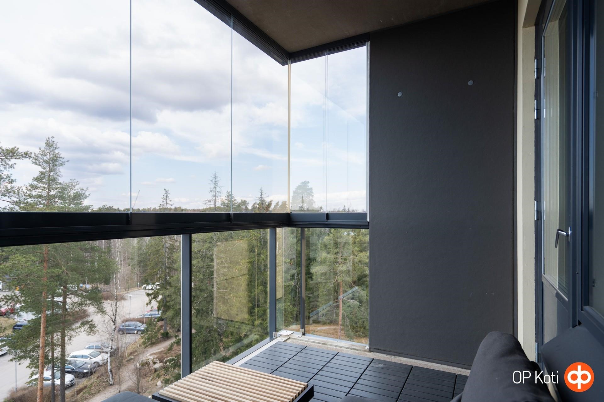 - Tilava lasitettu länsiparveke, josta on upeat ja avarat näkymät yli puiden.