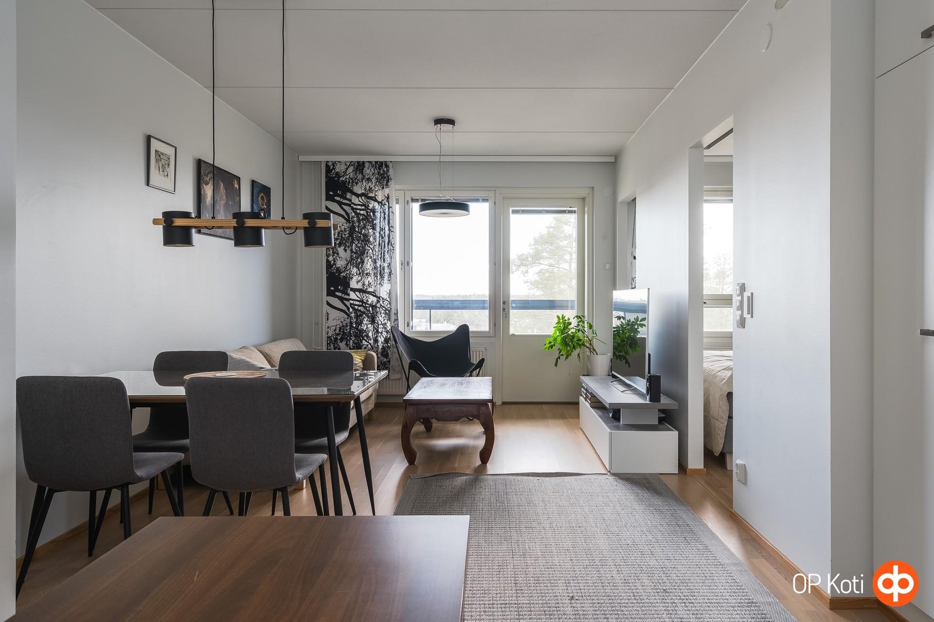 Avara pohjaratkaisu yhdistää olohuoneen ja avokeittiön luontevaksi kokonaisuudeksi, jossa on helppo viihtyä niin arjessa kuin ystäviä tavattaessa. Suuret ikkunat ja tilava lasitettu länsiparveke tuovat asuntoon runsaasti valoa sekä avarat näkymät yli puiden. Se on paikka, jossa ilta-auringosta on helppo nauttia pitkälle syksyyn.