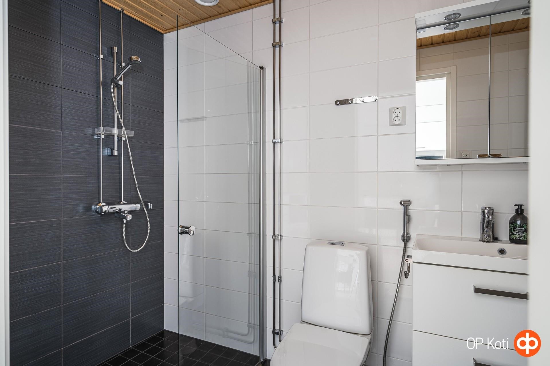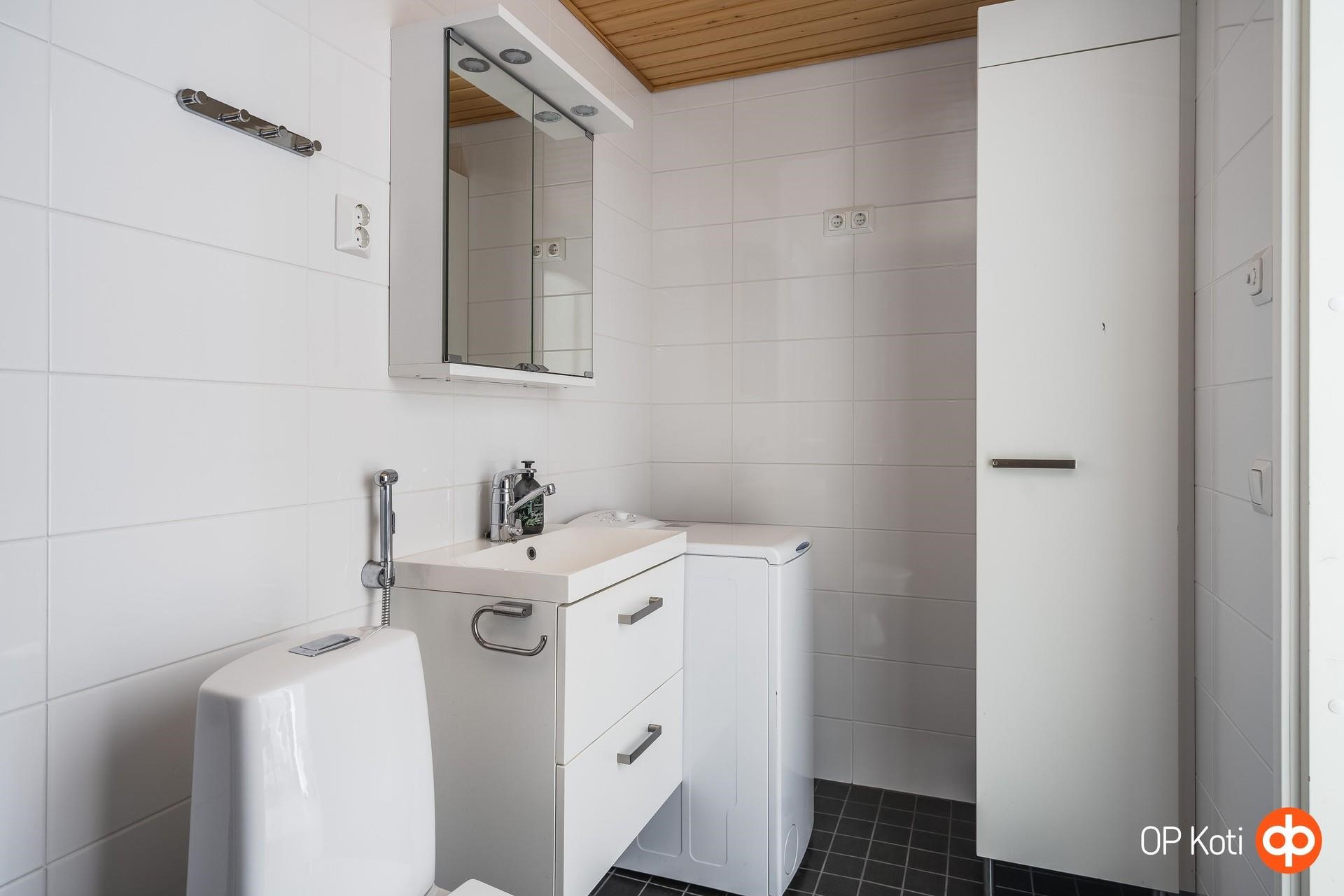 - Kylpyhuoneessa on suihku, suihkuseinä, peili- ja allaskaappi, pyykkikaappi, pesukoneliitäntä, lattialämmitys -sähköinen sekä kiinteät valaisimet.