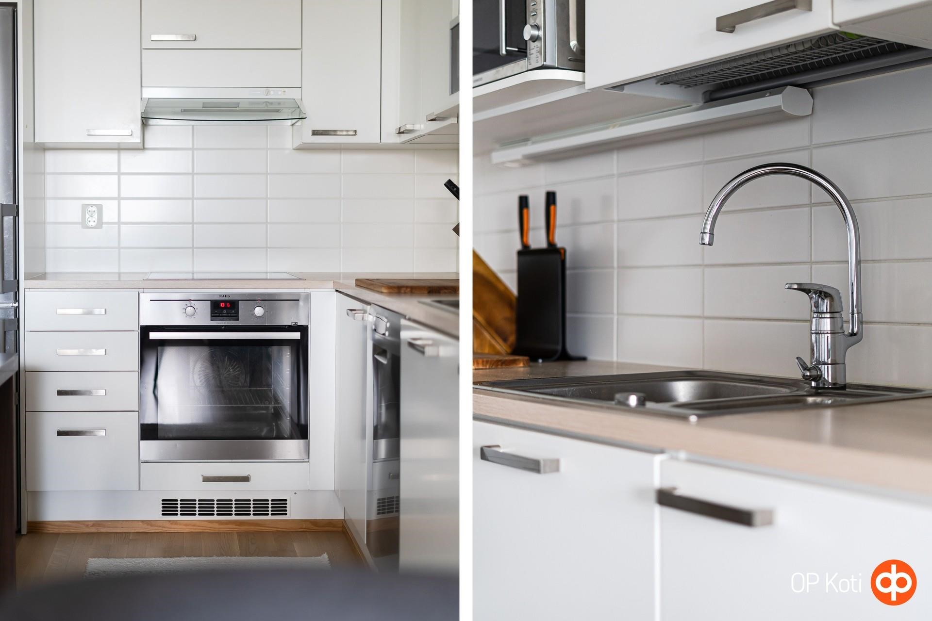 - Avokeittiön varusteisiin kuuluu jääkaappipakastin, erillisuuni, liesitaso -keraaminen, liesikupu, astianpesukone, kaapistot sekä kiinteät valaisimet. Välitila on laatoitettu.