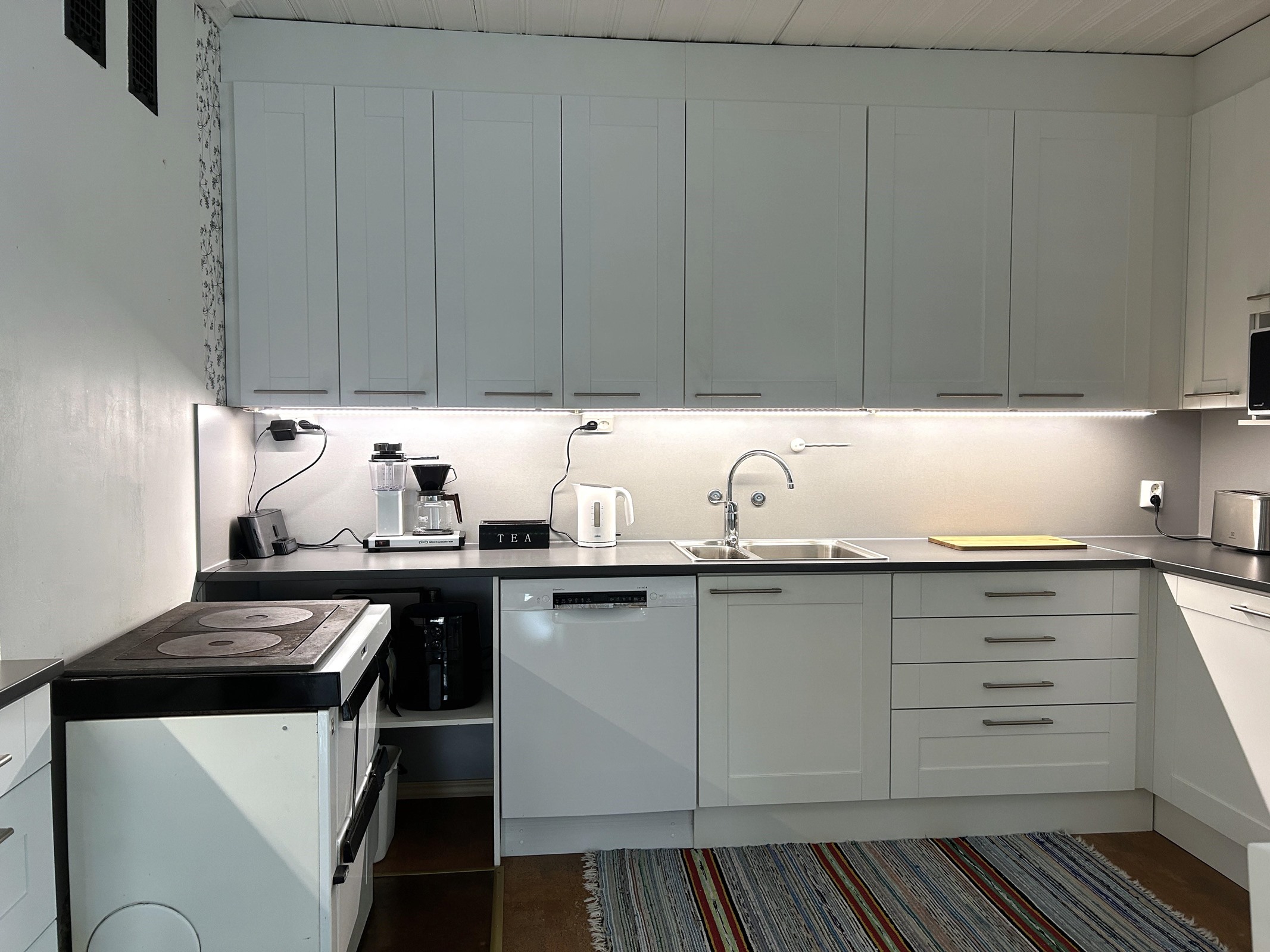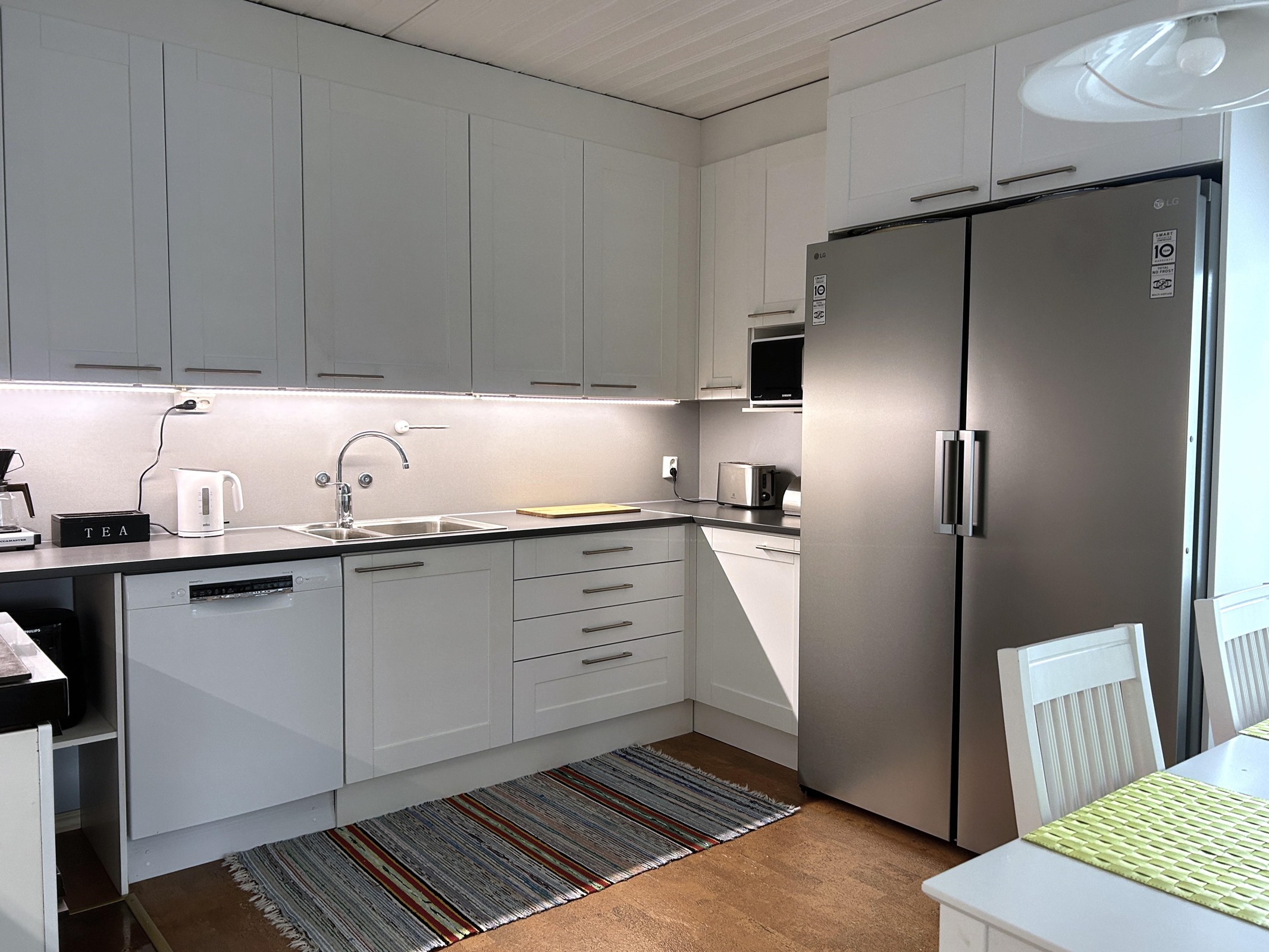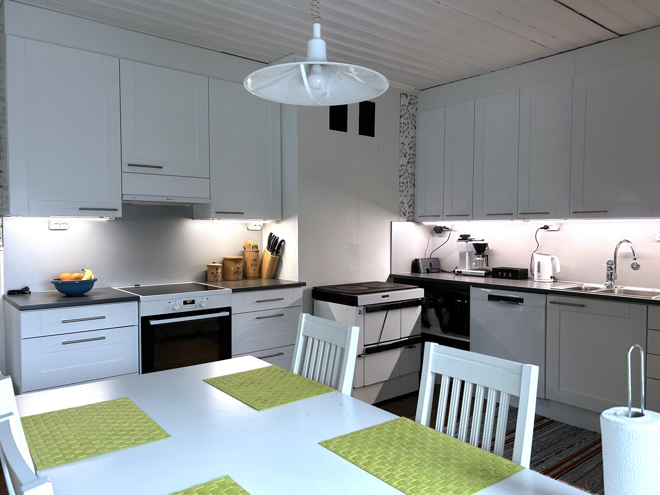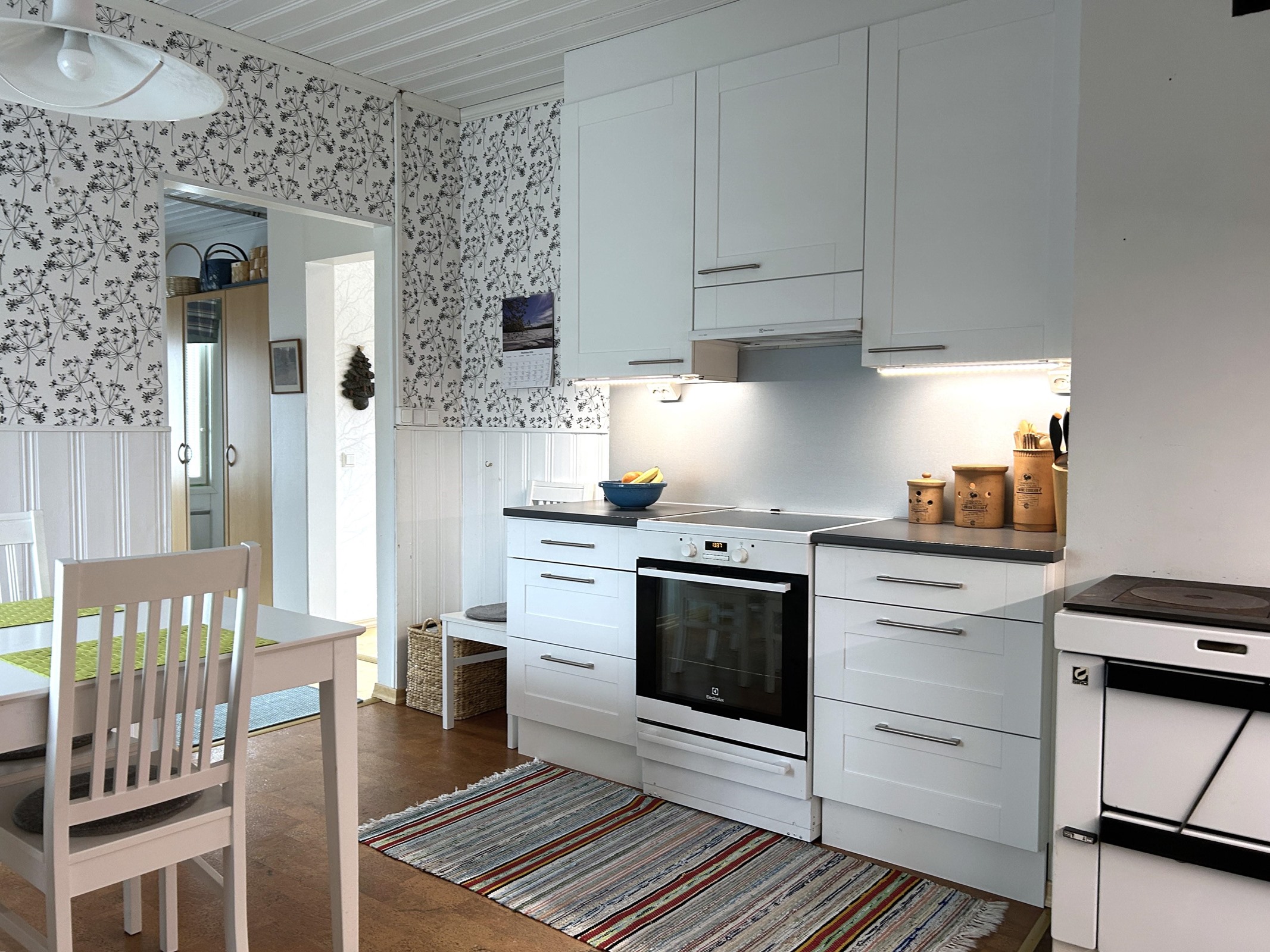 - Keittiö uusittu 2015 (Eurokeittiö).Varusteina puuhella, jääkaappi ja pakastekaappi (nämä uusittu 2024), induktioliesi, liesituuletin, astianpesukone, kaapistot, pöytätasojen materiaali laminaatti.