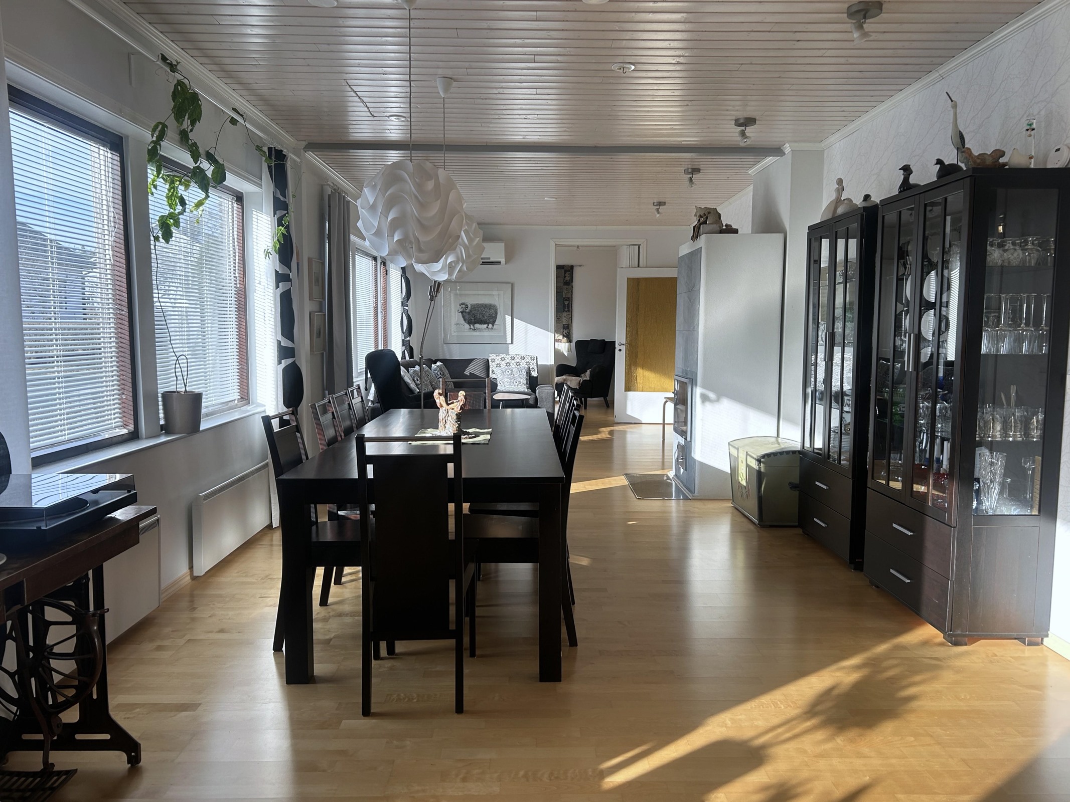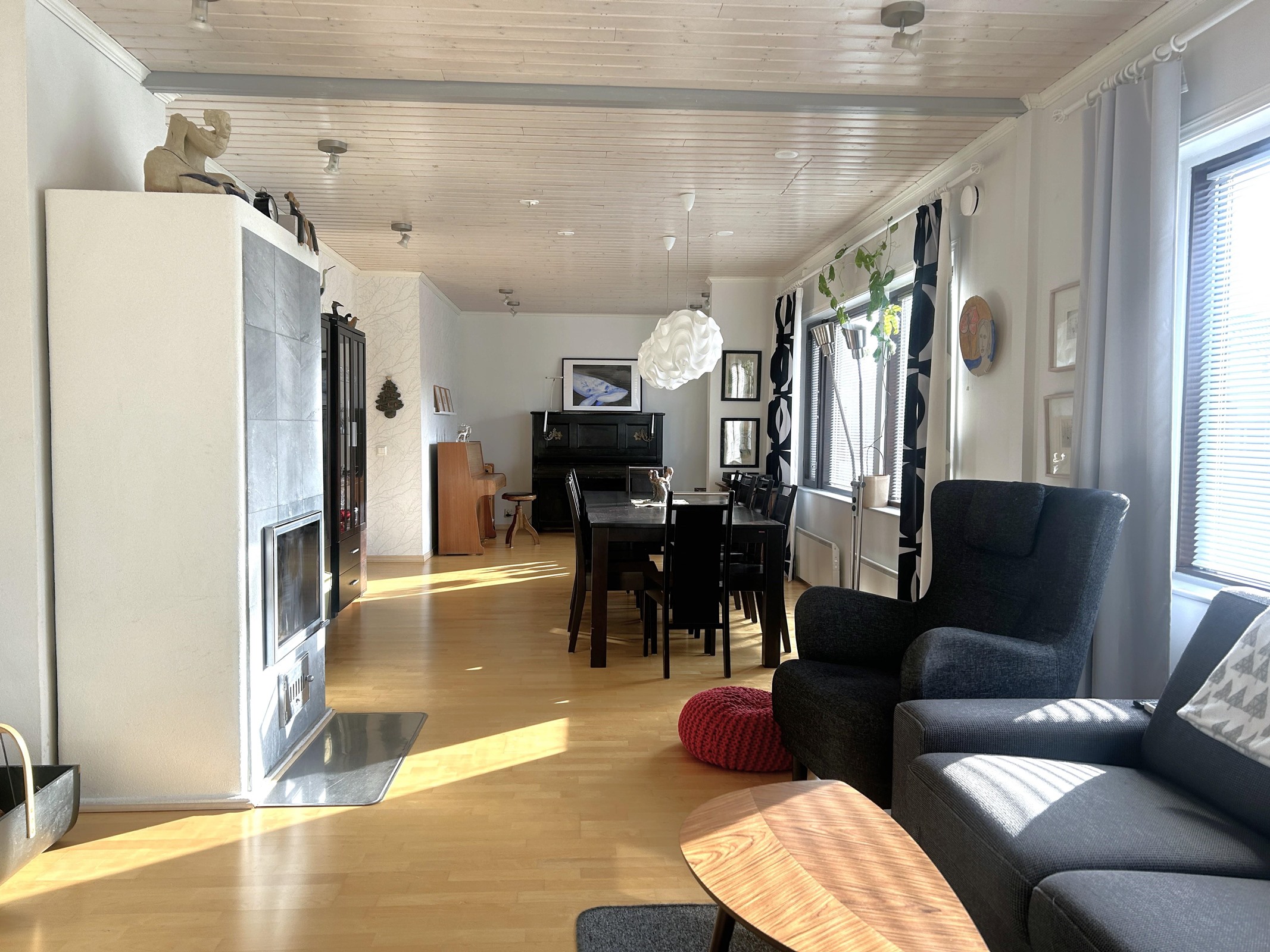 Näitä tiloja yhdistää upean suuri olohuone, joka tarjoaa täydelliset puitteet niin arjen oleskeluun kuin isompienkin juhlien järjestämiseen, tilaa riittää suuremmallekin joukolle. Alakerrassa on lisäksi yksi huone, joka sopii erinomaisesti vaikkapa työ- tai vierashuoneeksi.