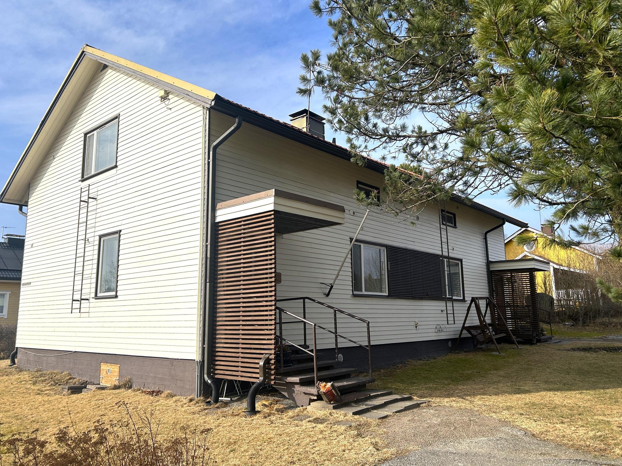 Tämä entinen kahden perheen omakotitalo on muutettu yhden perheen avaraksi ja toimivaksi kodiksi, jossa tilaa ja käytännöllisiä ratkaisuja riittää. Alakerrassa on kaksi sisäänkäyntiä: toinen johtaa suoraan tilavaan kodinhoitohuoneeseen, josta kulku jatkuu kätevästi kylpyhuoneeseen. Toinen sisäänkäynti sijaitsee talon vastakkaisella puolella, ja siltä puolelta löytyvät eteinen, keittiö sekä erillinen wc.