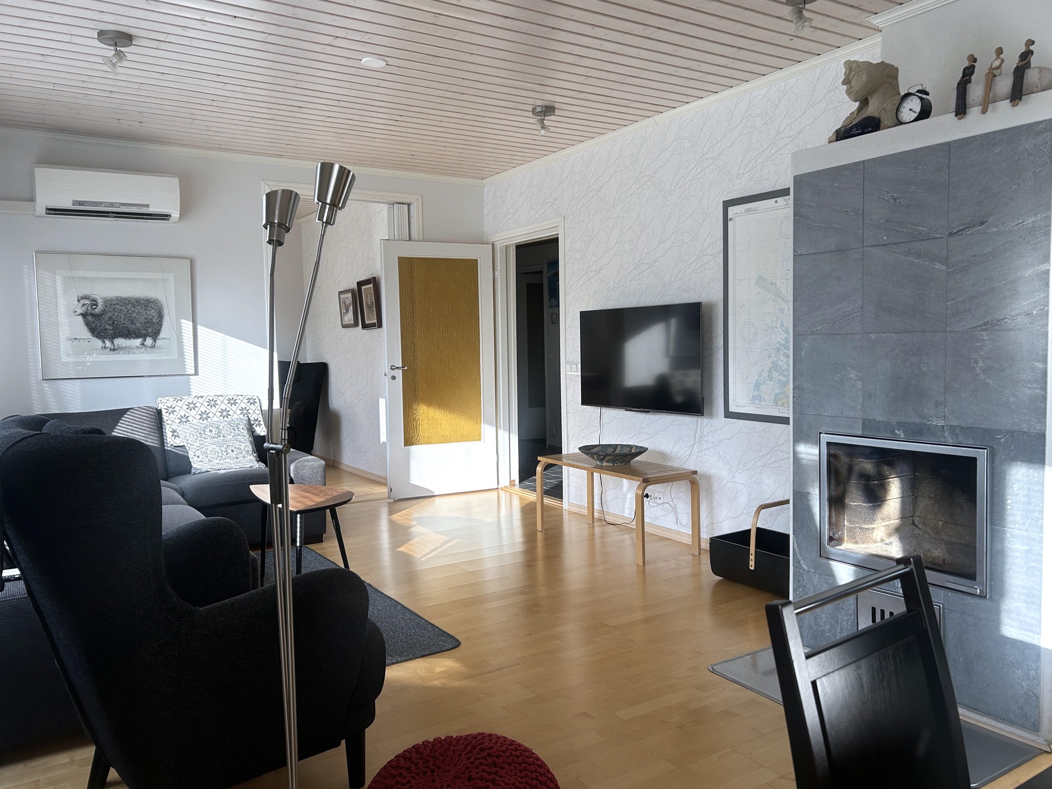 - Sähkö. Lisäksi ilmalämpöpumppu ja varaava takka sekä puuhella.