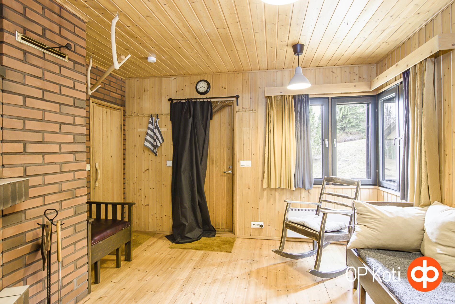 Pihapiiriä täydentää erillinen saunamökki puukiukaineen. Rakennuksessa on tilava saunatupa, jossa on minikeittiö ja tulisija, ja se soveltuu mainiosti myös vieraiden majoittamiseen. Saunamökissä on lattialämmitys, joten se on käytettävissä ympäri vuoden.