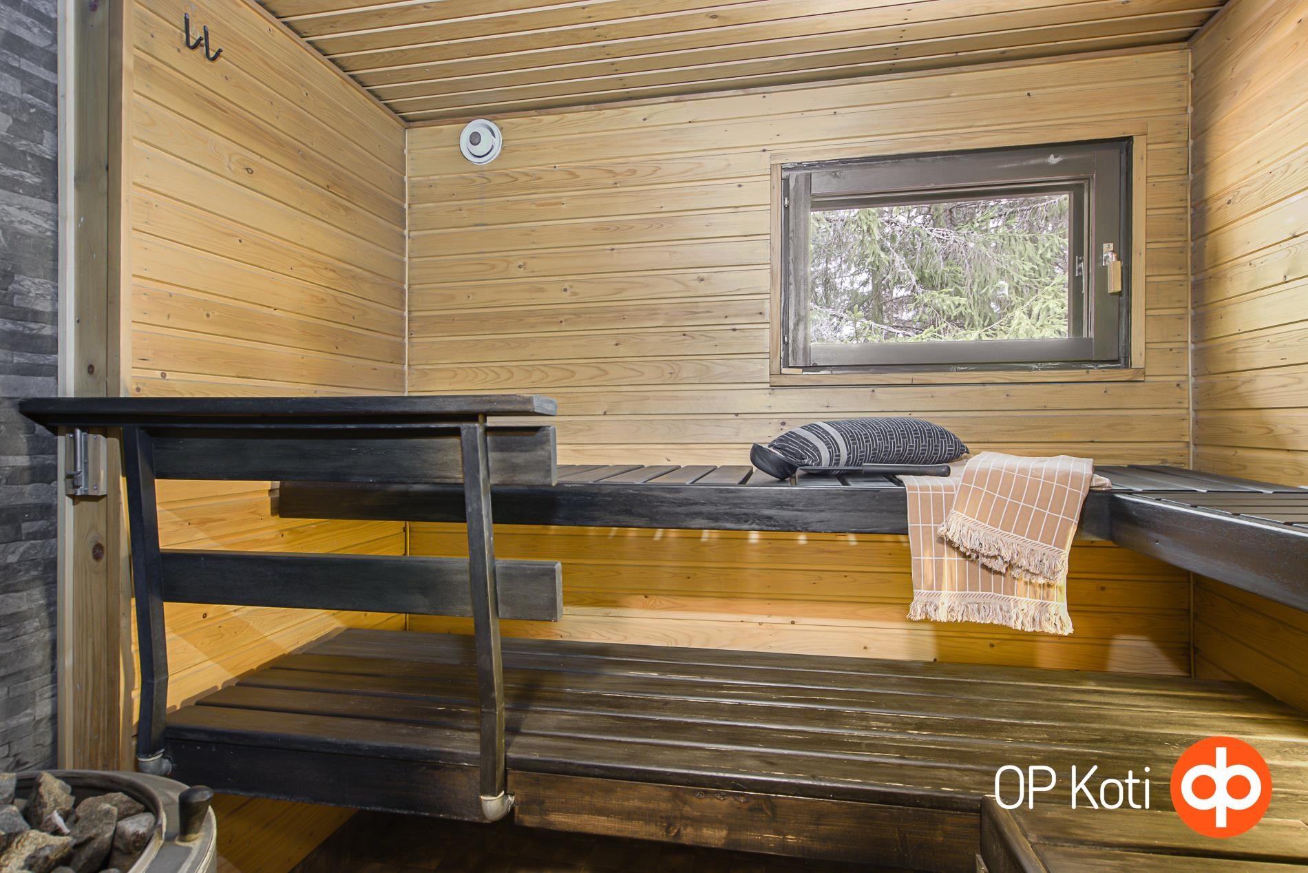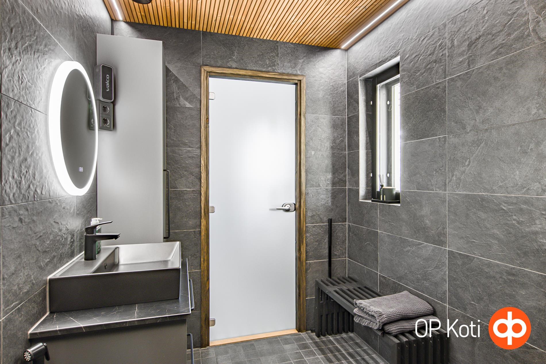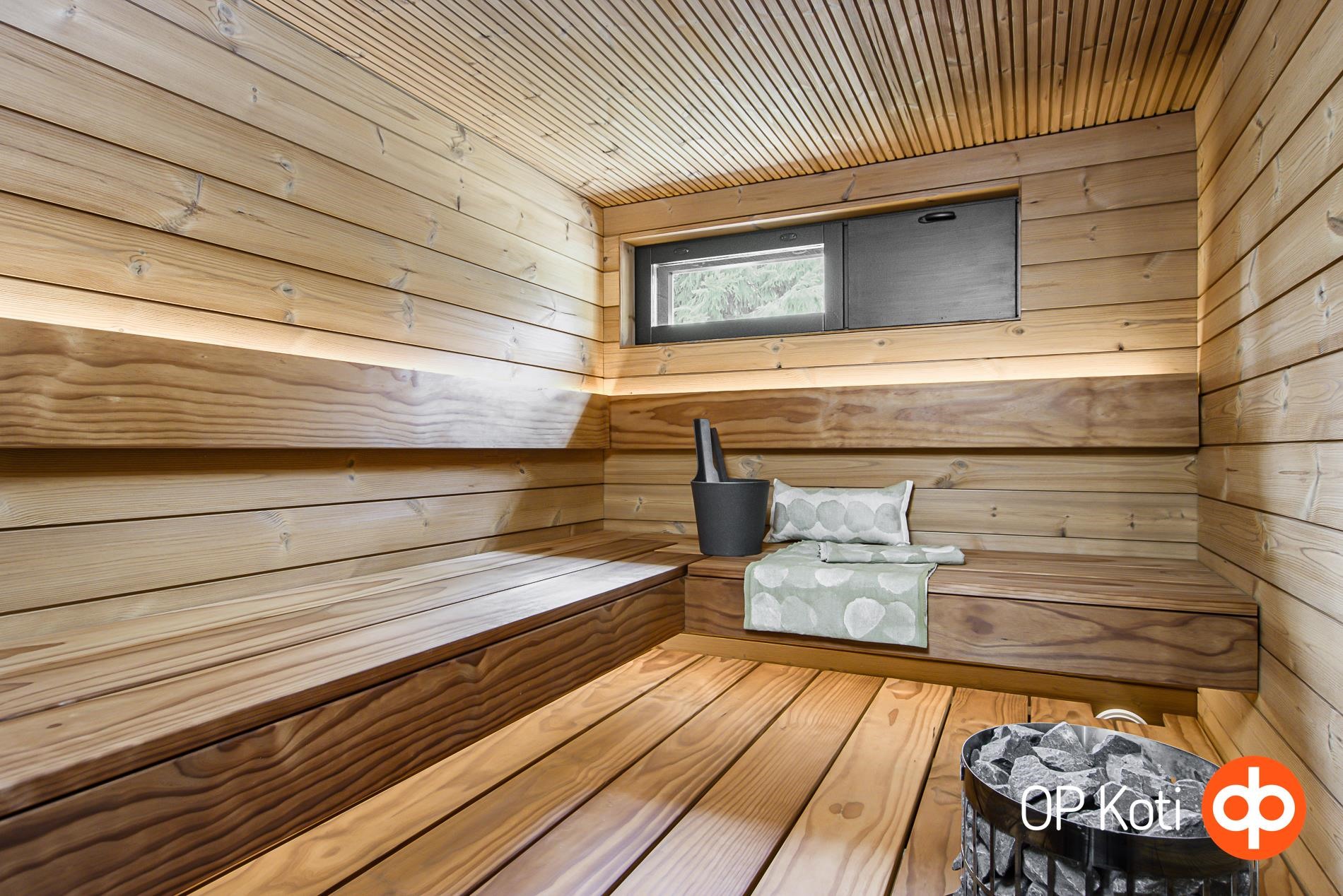 - Sauna, sähkökiuas (etäohjaus), kylpyhuone, erillinen wc, suihku (sadesuihku), peilikaappi, allaskaappi, pesukoneliitäntä, lattialämmitys, kiinteät valaisimet (säädettävät).
