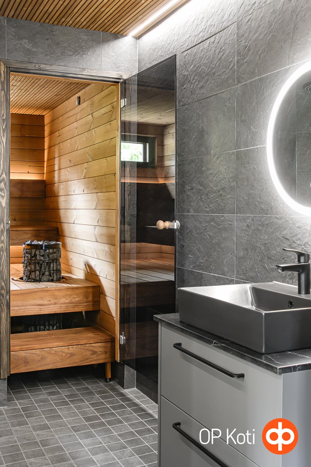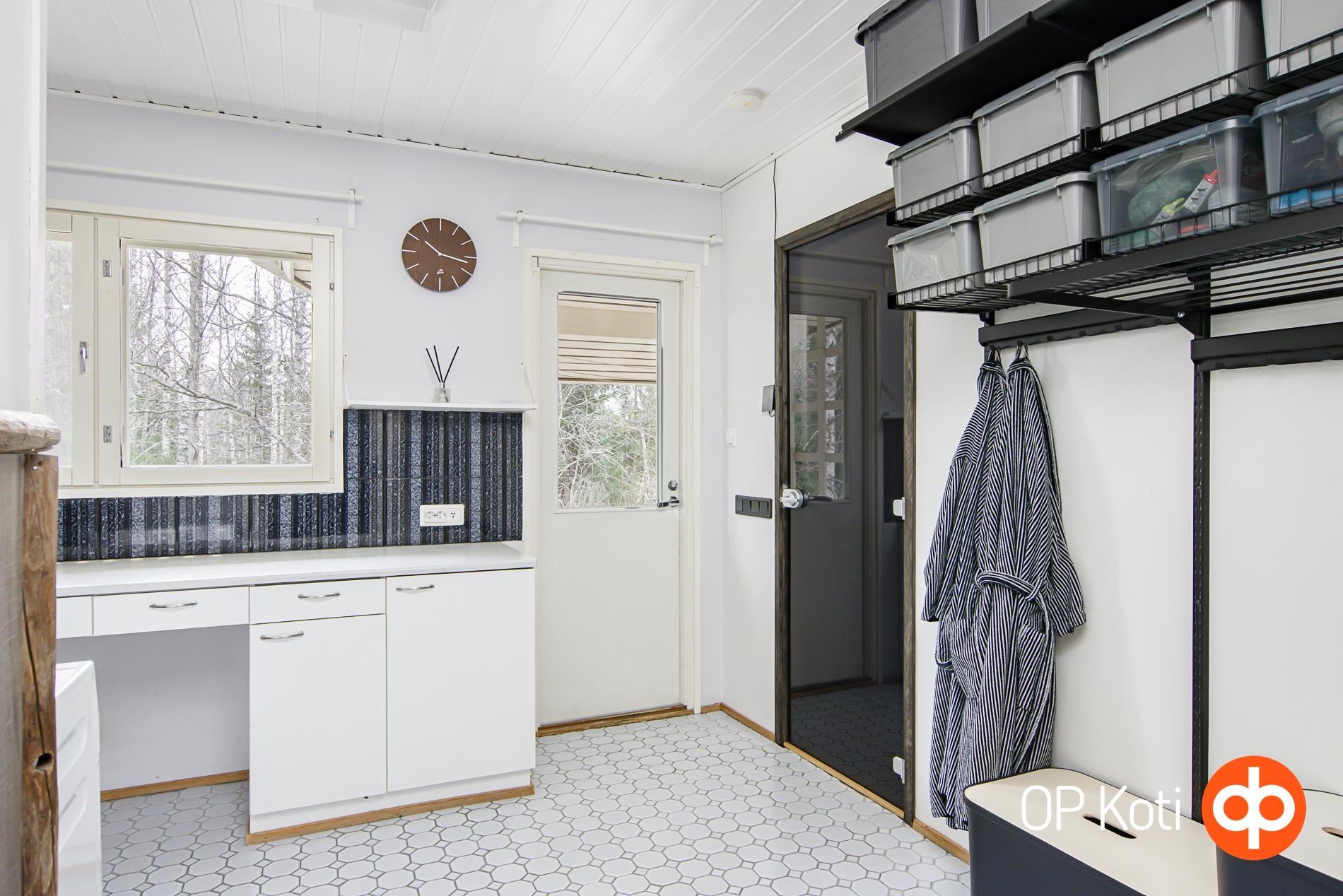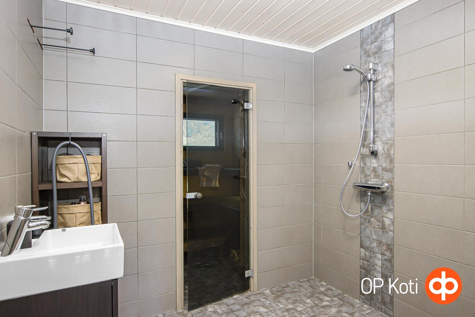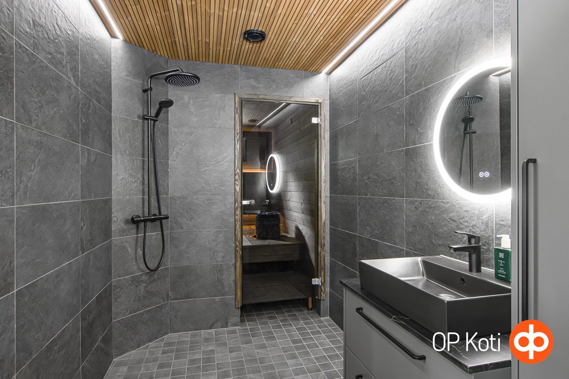 - Sauna, sähkökiuas (etäohjaus), kylpyhuone, erillinen wc, suihku (sadesuihku), peilikaappi, allaskaappi, pesukoneliitäntä, lattialämmitys, kiinteät valaisimet (säädettävät).