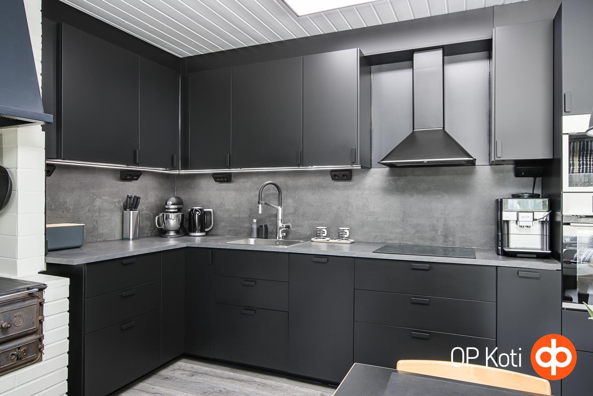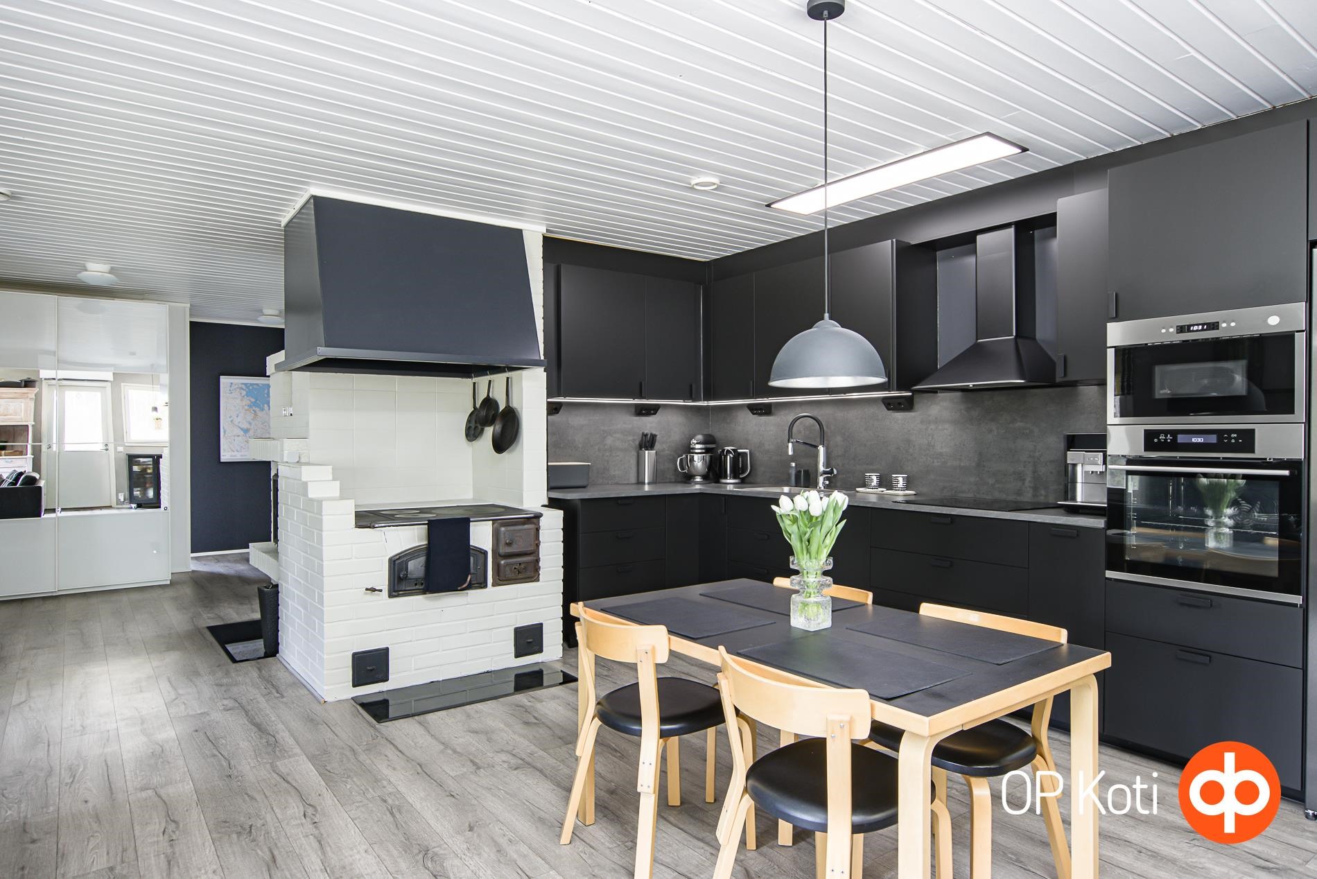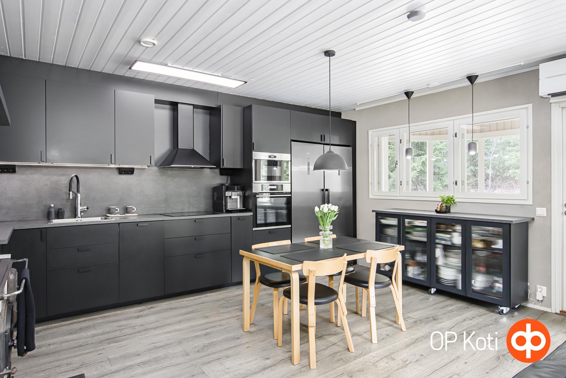 - Jääkaappi (AEG musta harjattu teräs), pakastekaappi (AEG musta harjattu teräs), erillisuuni, induktioliesi, liesituuletin, mikroaaltouuni (intergroitu), astianpesukone (integroitu, hanassa sähköinen vesisulku apk:lle), kaapistot, kiinteät valaisimet (säädettävät).