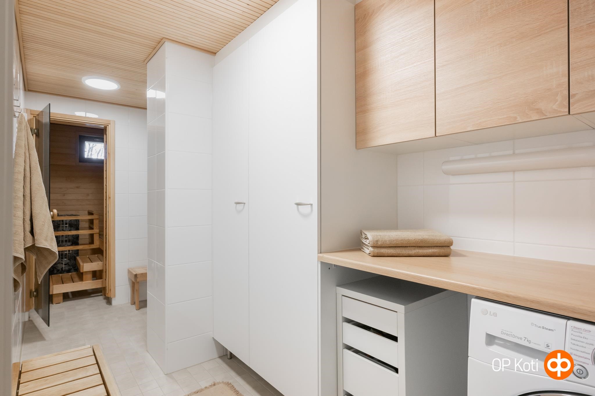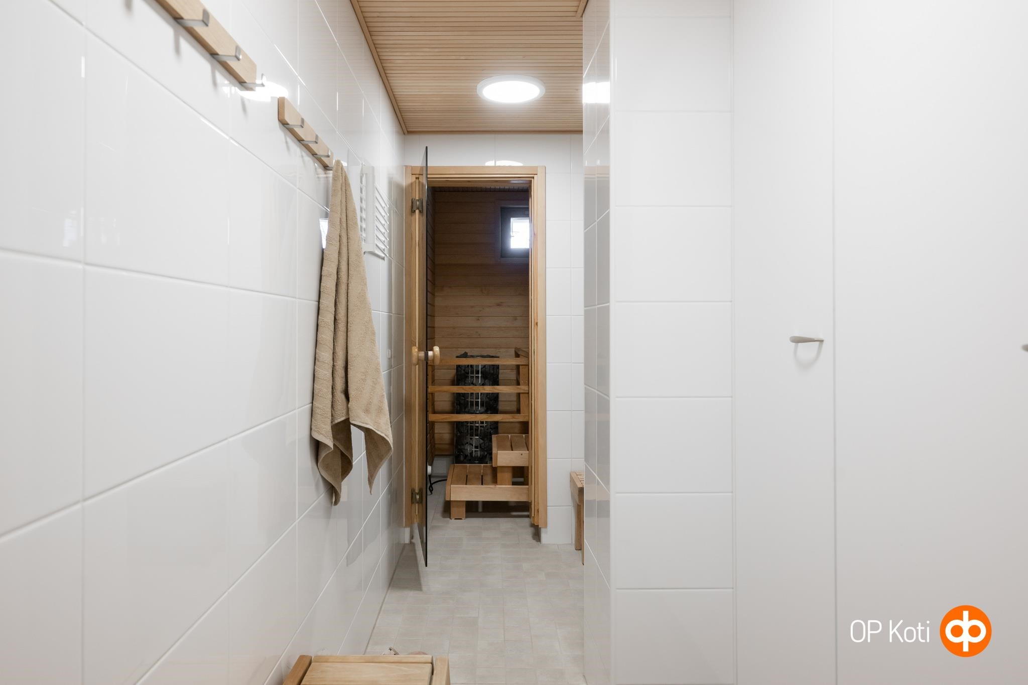 - Sauna, sähkökiuas, kylpyhuone, erillinen wc, suihku, peilikaappi wc:ssa, kaapit wc:ssa, allaskaappi wc:ssa, pesukoneliitäntä khh:ssa, lattialämmitys kph:ssa ja khh:ssa, kiinteät valaisimet.