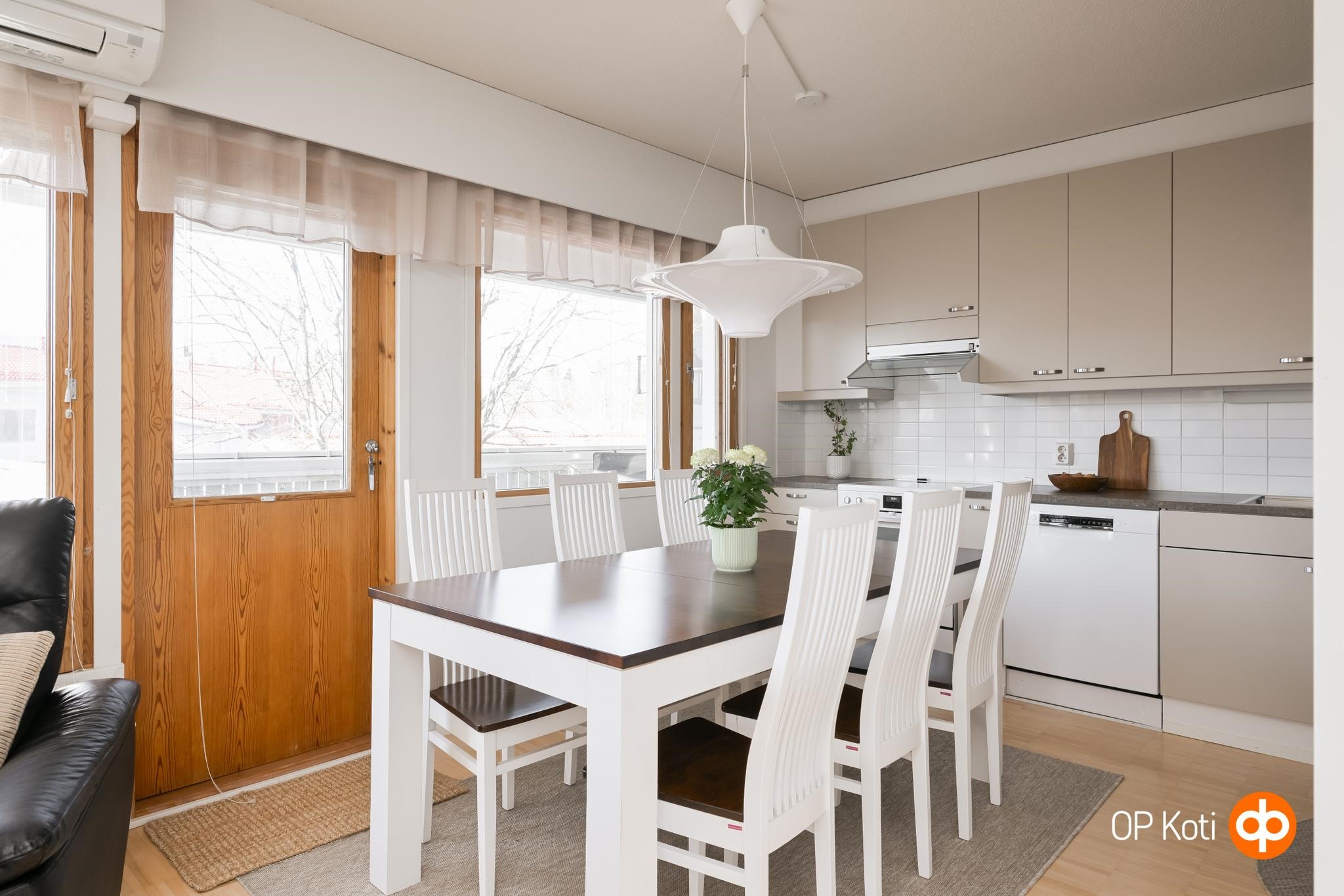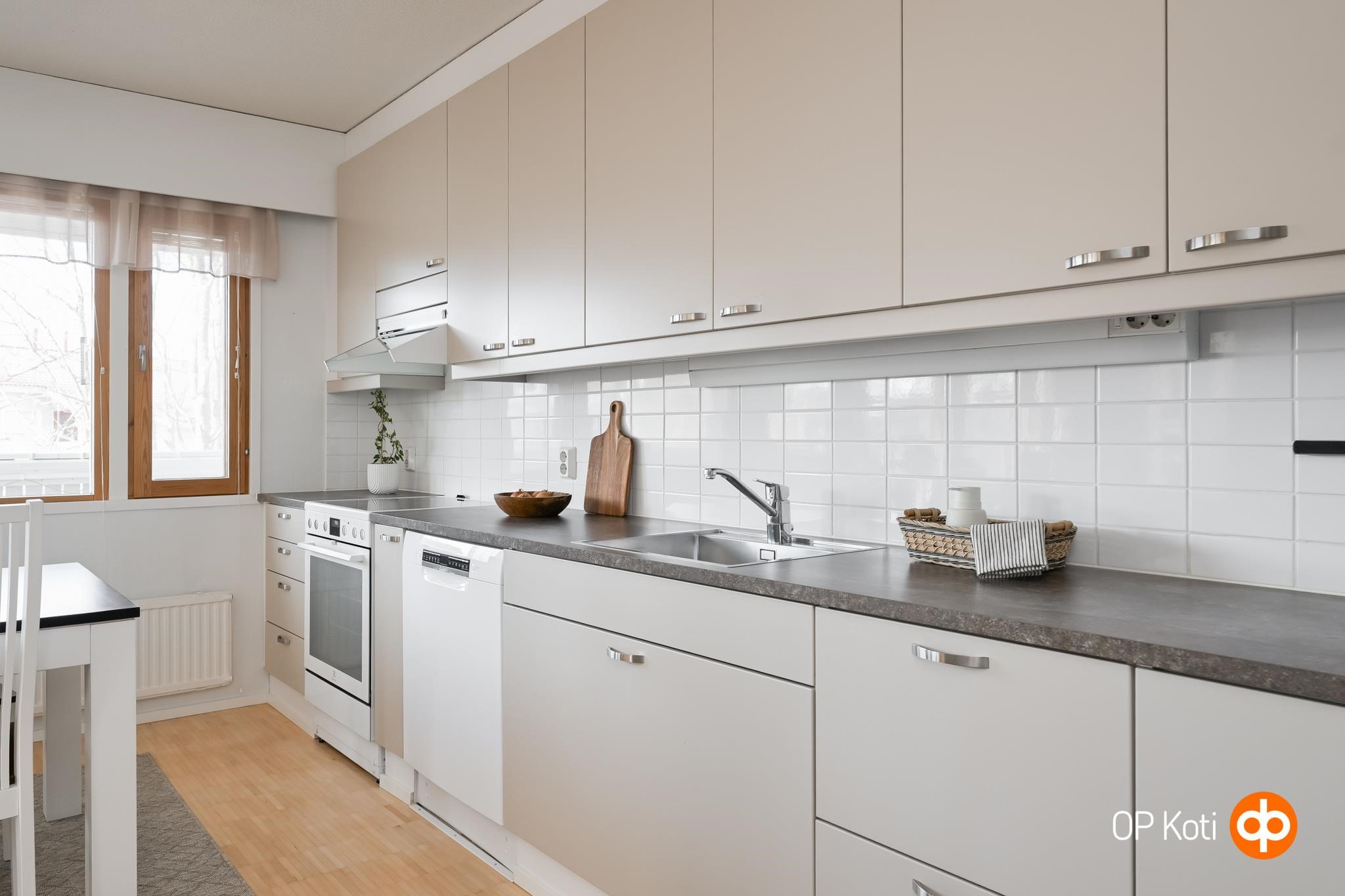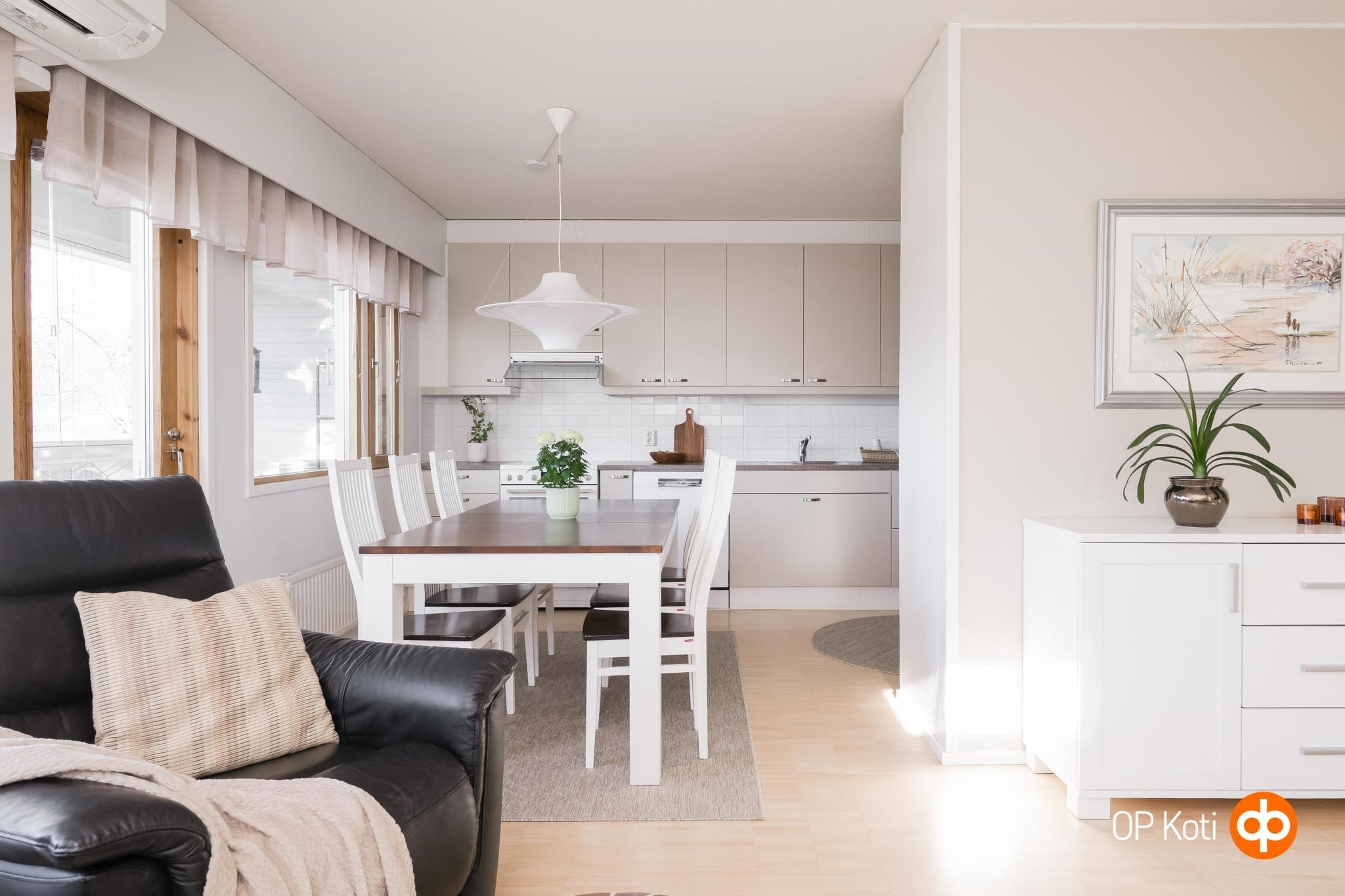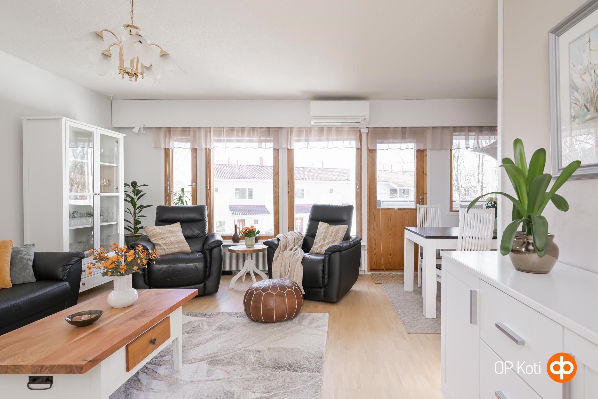 Tilaa tässä kodissa on juuri sopivasti. Olohuone ja keittiö yhdistyvät toisiinsa ruokailutilan kautta ja luovat yhtenäisen ja avaran tilan oleskeluun ja yhdessäoloon. Reilusti lisätilaa tähän kokonaisuuteen tuo vielä iso lasitettu parveke. Täällä muuten viihtyy taatusti joko aamukahvilla tai iltateellä! Pari makuuhuonetta täydentää kokonaisuuden. Sujuvan arjen toiminnot takaa väljät ja tyylikkäät pesutilat kodinhoitotiloineen.