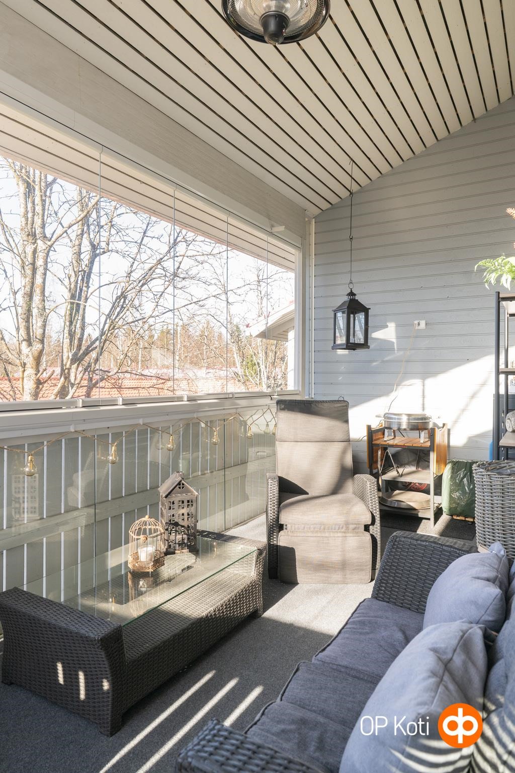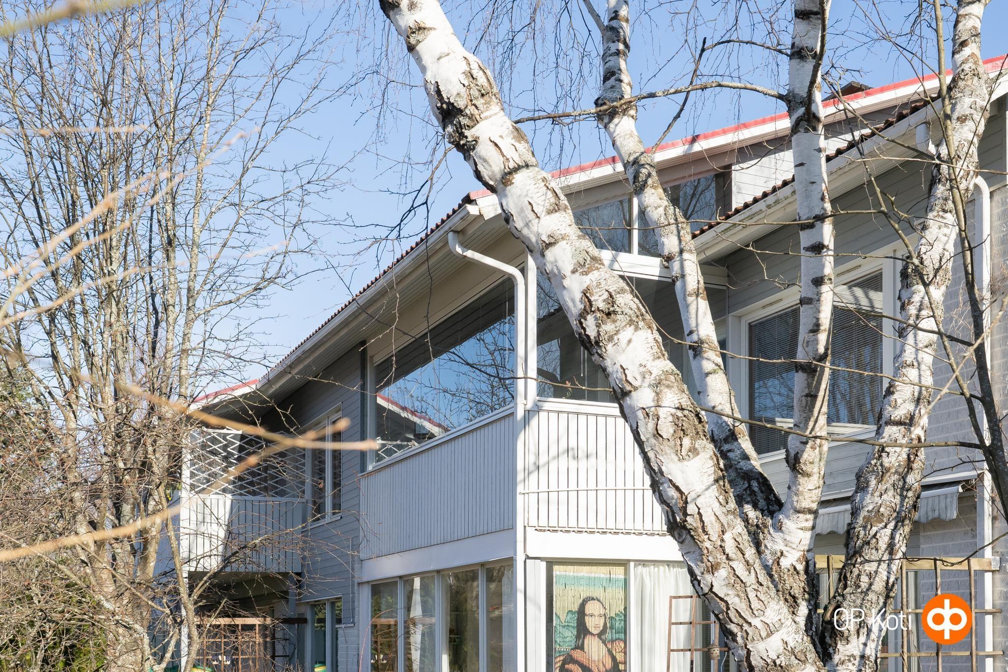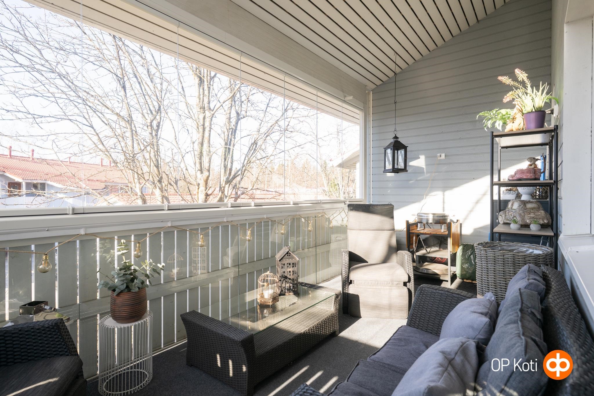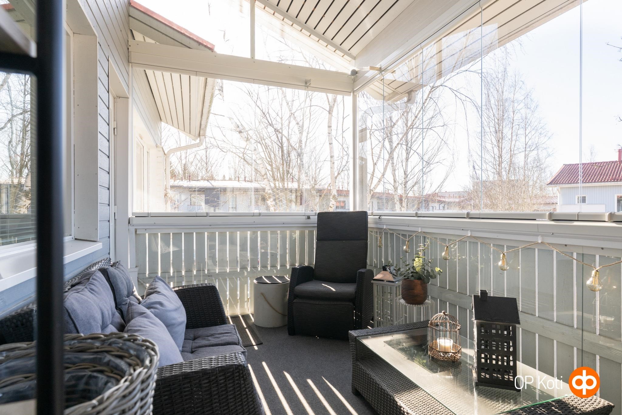 - Suojaisa lasitettu iso parveke lounaan suuntaan. Keittiön ja olohuoneen ikkunat lounaaseen, makuuhuoneiden ikkunat koilliseen.