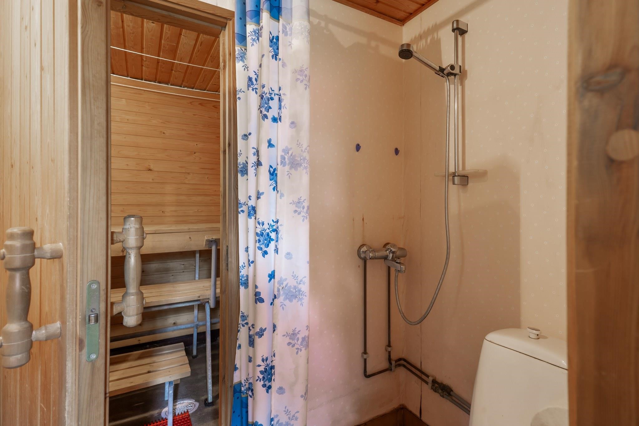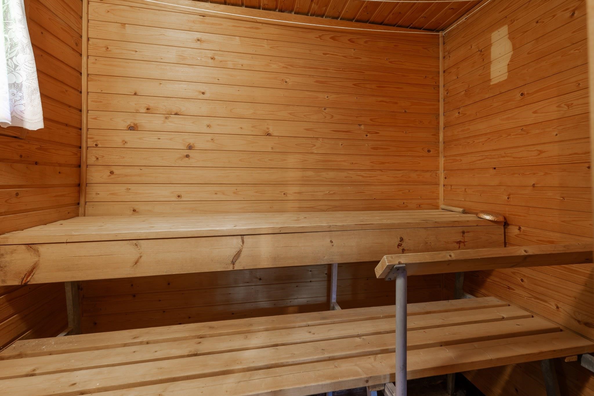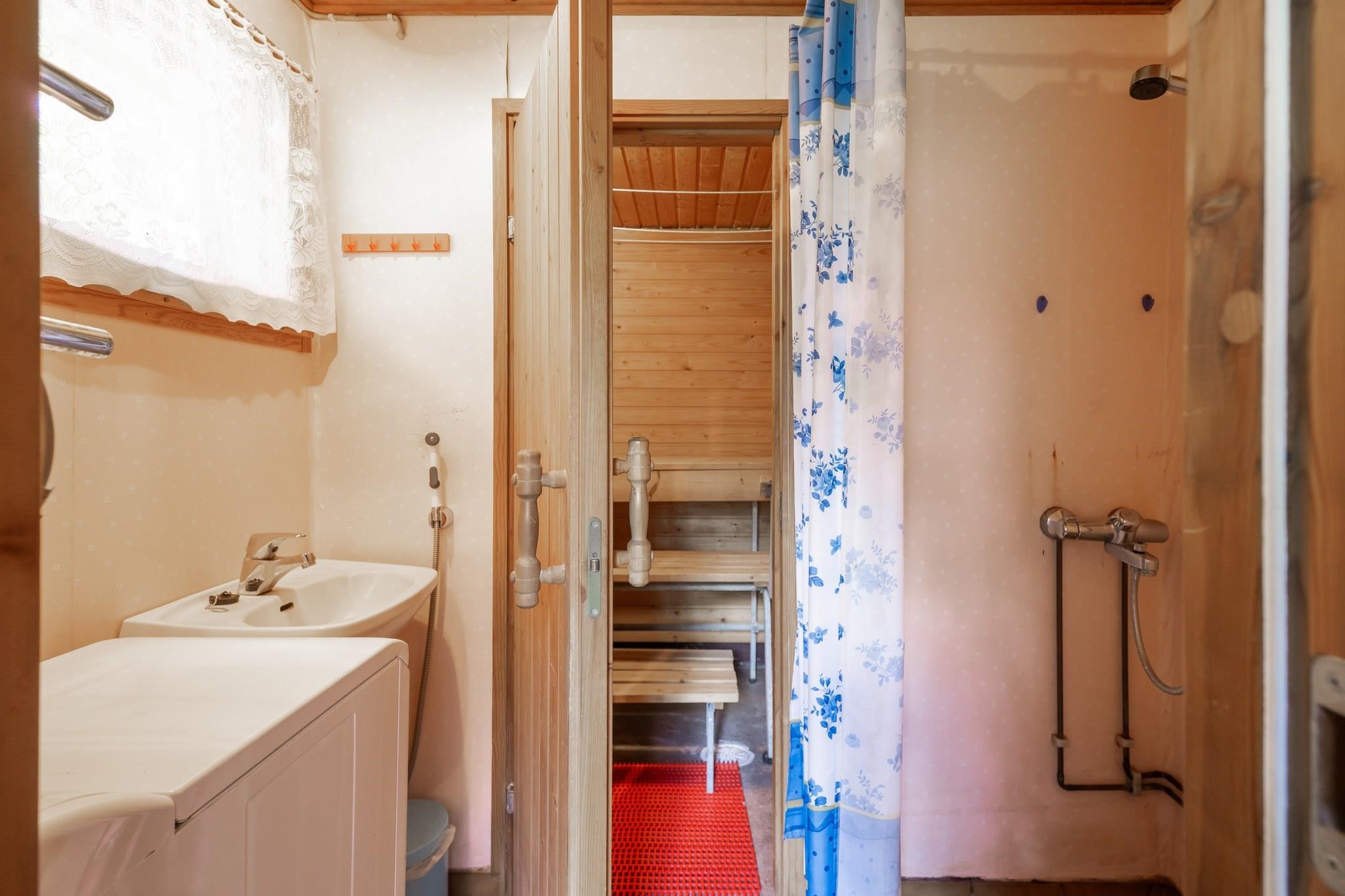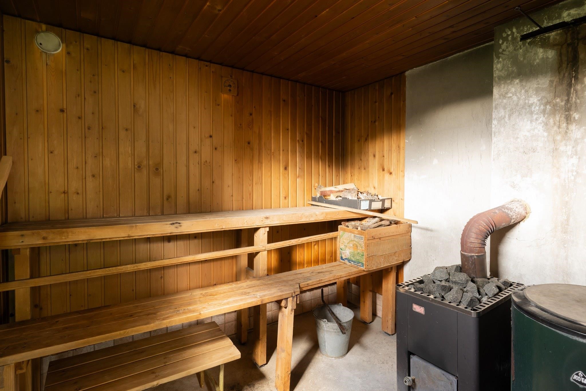 - Sauna, sähkökiuas, kylpyhuone, suihku, kiinteät valaisimet.