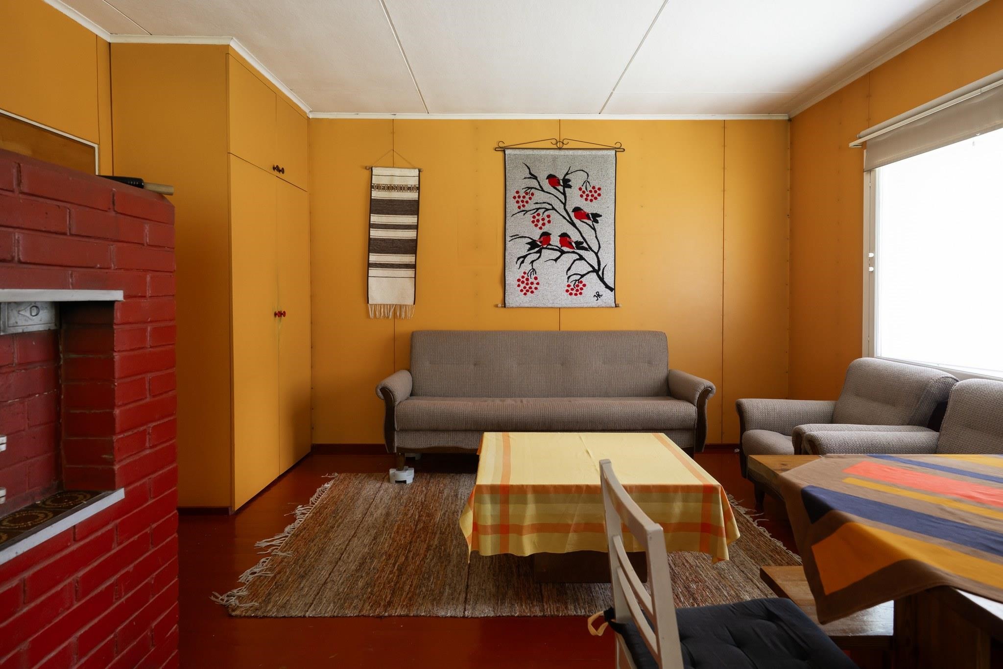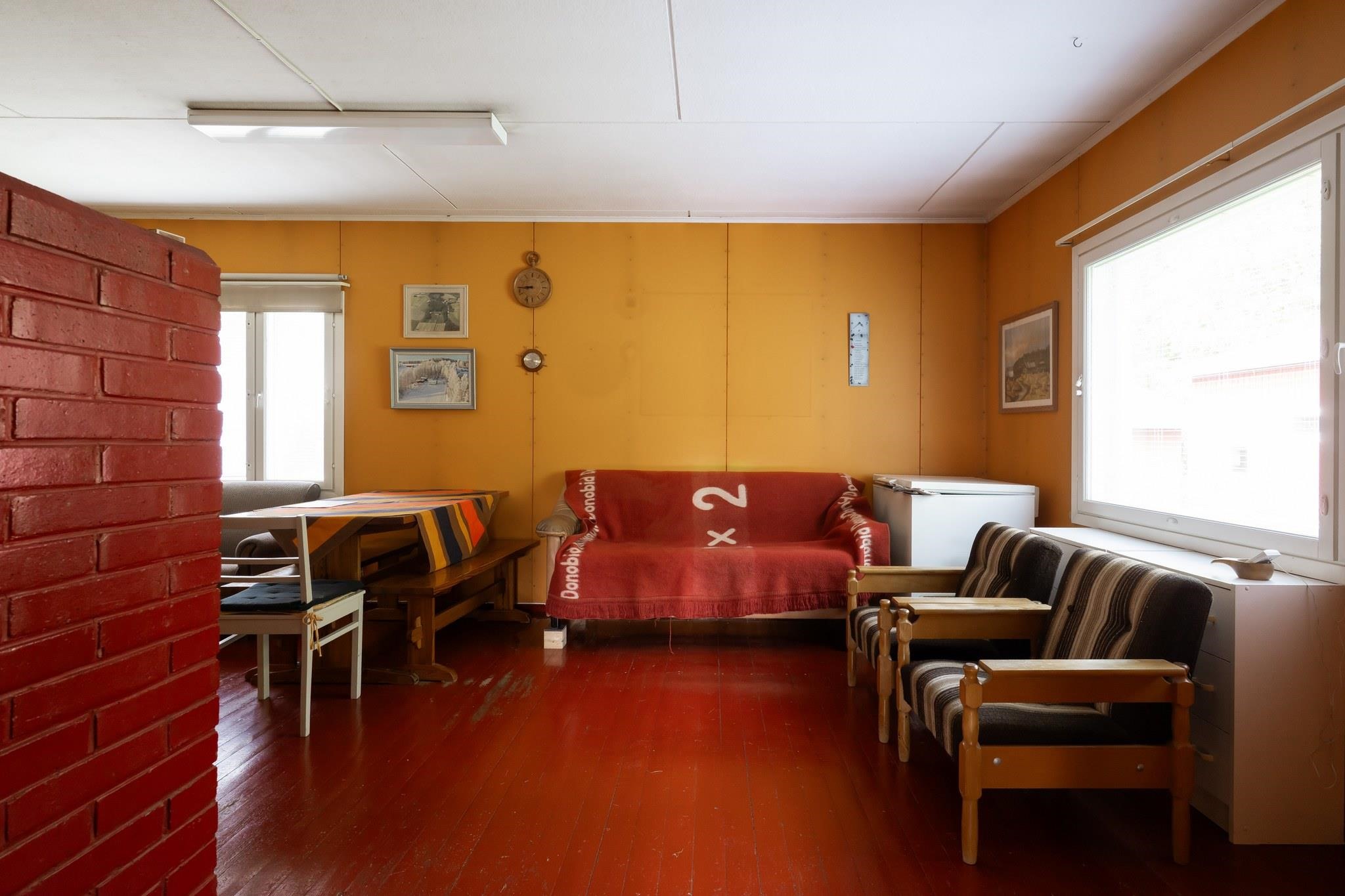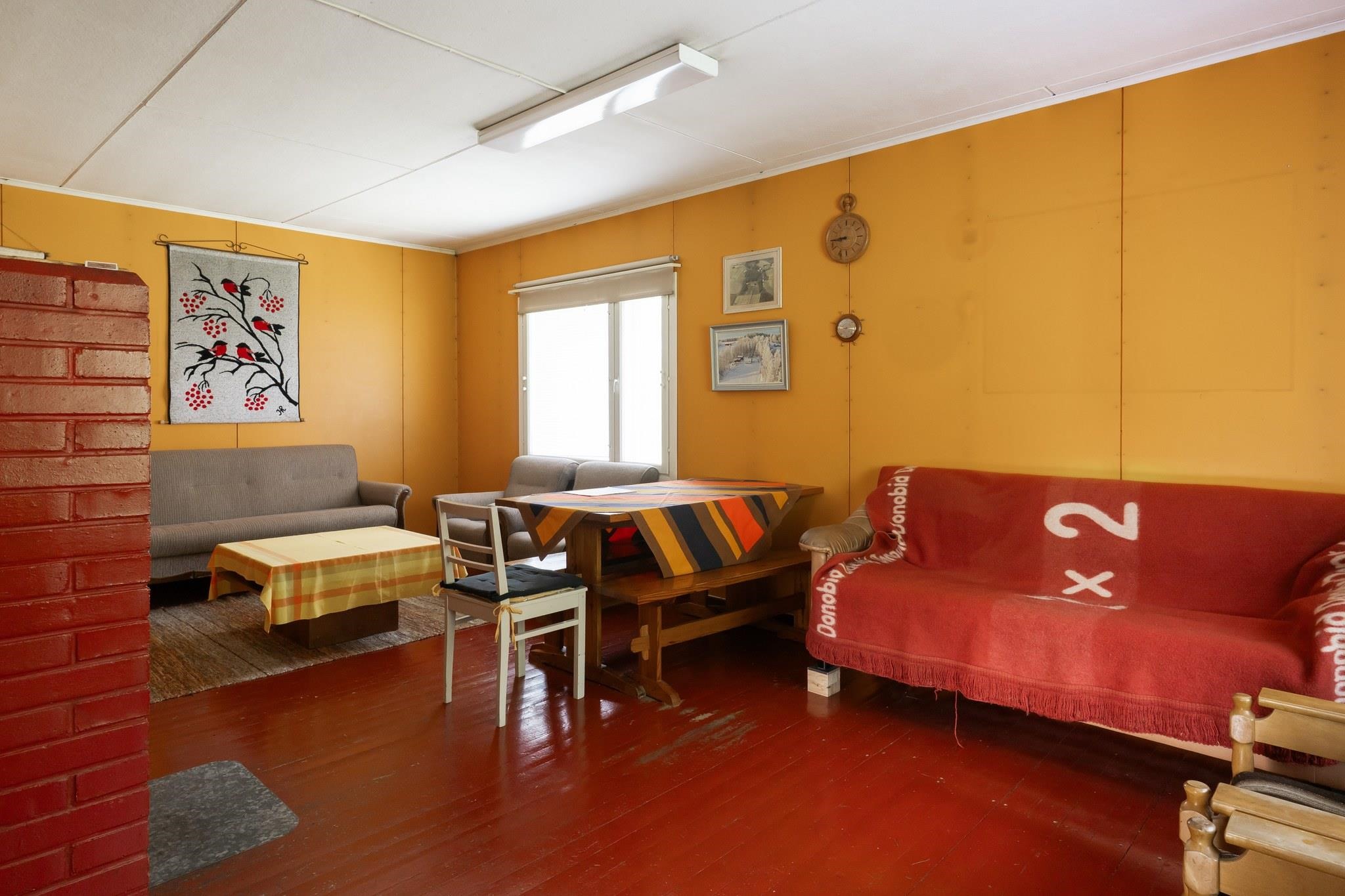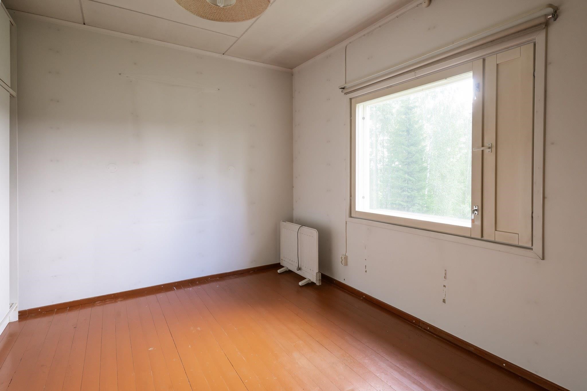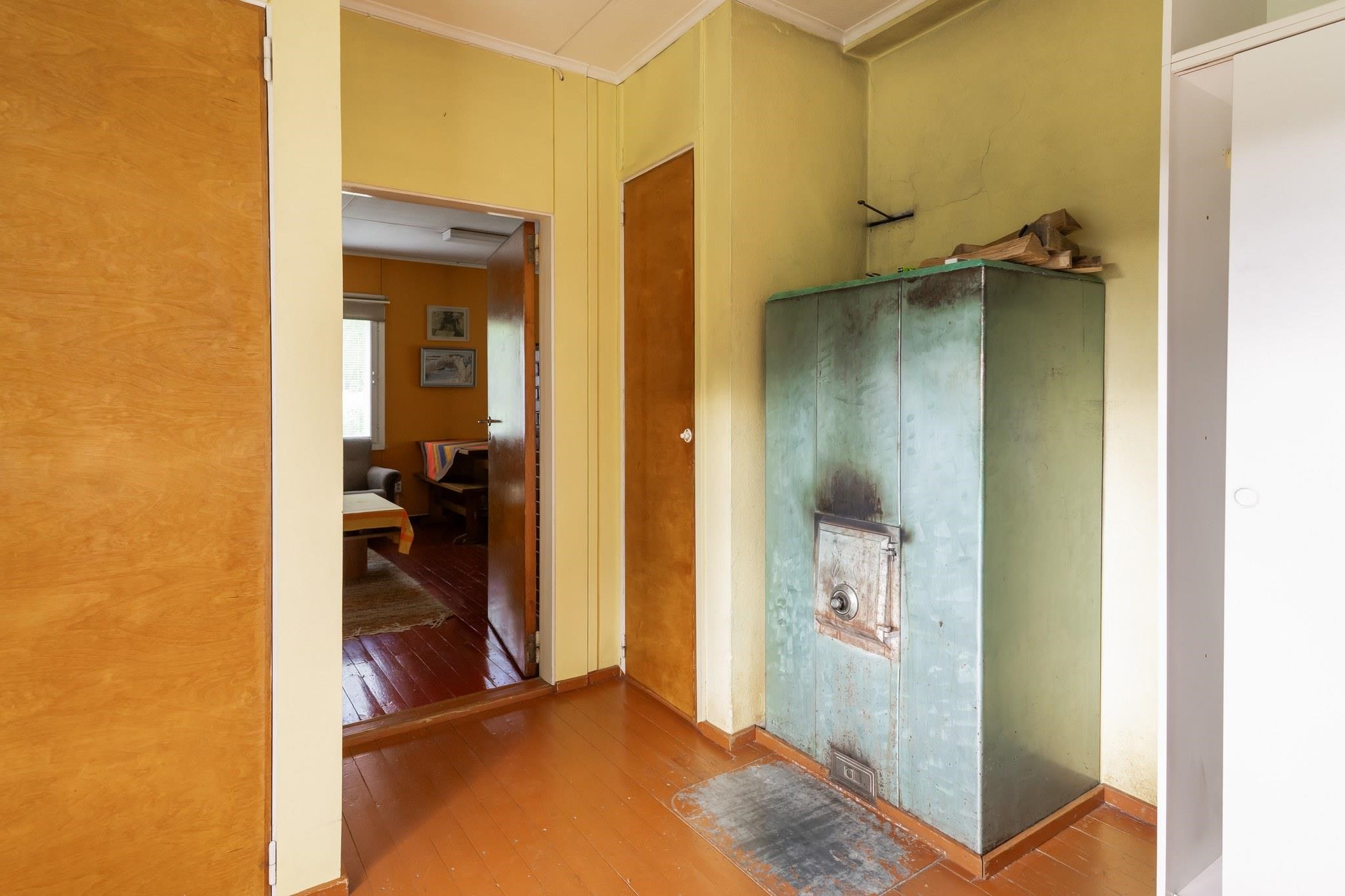 Keittiö: Lattia puuta, seinät maalia. Olohuone: Lattia puuta, seinät maalia. Makuuhuone 1: Lattia puuta, seinät maalia. Sauna: Lattia betonia, seinät puuta. Kylpyhuone: Lattia betonia, seinät muovitapettia. Eteinen: Lattia puuta, seinät maalia.