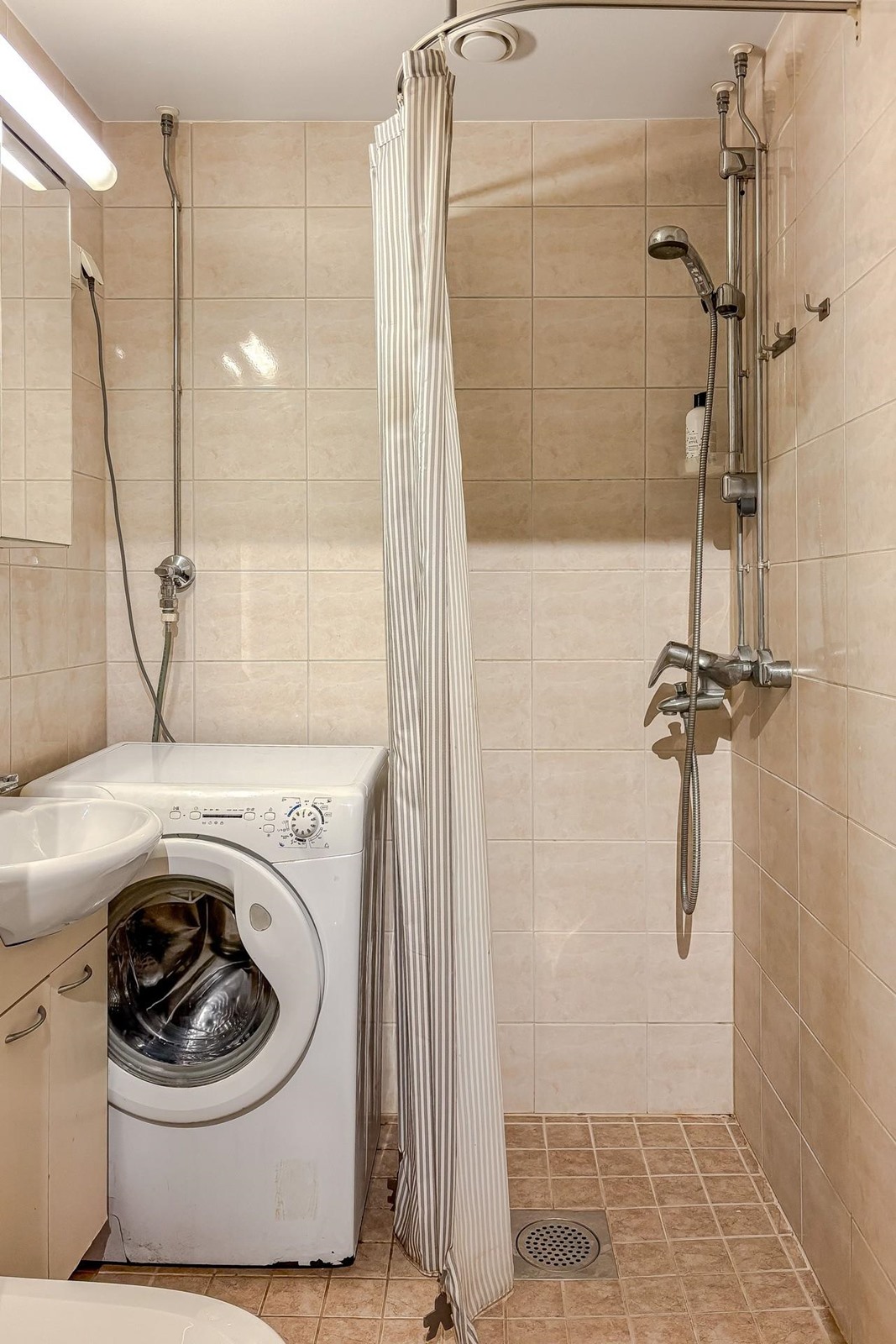 - Kylpyhuone, suihku, peilikaappi, allaskaappi, pesukoneliitäntä, lattialämmitys, kiinteät valaisimet.