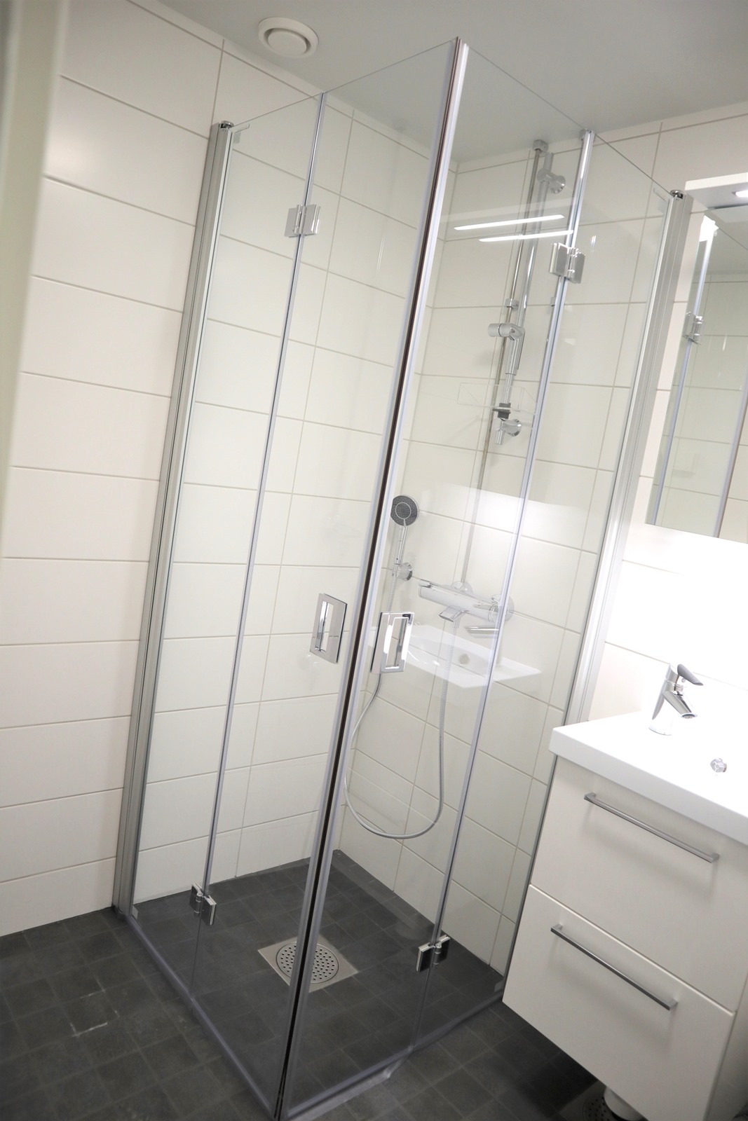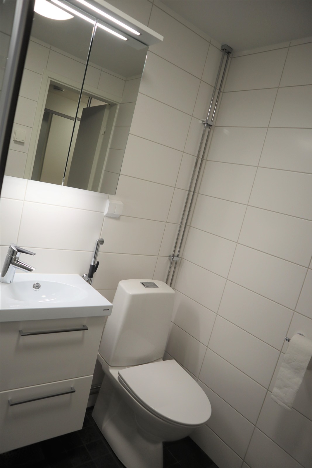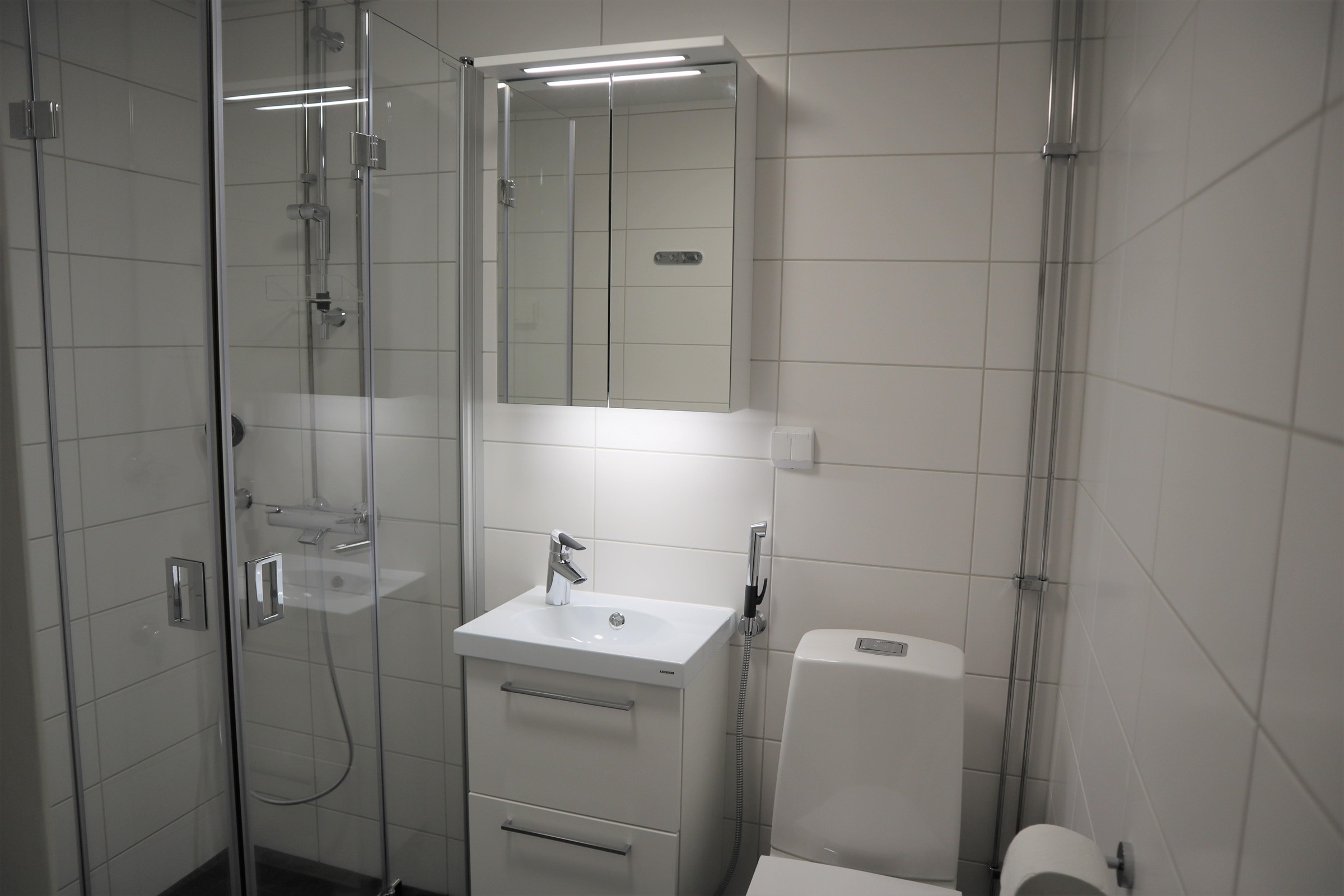 - Suihku, suihkuseinä suihkunurkkaus, peilit, allaskaappi, pesukoneliitäntä, lattialämmitys.