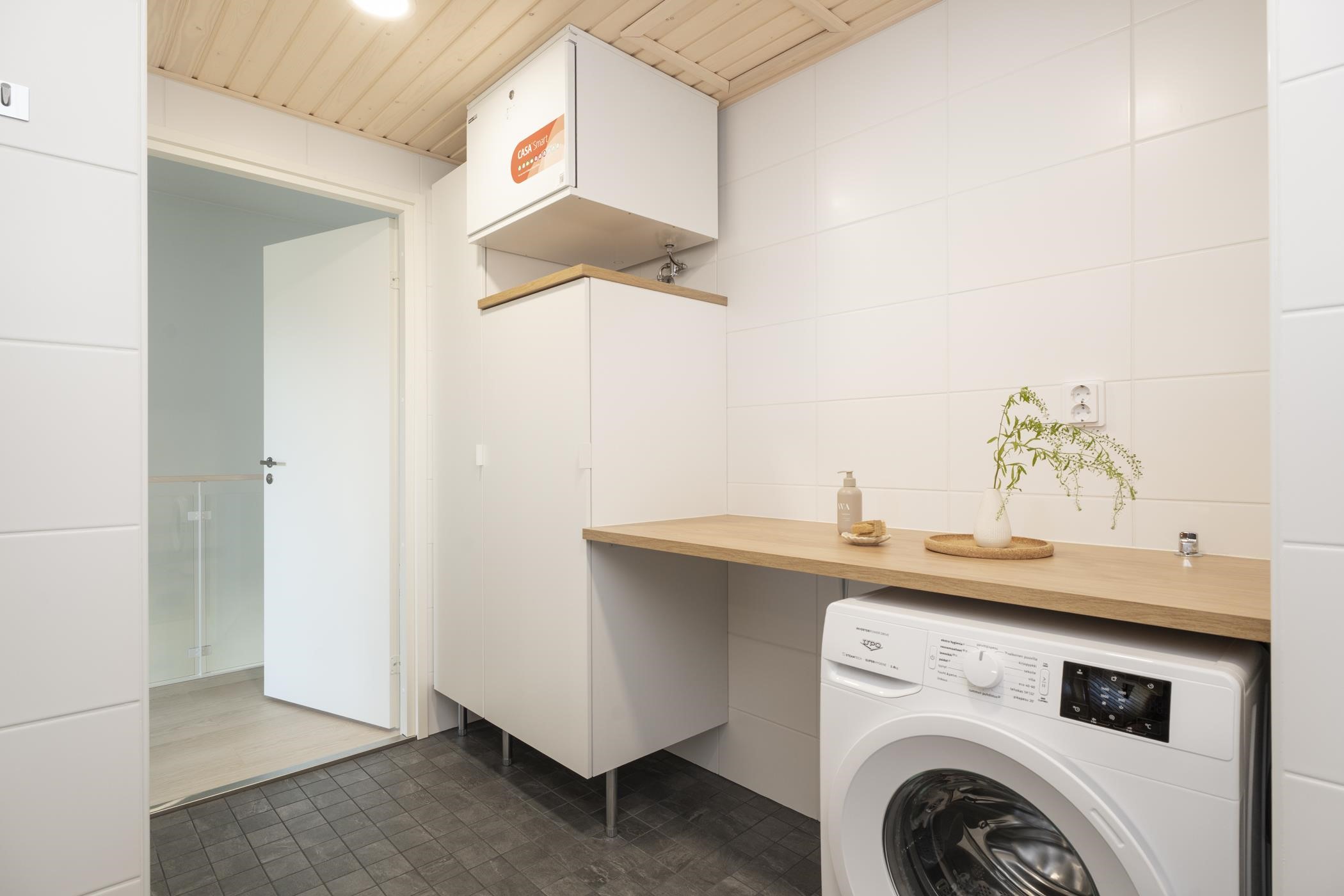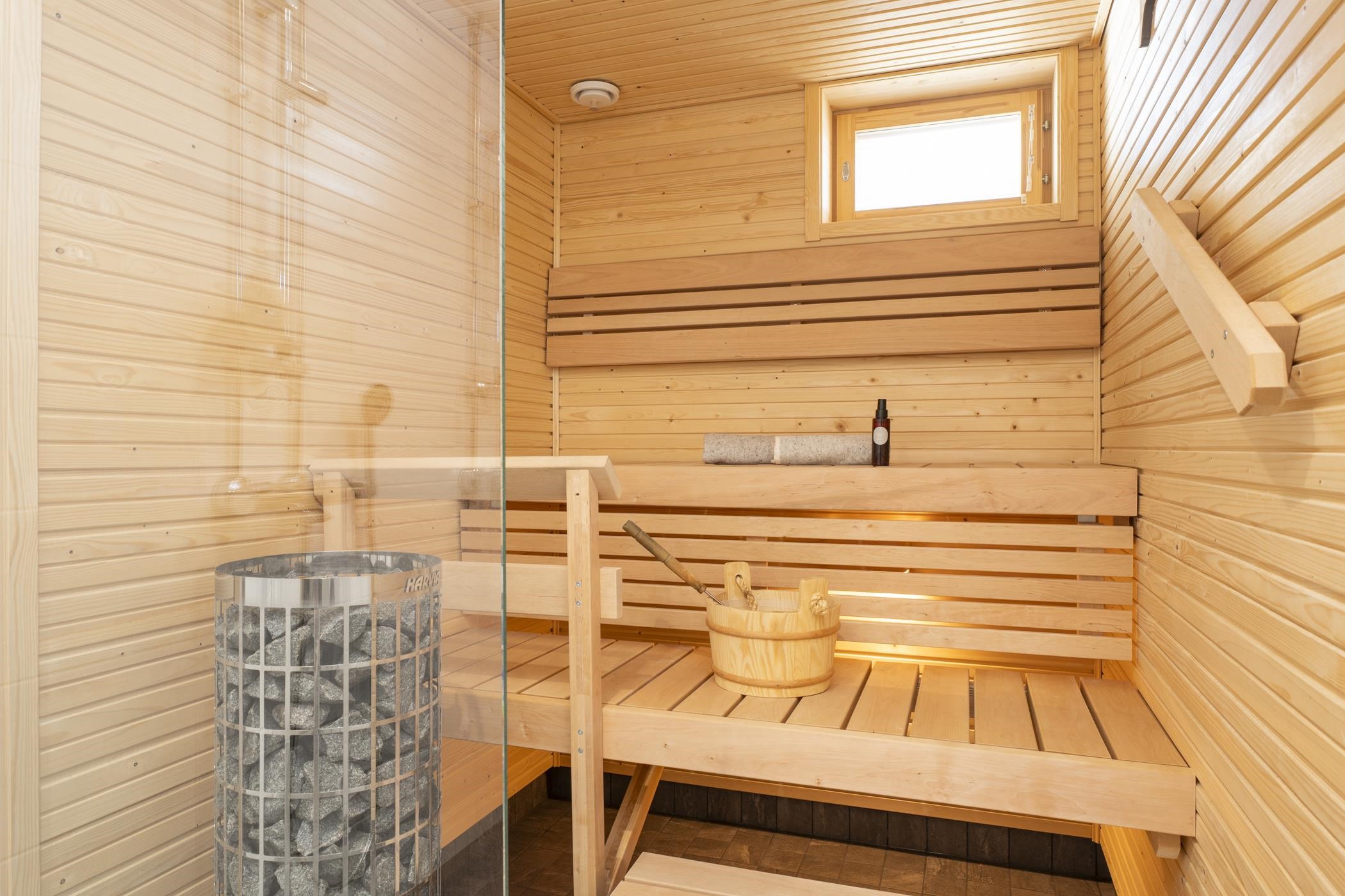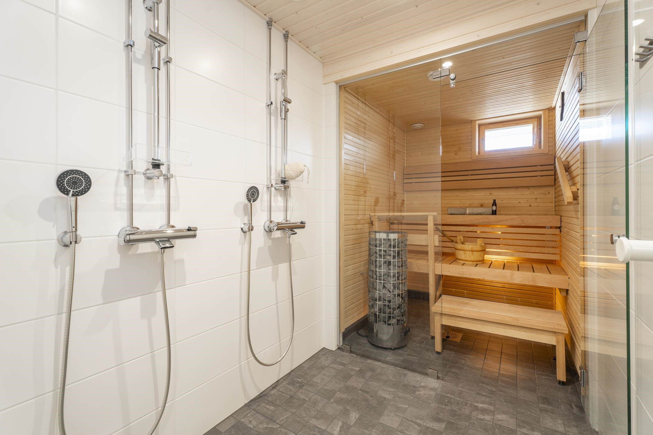 - Saunassa sähkökiuas. Kylpyhuone: 2 x suihkua, kiinteät valaisimet, lattialämmitys. Erillinen wc yläkerta ja alakerta: peilikaappi, allaskaappi, kiinteät valaisimet, lattialämmitys. Kodinhoitohuone: kaapit, pesukoneliitäntä, kiinteät valaisimet, lattialämmitys.
