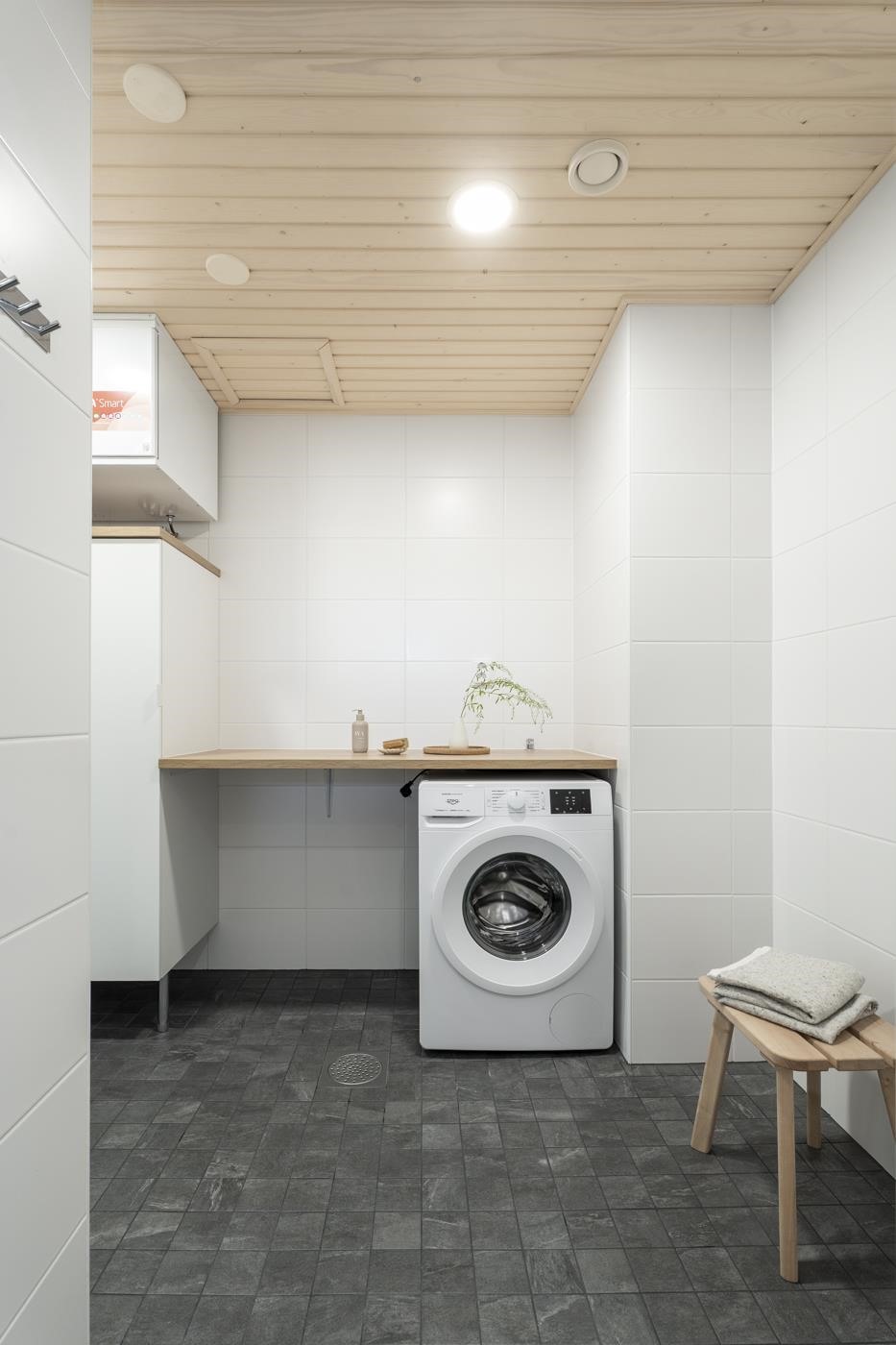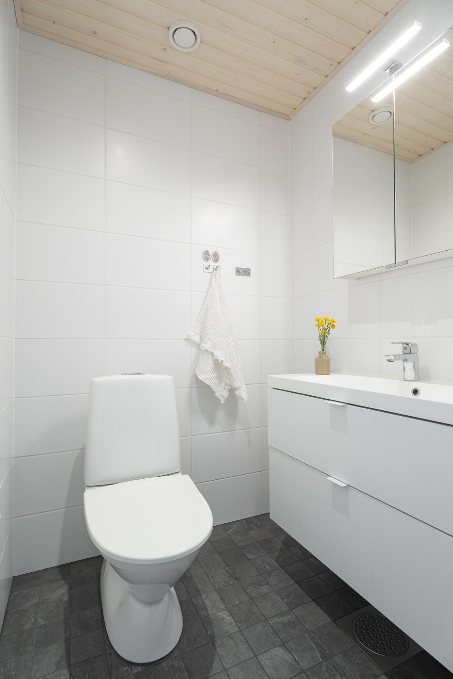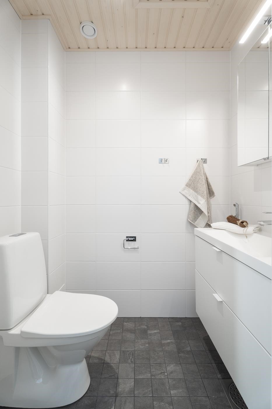 - Saunassa sähkökiuas. Kylpyhuone: 2 x suihkua, kiinteät valaisimet, lattialämmitys. Erillinen wc yläkerta ja alakerta: peilikaappi, allaskaappi, kiinteät valaisimet, lattialämmitys. Kodinhoitohuone: kaapit, pesukoneliitäntä, kiinteät valaisimet, lattialämmitys.