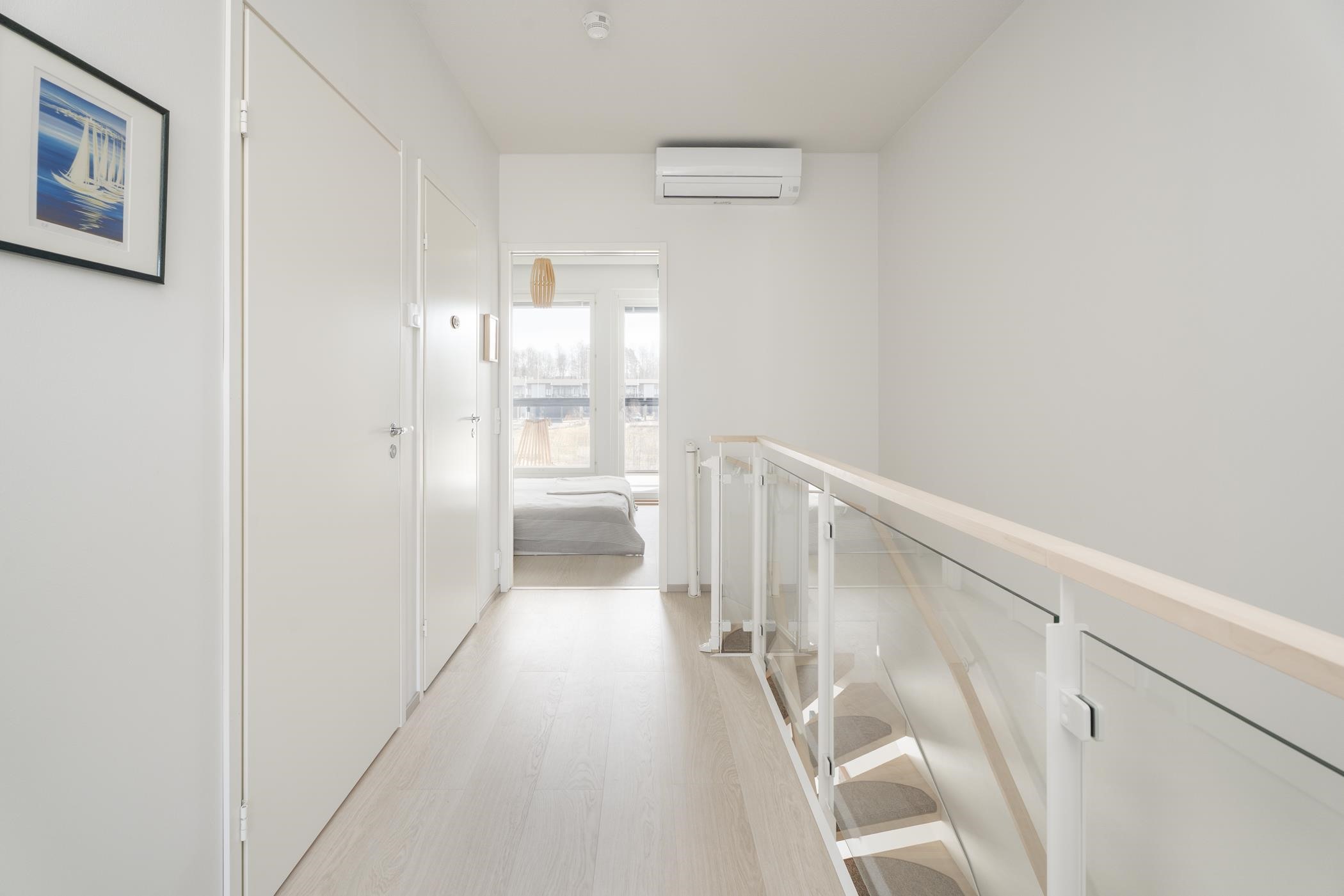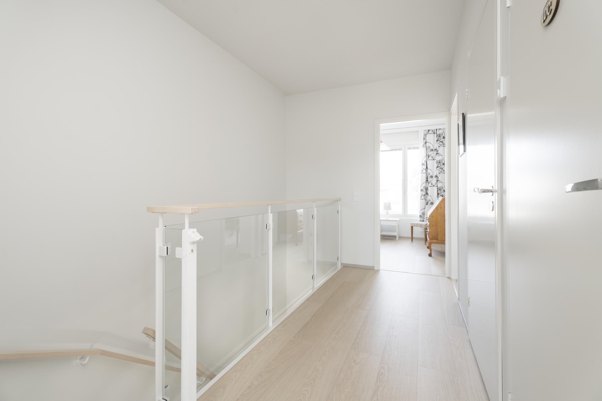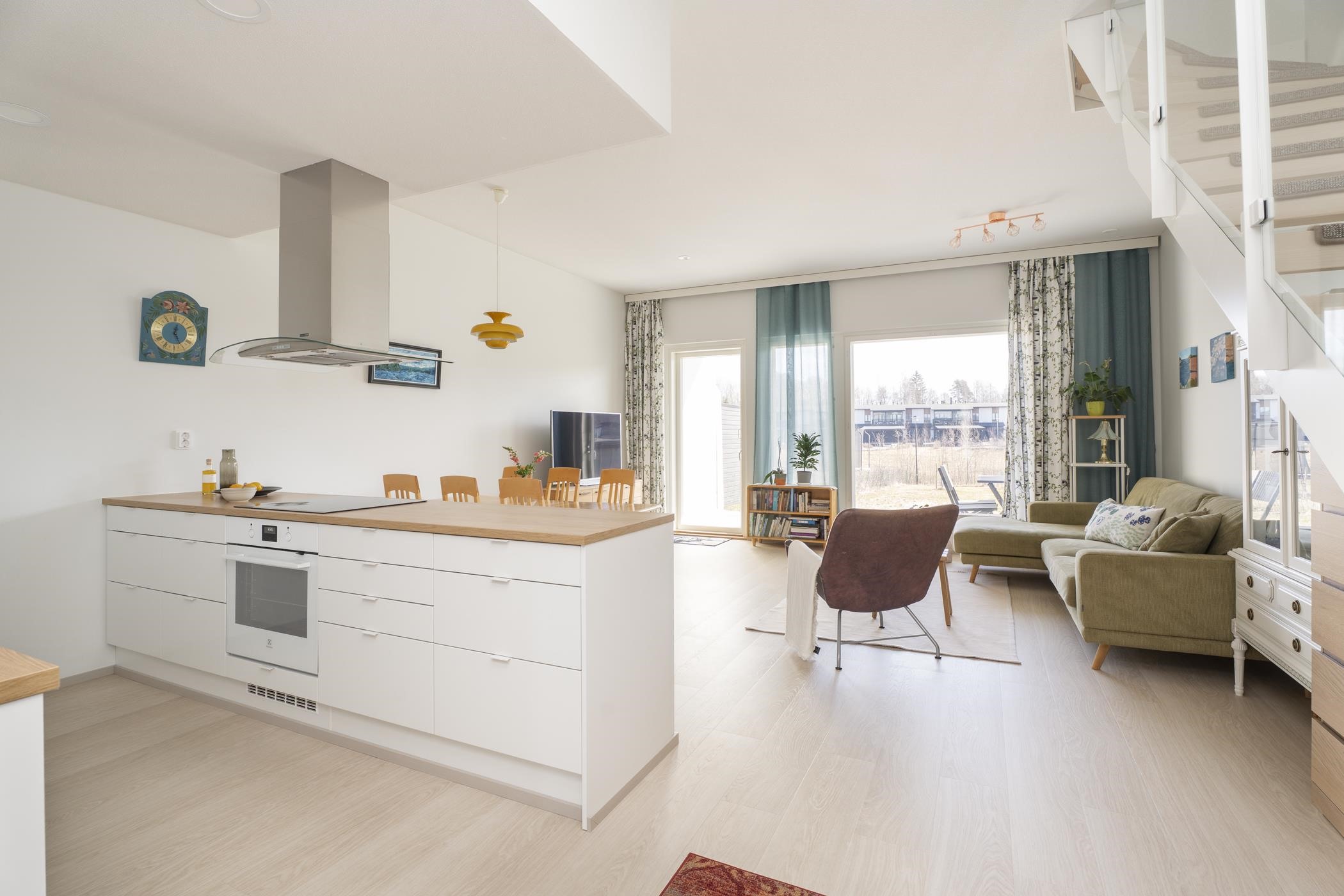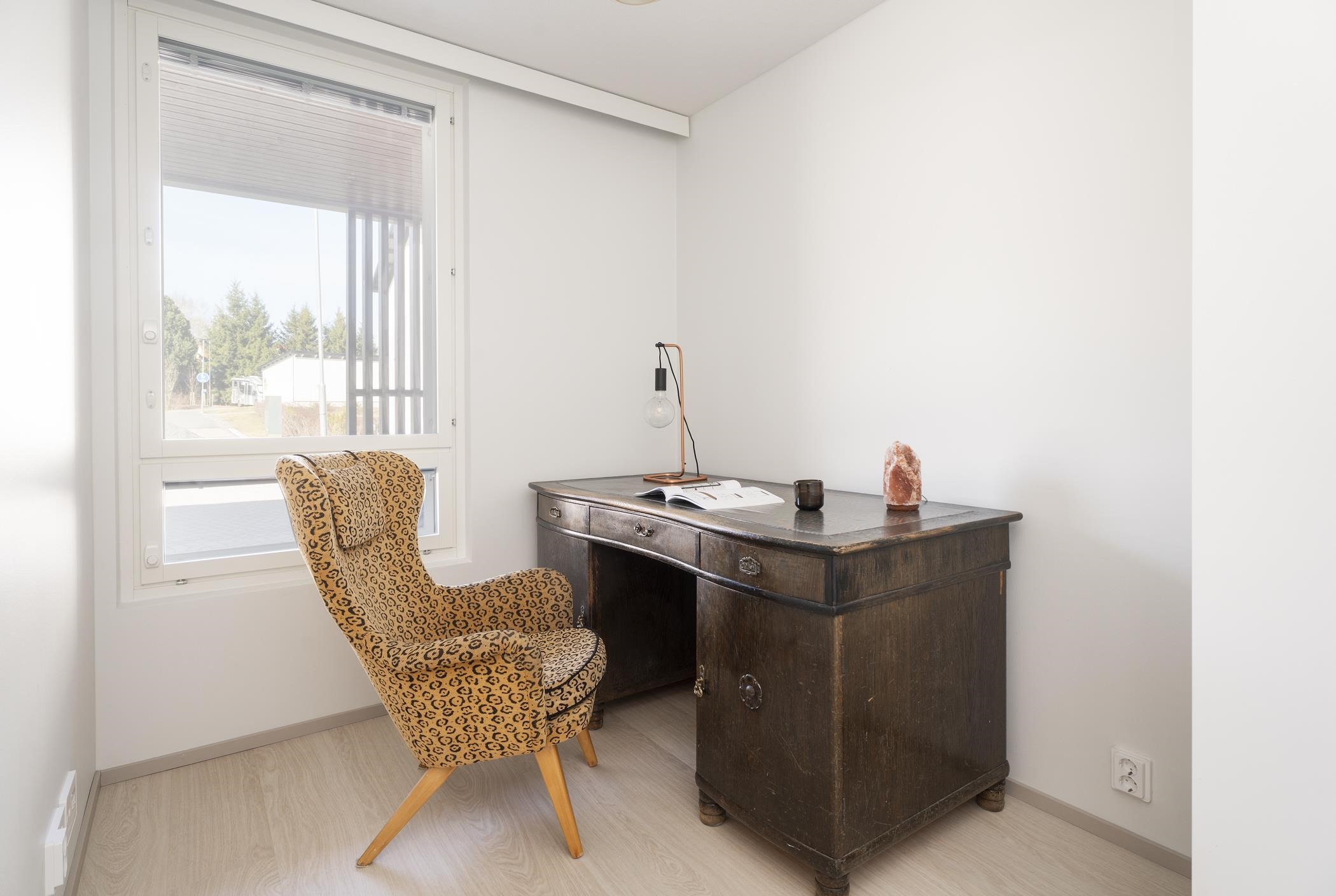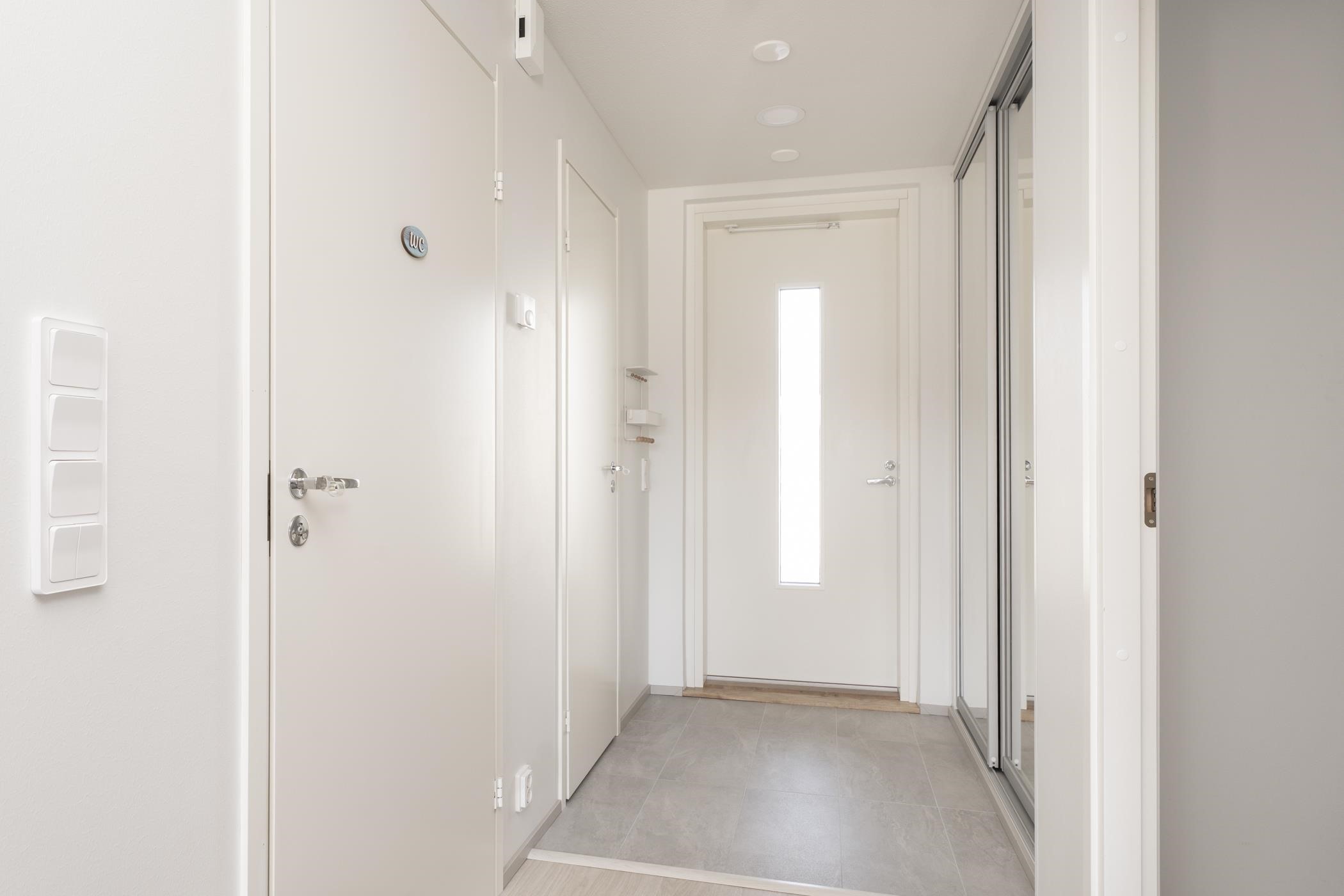 Kodin pohjaratkaisu on suunniteltu niin, että arki sujuu ja jokaiselle löytyy oma rauha. Sisääntulokerroksessa sinua odottaa avara olohuone/keittiö, jossa on helppo viihtyä ja viettää aikaa, makuuhuone joka on täydellinen myös työhuoneeksi ja erillinen wc. Ilmalämpöpumppu huolehtii kesäisin miellyttävästä viilennyksestä. Ja mikä parasta; olohuoneesta on käynti isolle takapihalle. Yläkerrassa on kolme makuuhuonetta, erillinen wc, kylpyhuone, sauna, sekä kodinhoitohuone, joka tekee pyykkihuollosta ja arjen askareista helppoa. Makuuhuoneesta on on käynti lasitetulle parvekkeelle, joka toimii lisähuoneena keväästä talveen. Säilytystilat, joista harvoin voi vain haaveilla, käytössäsi on ulkovarasto sisäänkäynnin vieressä, vaatehuone, reilusti kaapistoja, sekä oma lämmin varastohäkki väestönsuojassa. Kaikelle löytyy paikka, ja koti pysyy siistinä ilman jatkuvaa järjestelyä.
