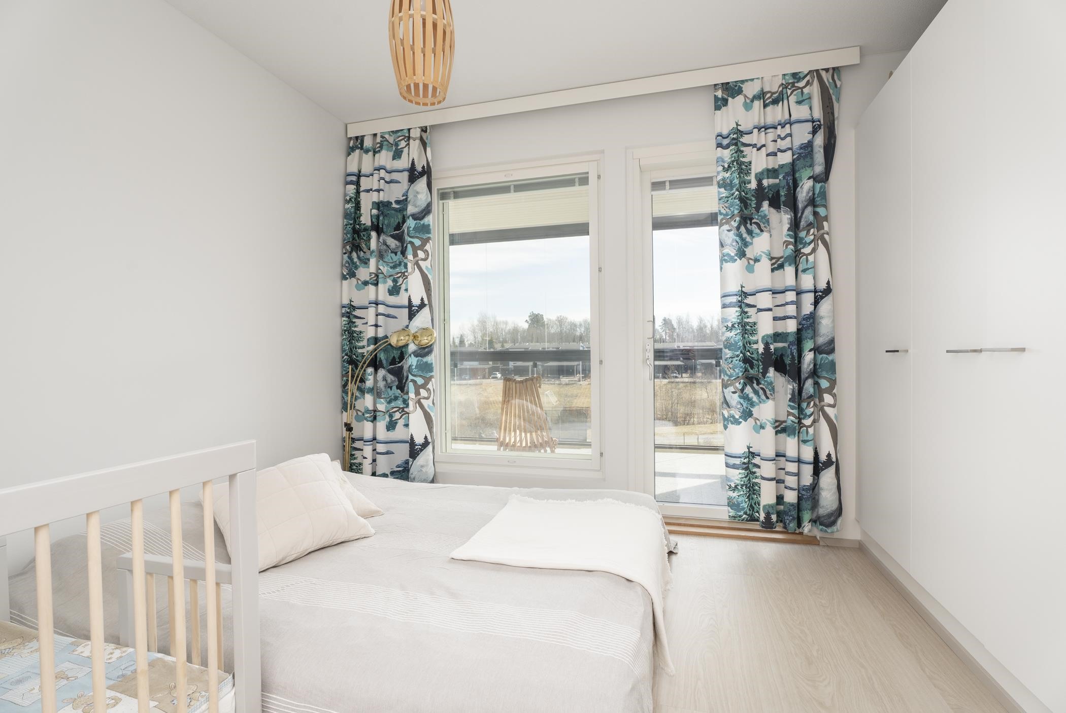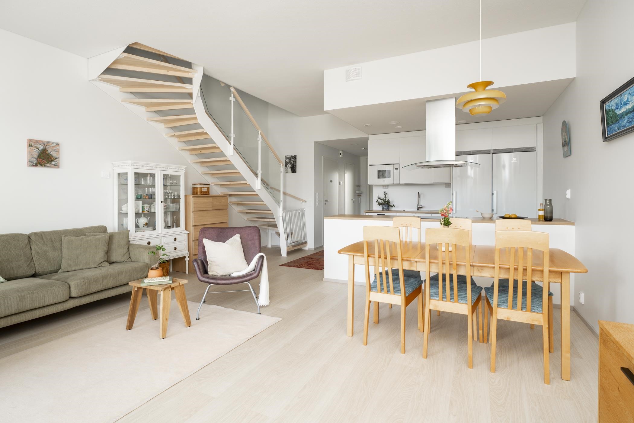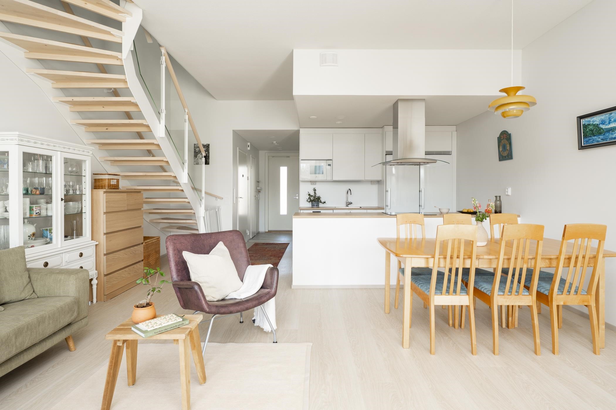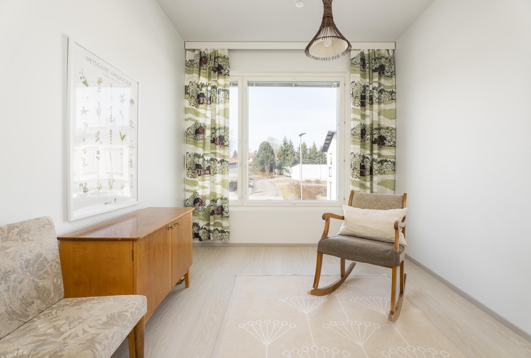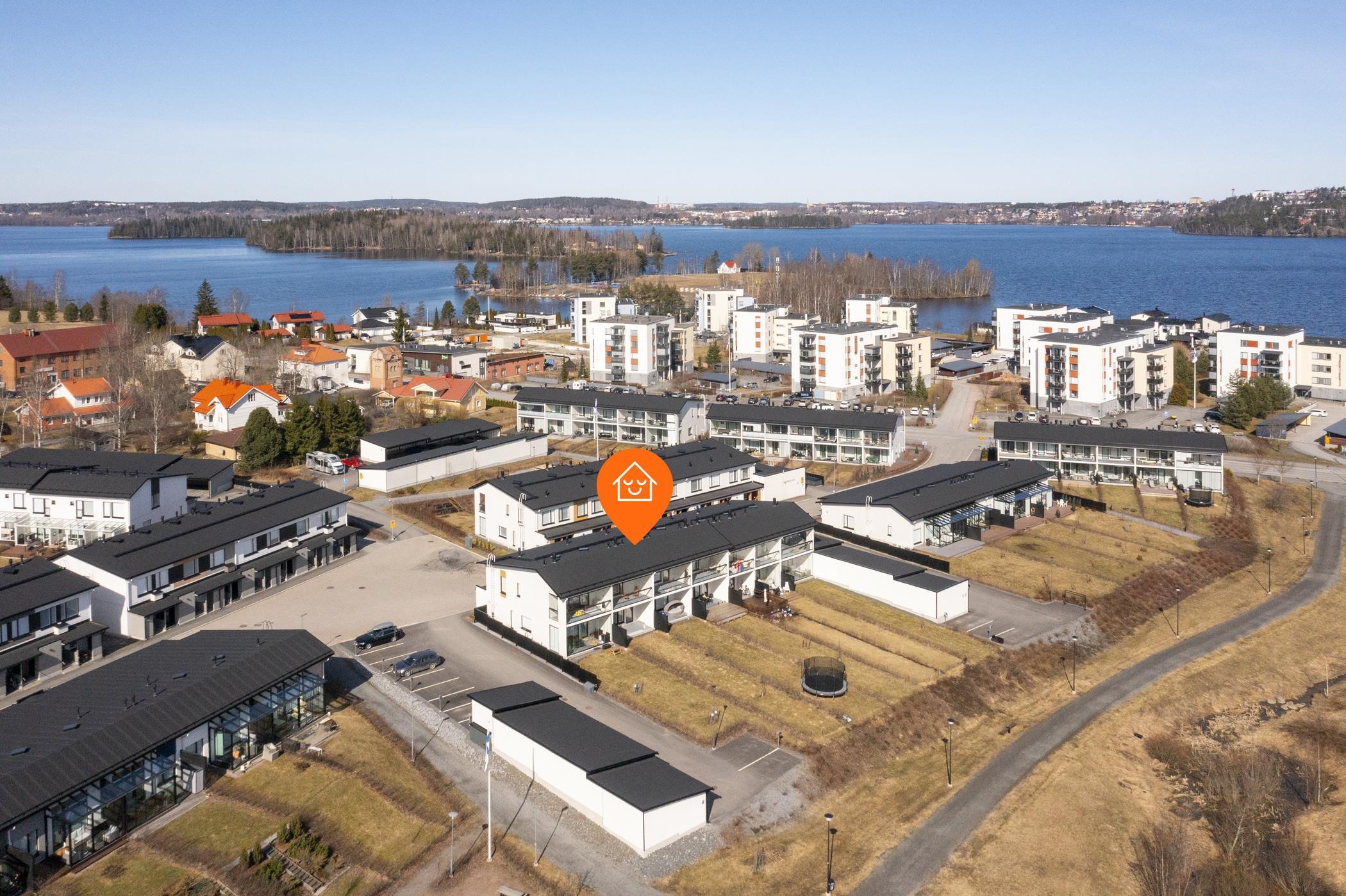 Kodin pohjaratkaisu on suunniteltu niin, että arki sujuu ja jokaiselle löytyy oma rauha. Sisääntulokerroksessa sinua odottaa avara olohuone/keittiö, jossa on helppo viihtyä ja viettää aikaa, makuuhuone joka on täydellinen myös työhuoneeksi ja erillinen wc. Ilmalämpöpumppu huolehtii kesäisin miellyttävästä viilennyksestä. Ja mikä parasta; olohuoneesta on käynti isolle takapihalle. Yläkerrassa on kolme makuuhuonetta, erillinen wc, kylpyhuone, sauna, sekä kodinhoitohuone, joka tekee pyykkihuollosta ja arjen askareista helppoa. Makuuhuoneesta on on käynti lasitetulle parvekkeelle, joka toimii lisähuoneena keväästä talveen. Säilytystilat, joista harvoin voi vain haaveilla, käytössäsi on ulkovarasto sisäänkäynnin vieressä, vaatehuone, reilusti kaapistoja, sekä oma lämmin varastohäkki väestönsuojassa. Kaikelle löytyy paikka, ja koti pysyy siistinä ilman jatkuvaa järjestelyä.