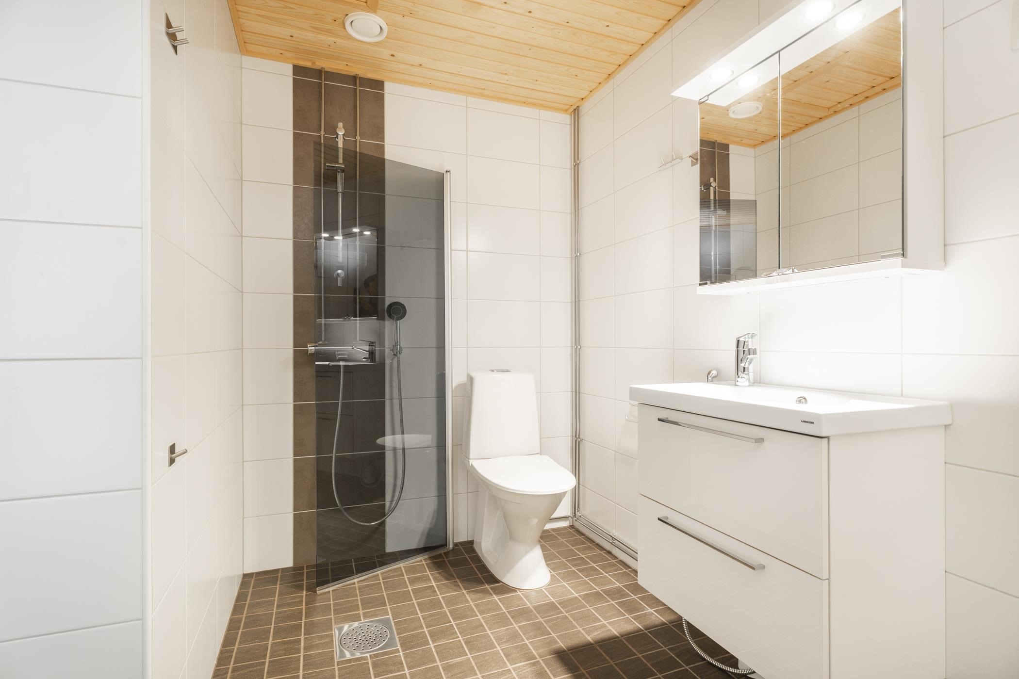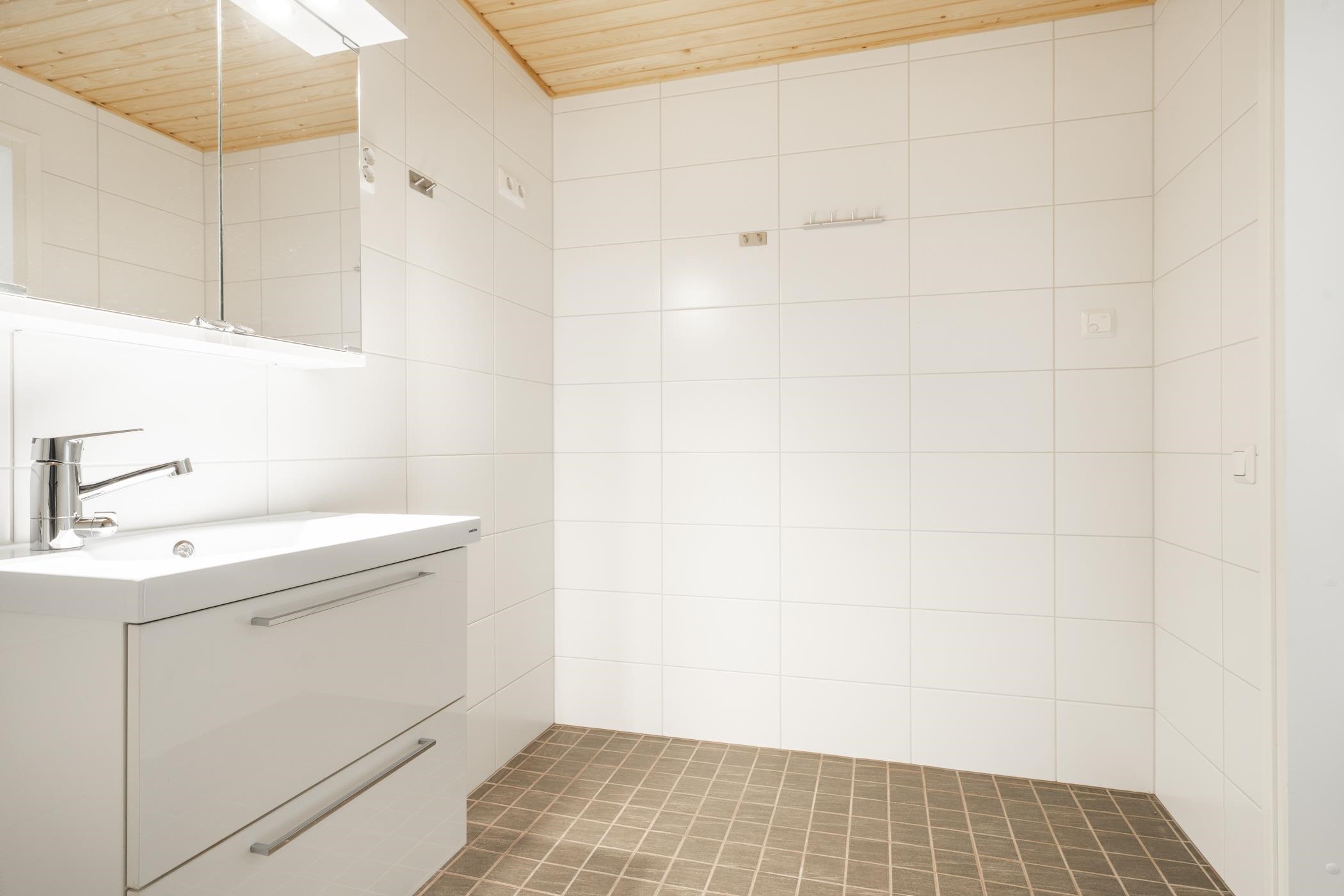 - Kylpyhuoneessa on suihku, suihkuseinä, peilikaappi, allaskaappi, pesukoneliitäntä.