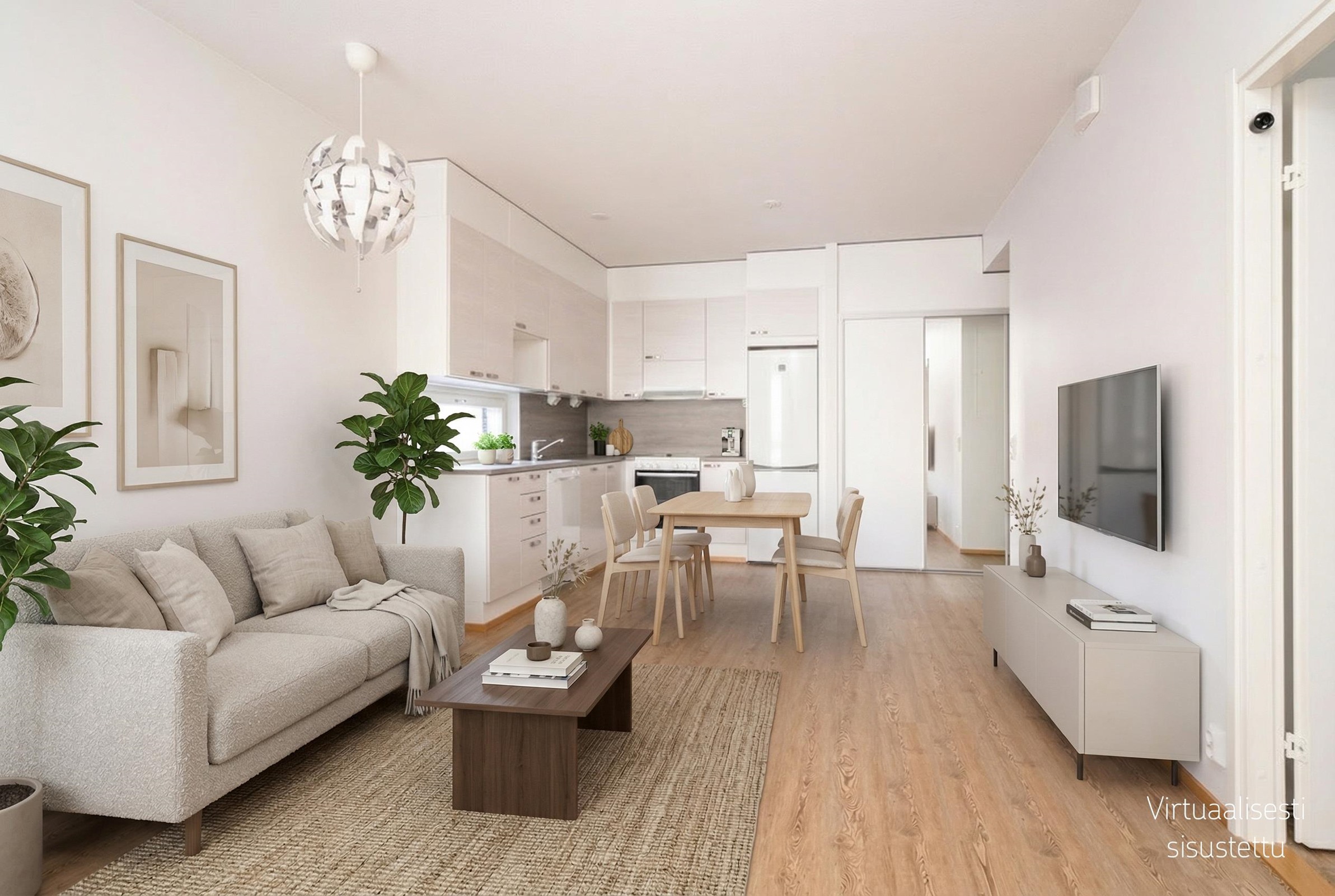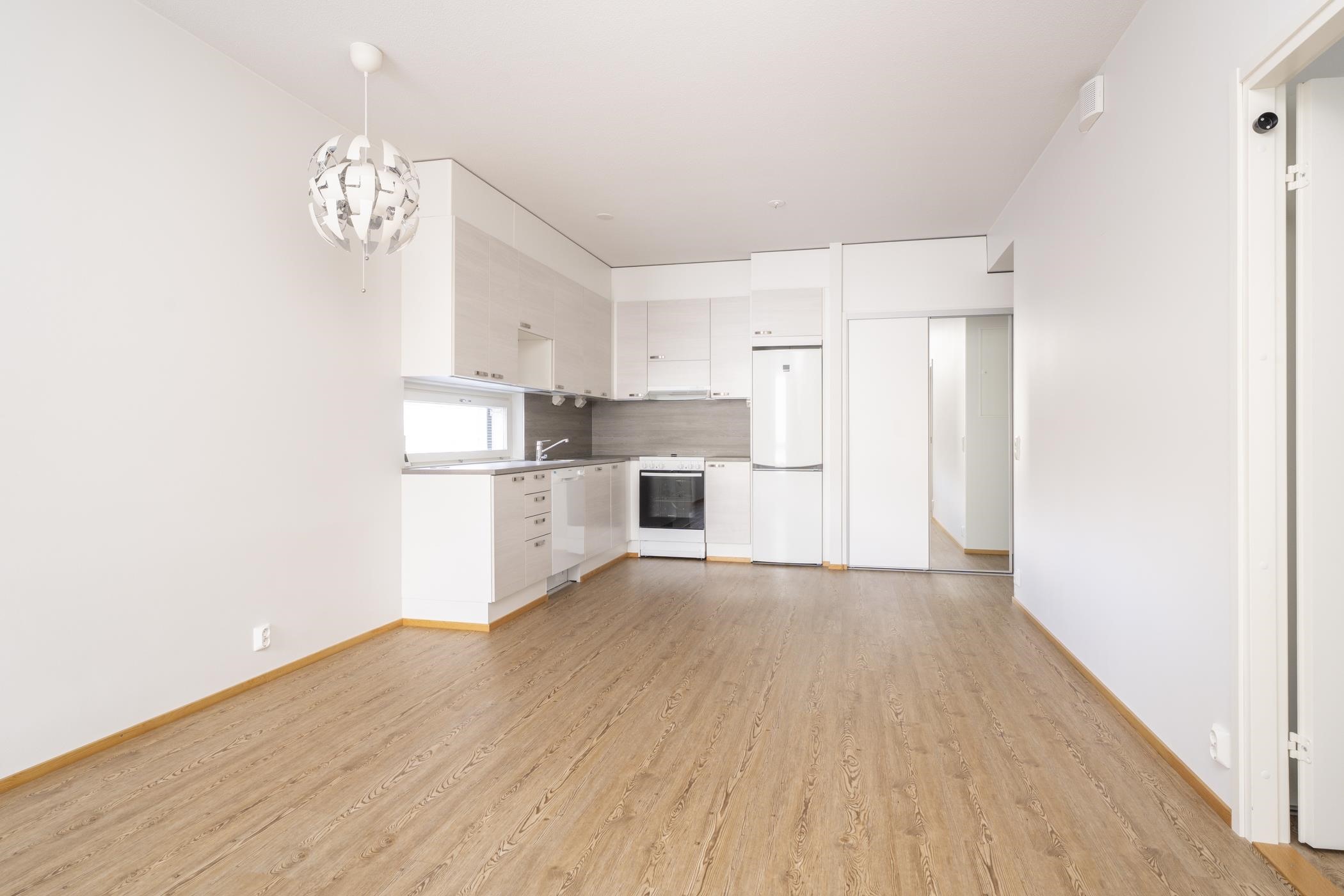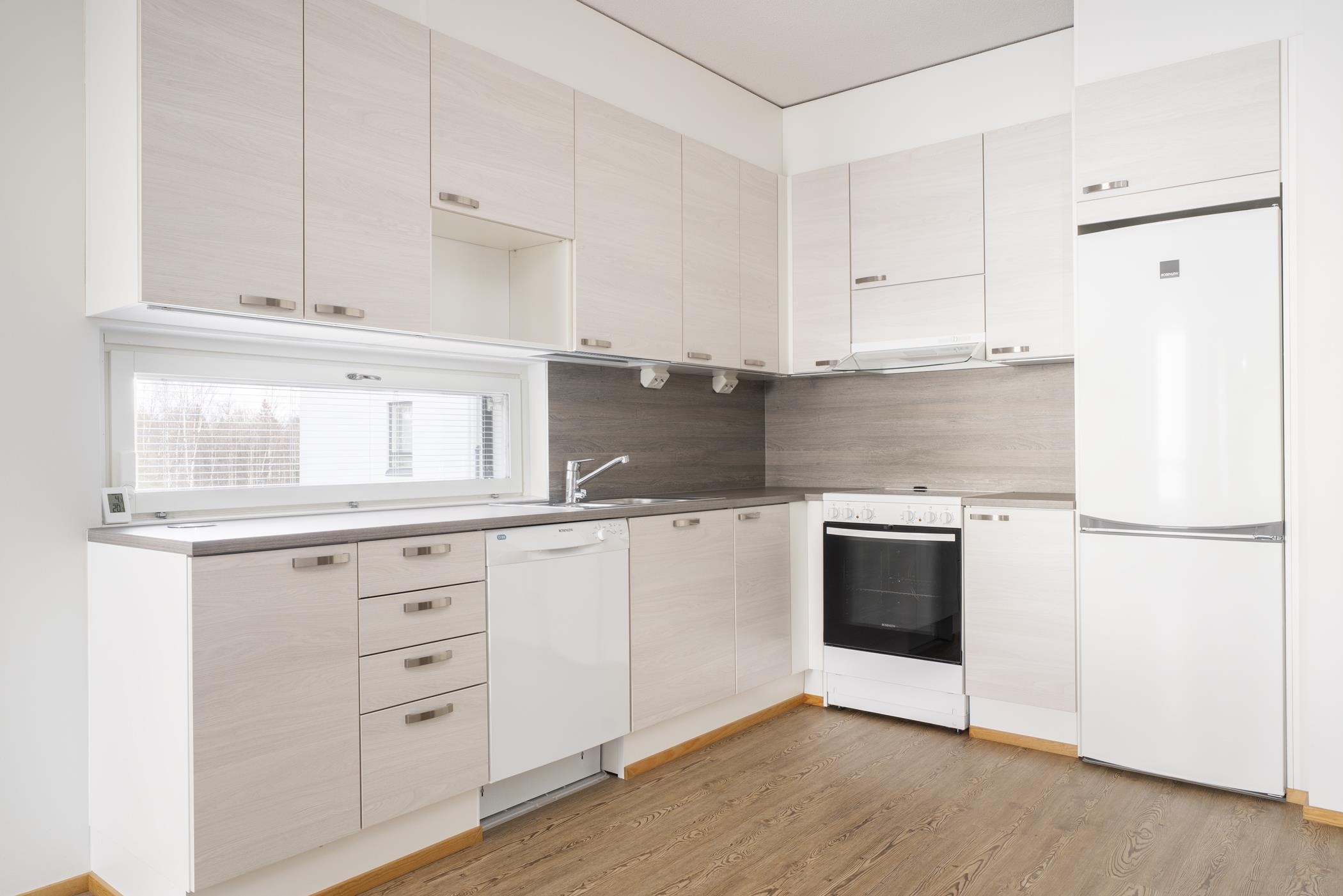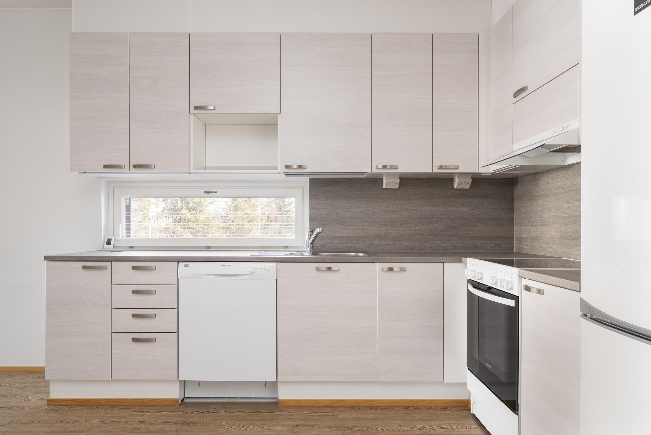 - Keittiön varusteluun kuuluu jääkaappipakastin, lattialiesi, liesituuletin, astianpesukone ja kiinteät valaisimet.